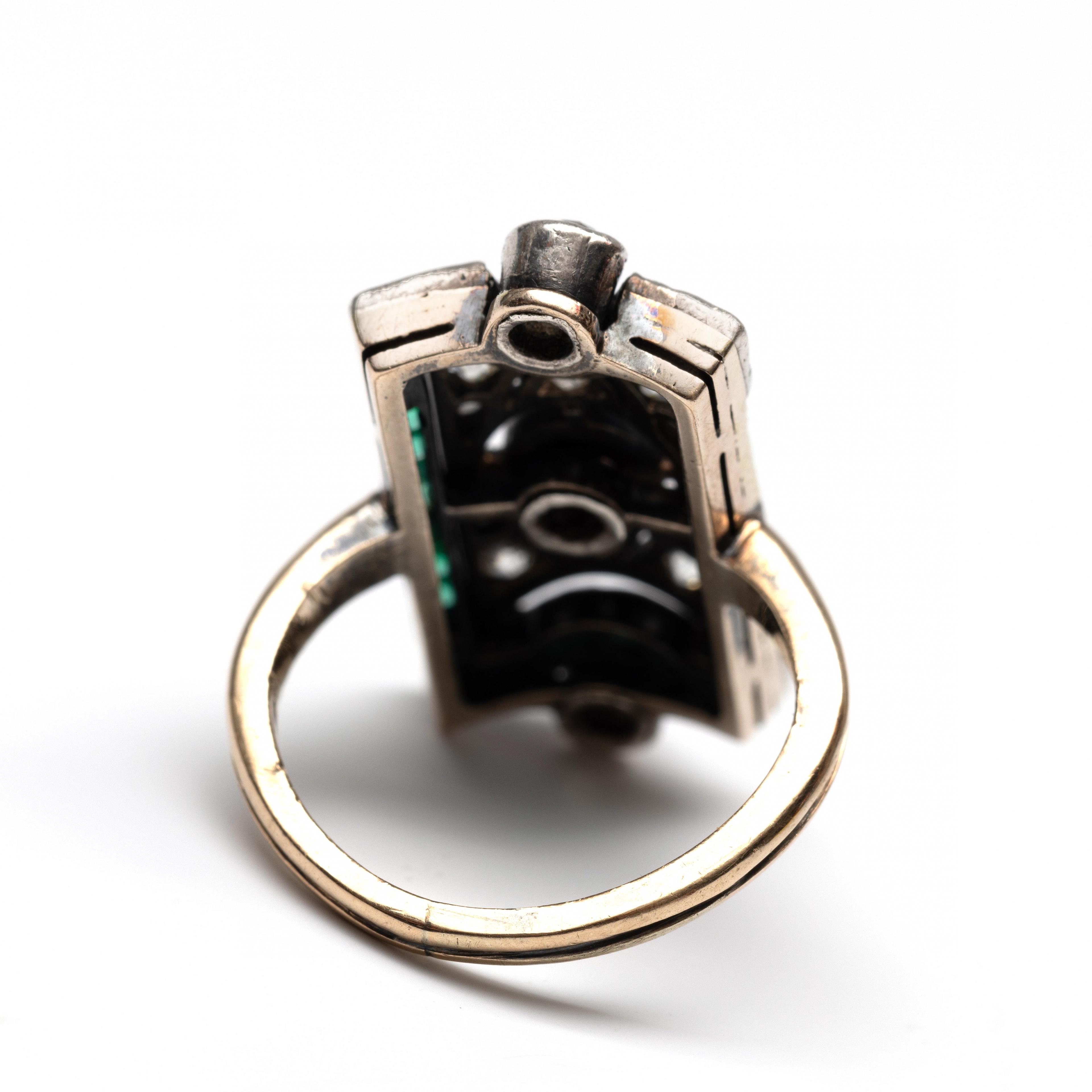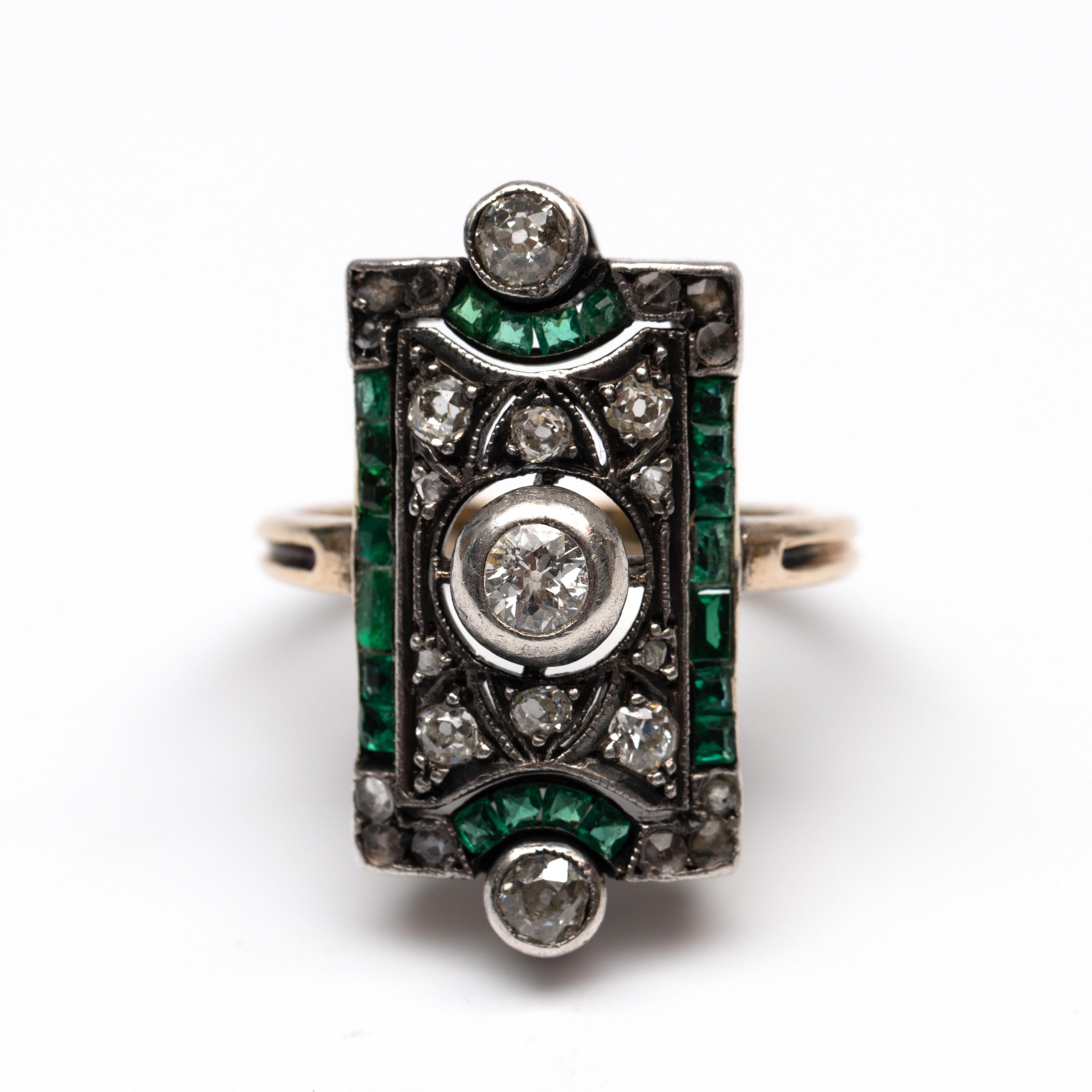 14 k. Gold and silver plaque ring, Art Deco. The top with a geometric design and set with old brilliant-cut and rose-cut diamonds weighing approximately 0.55 ct, and calibrated emerald.