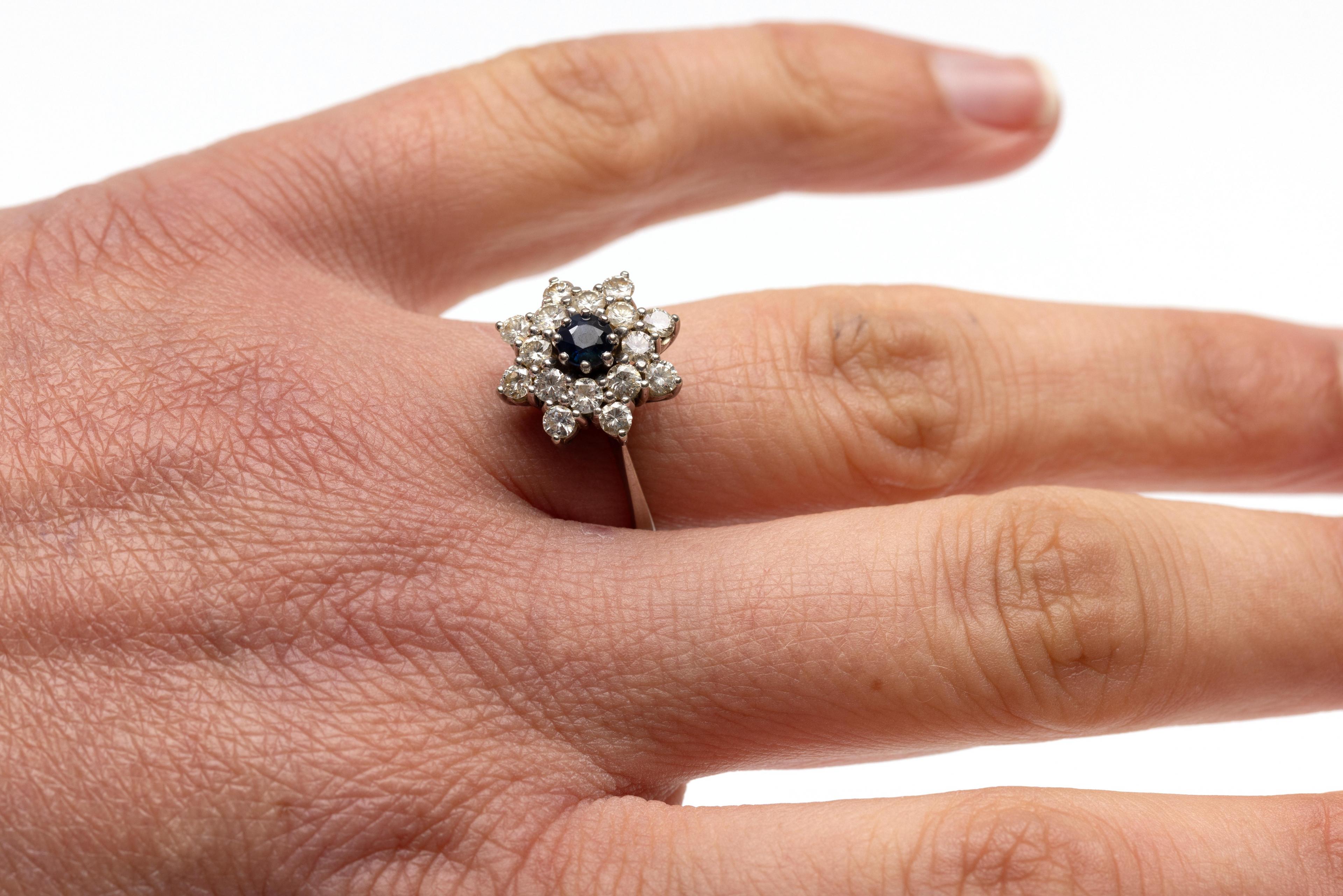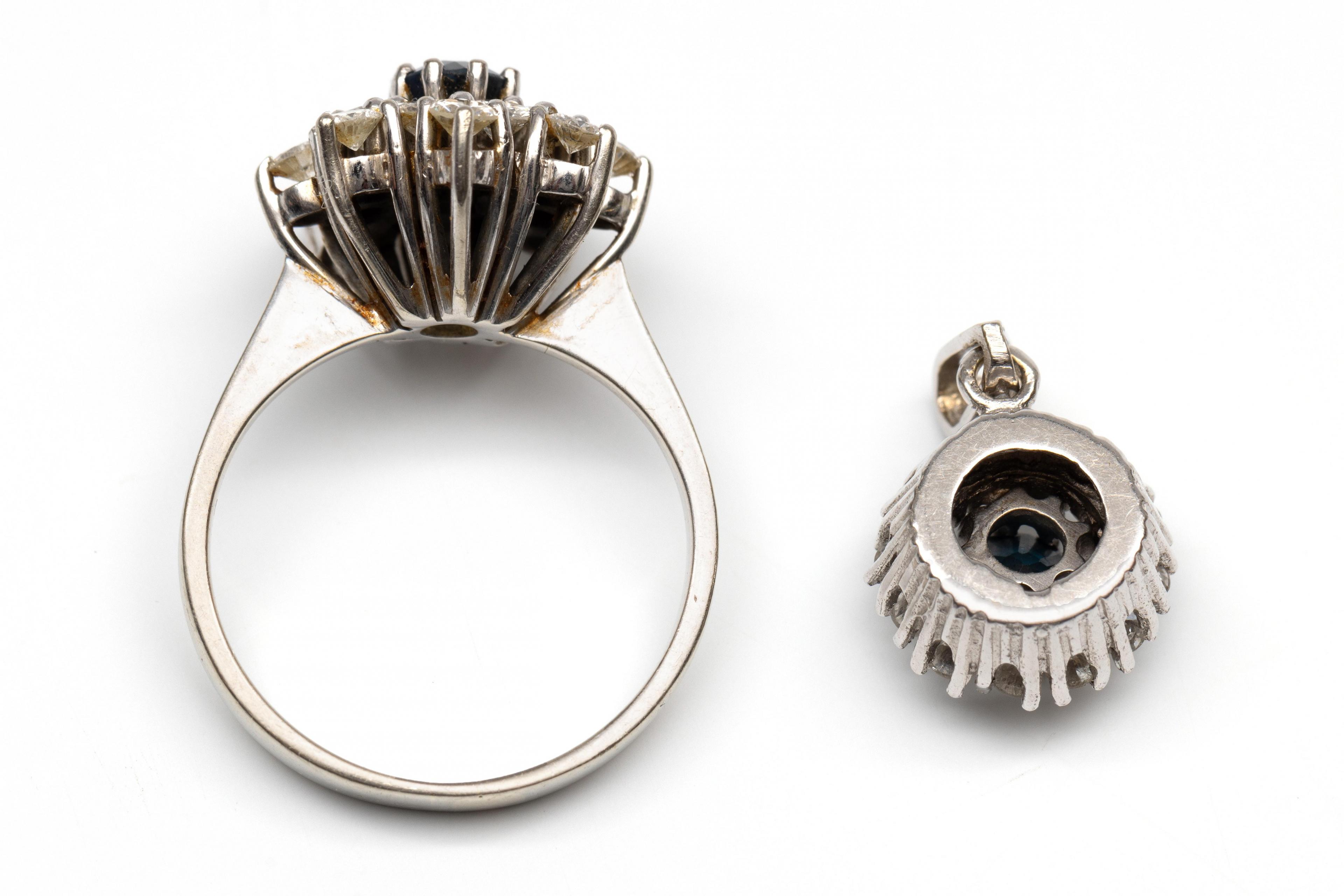 18 kt. White gold cluster ring. Centrally set with a dark blue round faceted sapphire (diameter 4 mm), in a double entourage of brilliant-cut diamond with a total weight of approximately 0.08 ct. Herewith a 14 kt. white gold pendant set with a dark blue round faceted sapphire (diameter 5 mm), surrounded by a brilliant-cut diamond with a total weight of approximately 0.35 ct.