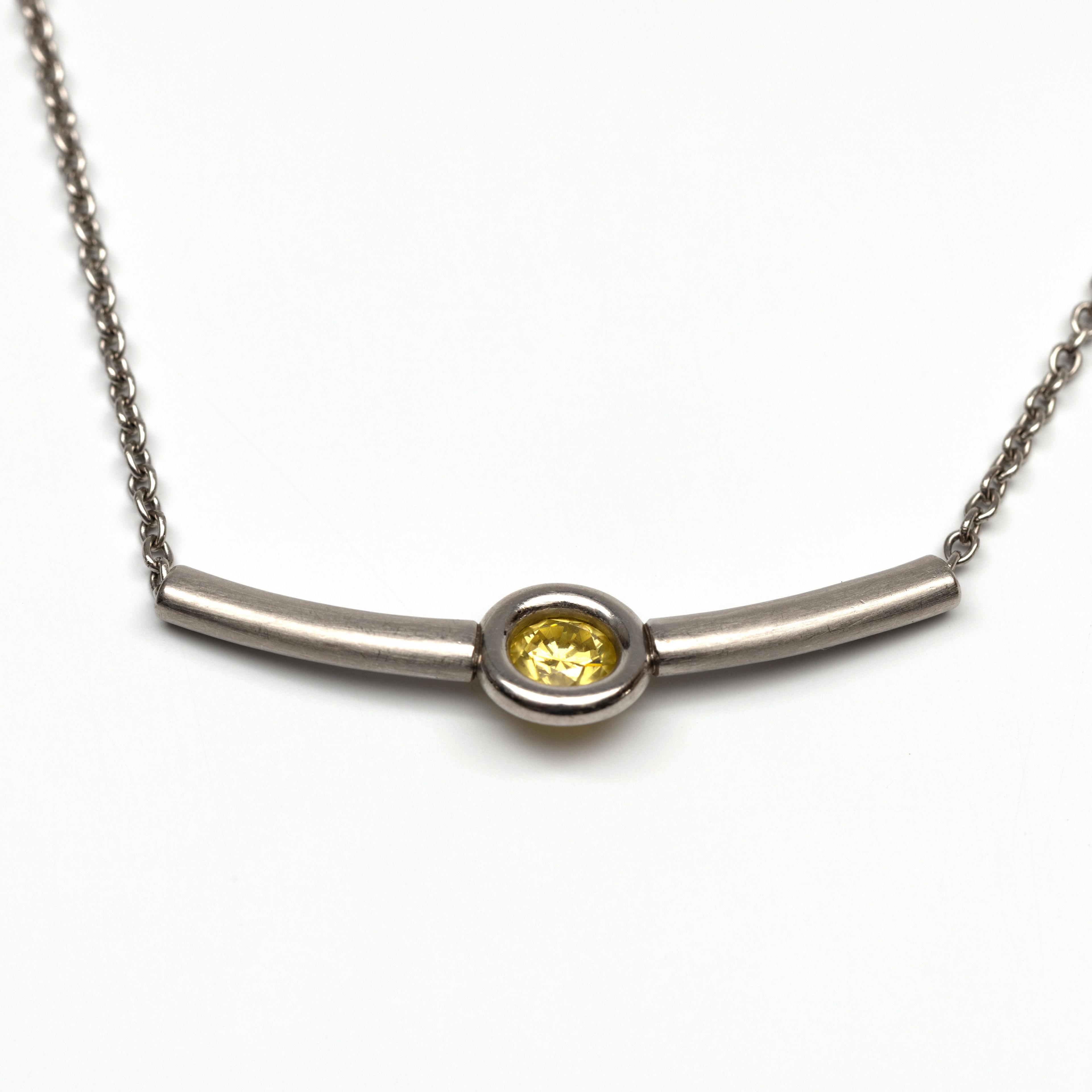 Platinum cable link necklace, the front with a tubular pendant centrally set with a yellow brilliant-cut diamond of approx. 0.35 ct.