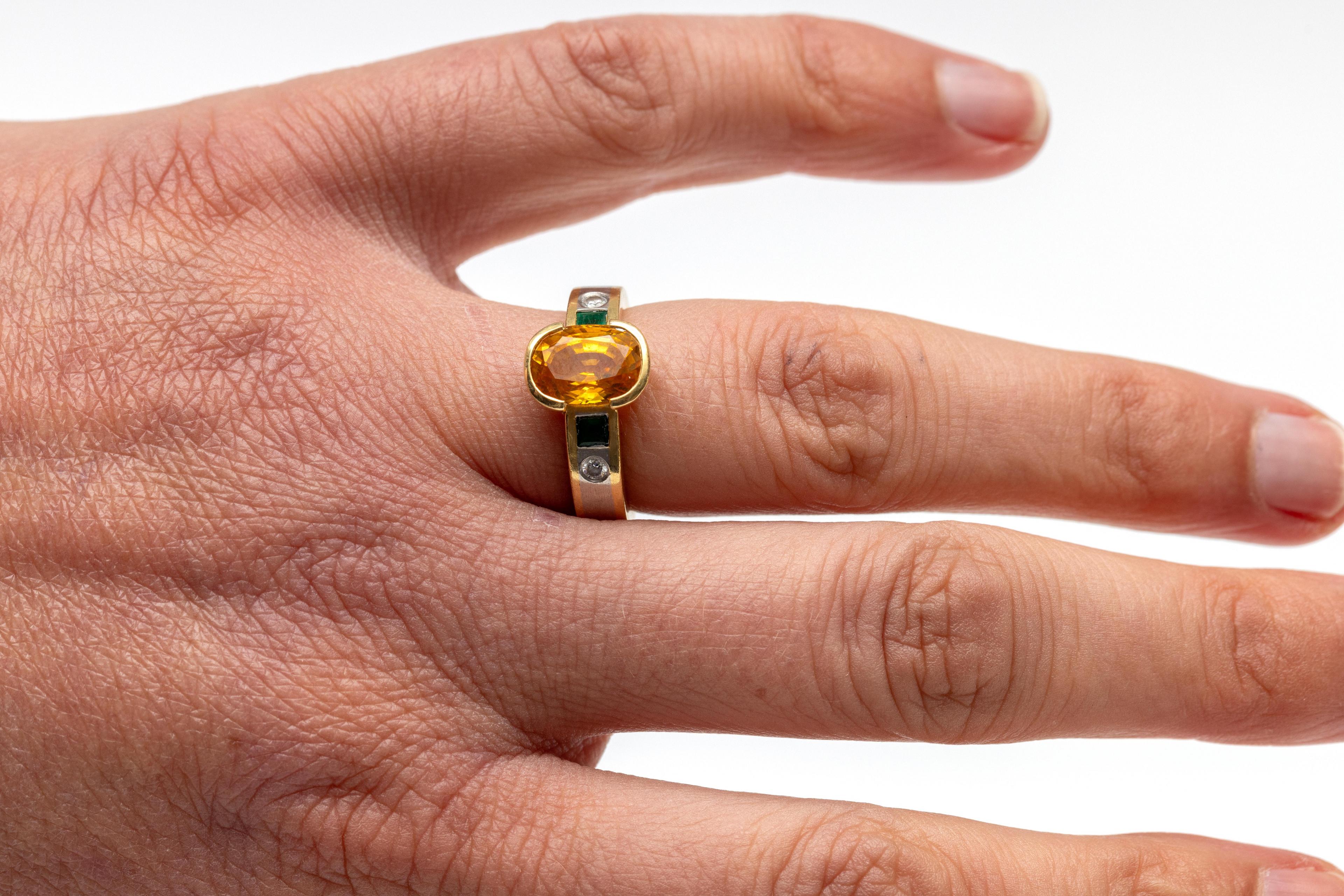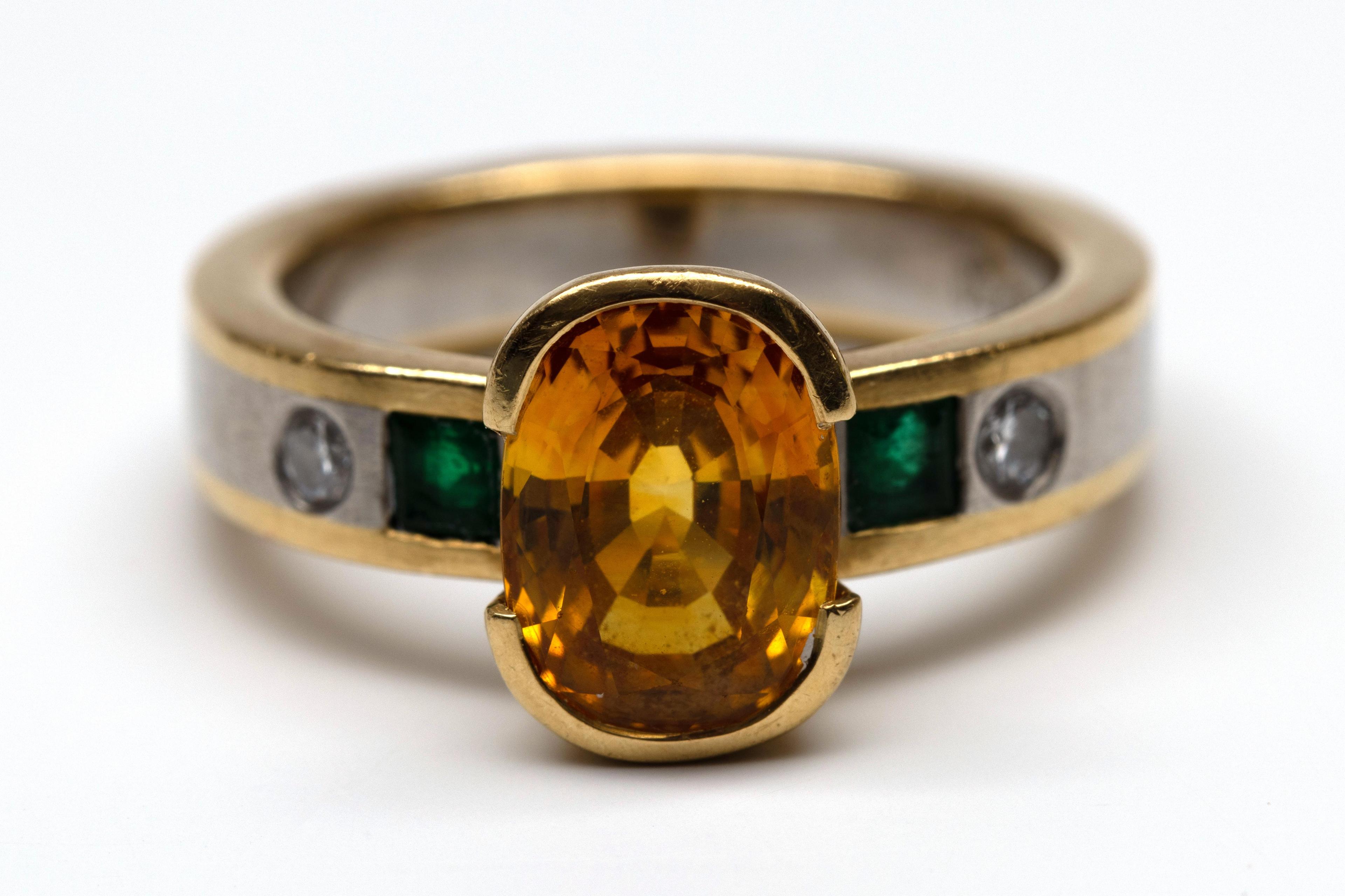 Hans Schindler, Soest, Germany, platinum and 18 k. gold ring. Centrally set with an oval faceted yellow sapphire (approx. 9 x 7 mm), flanked on either side by a square-cut emerald and a brilliant-cut diamond (approx. 0.05 ct. each).