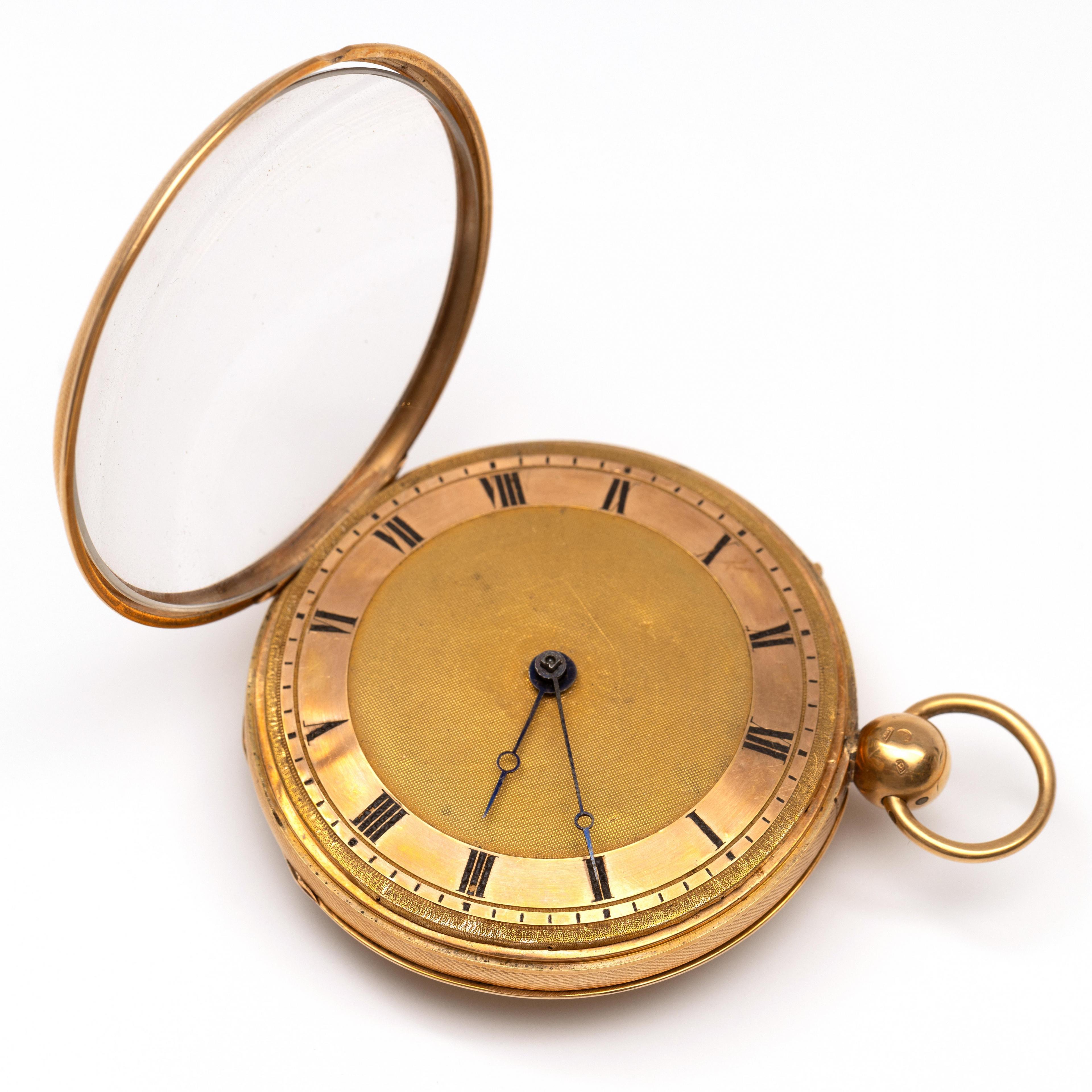 Gold pocket watch, early 19th century. With striking mechanism. The dial is gold-coloured with Roman numerals, and the center features a grid engraving.