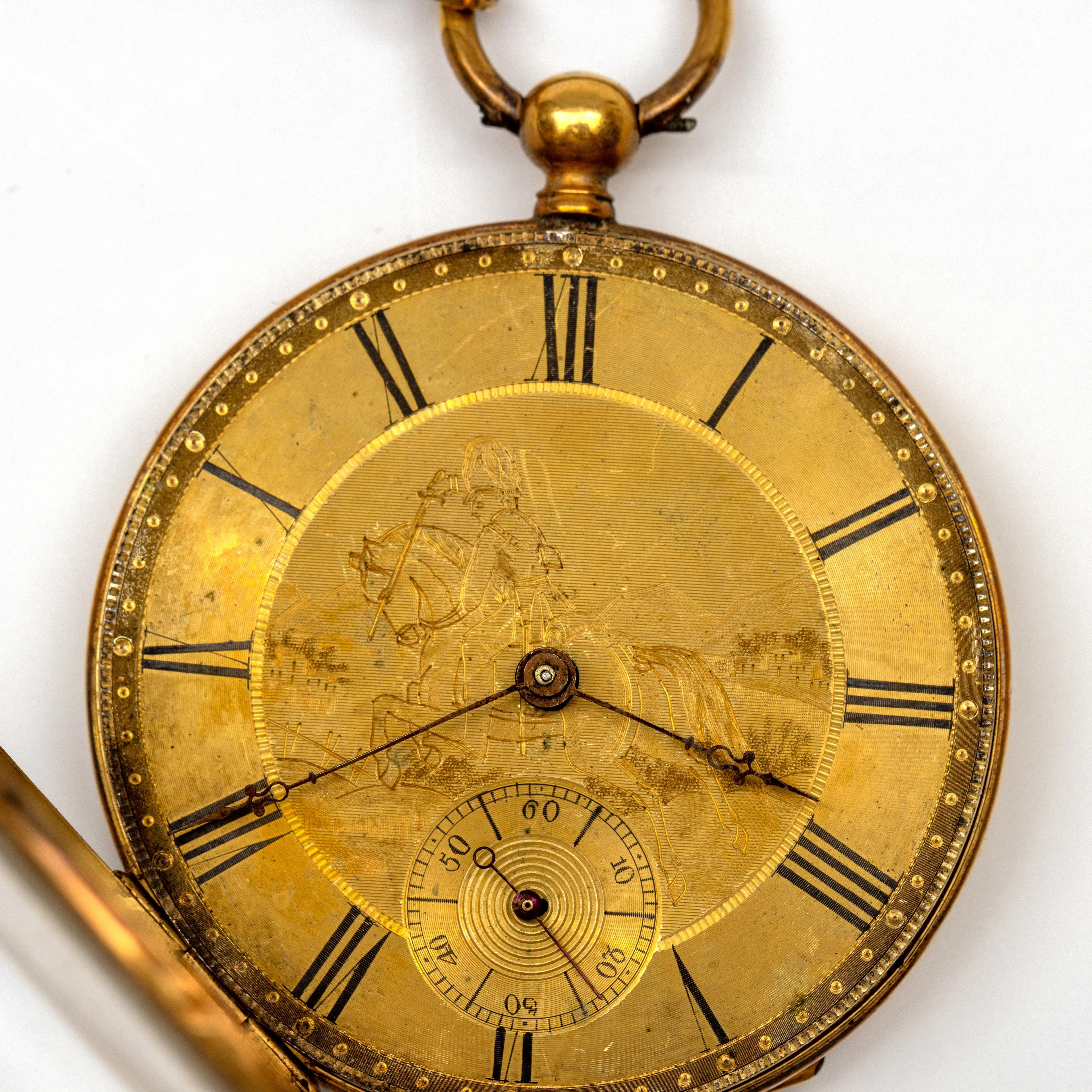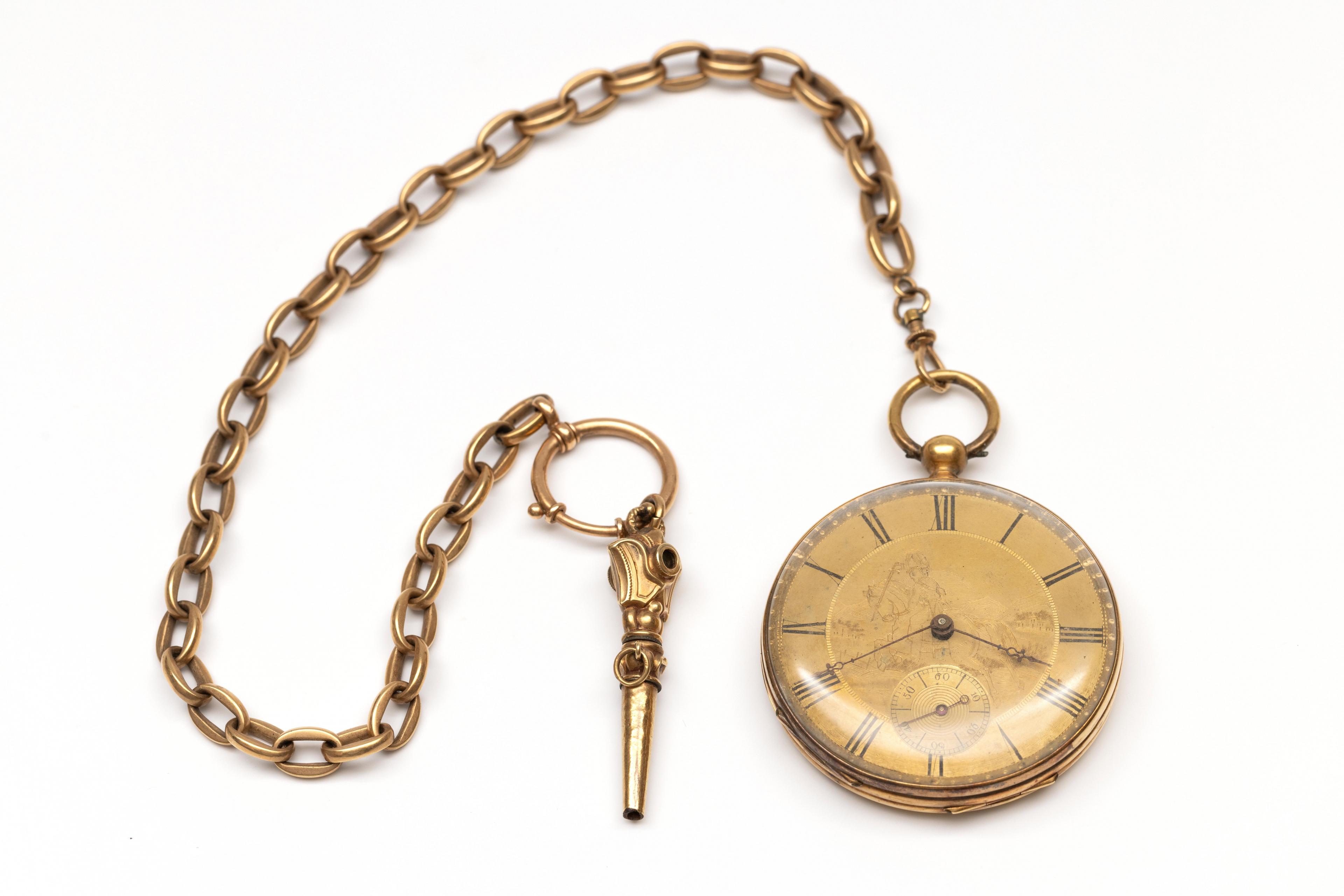 18 k. Gold key watch, 19th century. The dial gold-coloured with Roman numerals and second indicator at six. The dial decorated with an engraving of a dragoon. The back has a cartouche framed by a garter. With a base-metal inner lid. Attached to a 14 k. gold watch chain with a watch key with a Stanhope depicting the Pantheon in Paris.