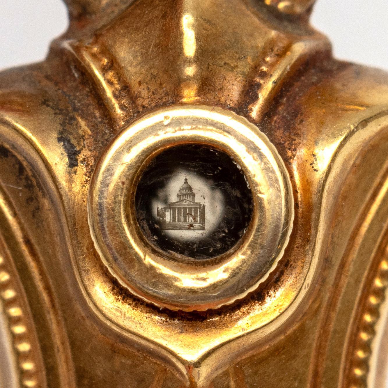 De wijzerplaat goudkleurig met Romeinse cijfers een seconde aanduiding op de zes. De plaat gedecoreerd met gravure van een dragonder . De achterzijde met cartouche omlijst met riem. Met onedele binnendeksel. Aan een 14 kt. gouden horlogeketting waaraan een horlogesleutel met stanhope kijker met voorstelling van het Pantheon in Parijs.