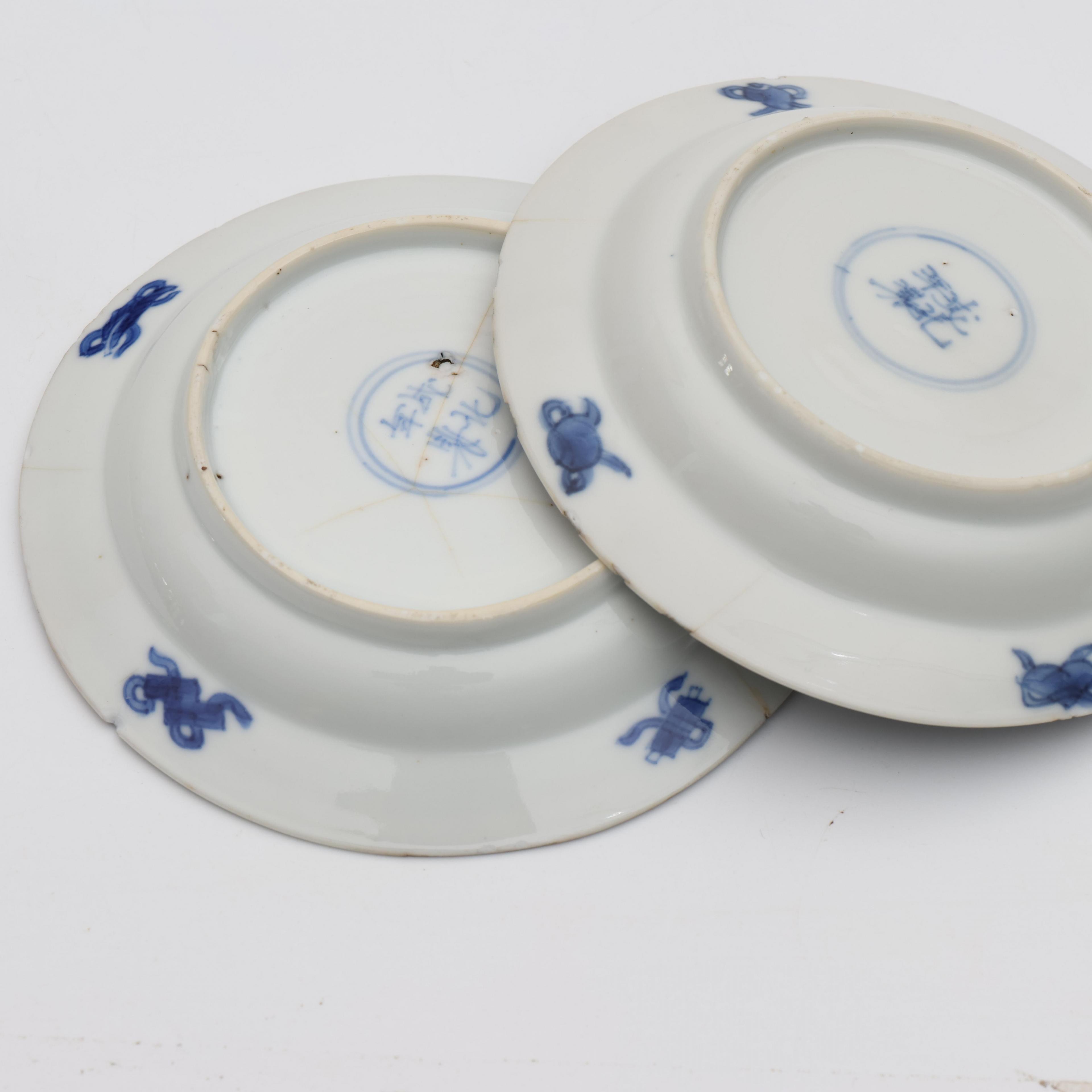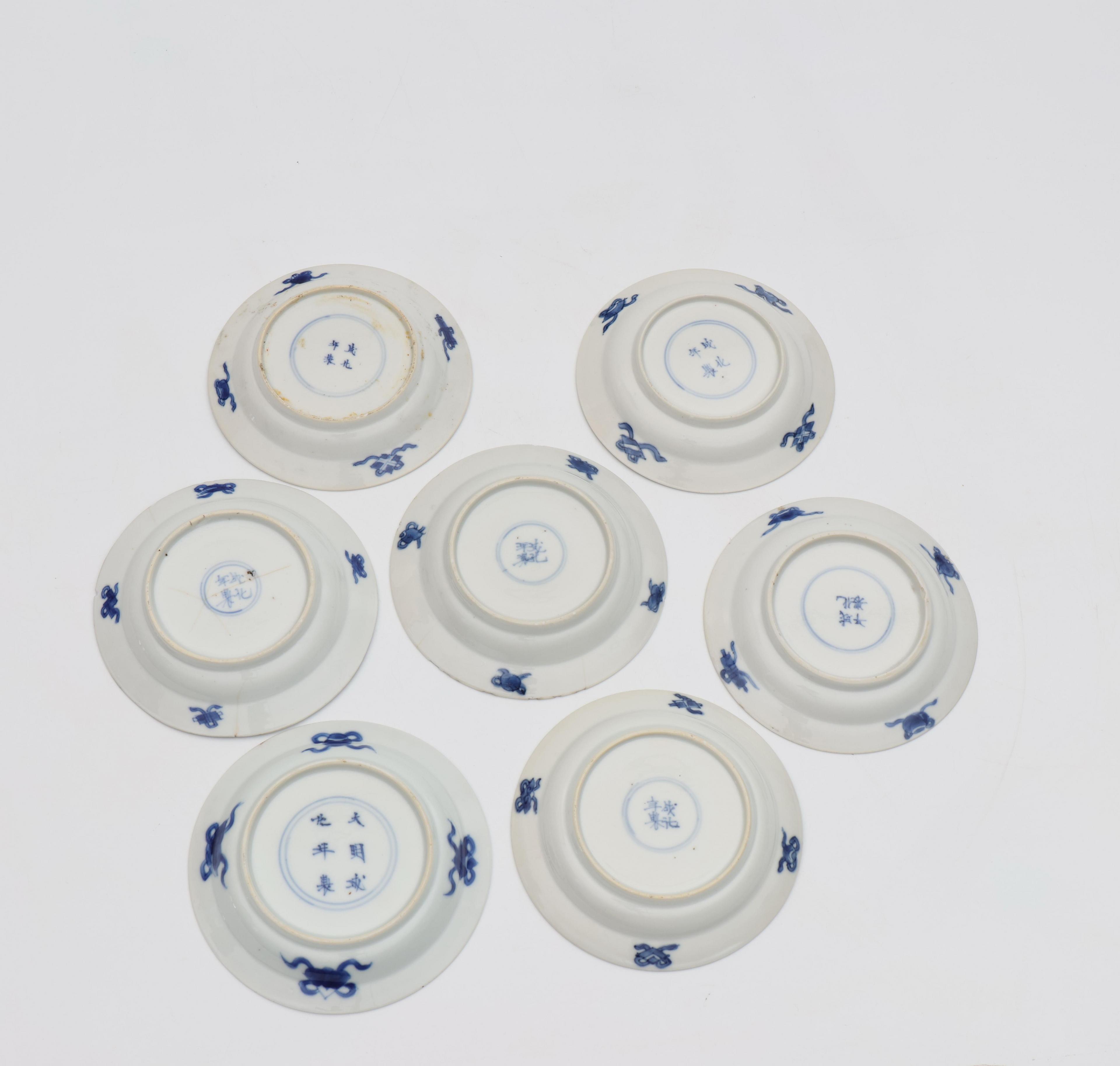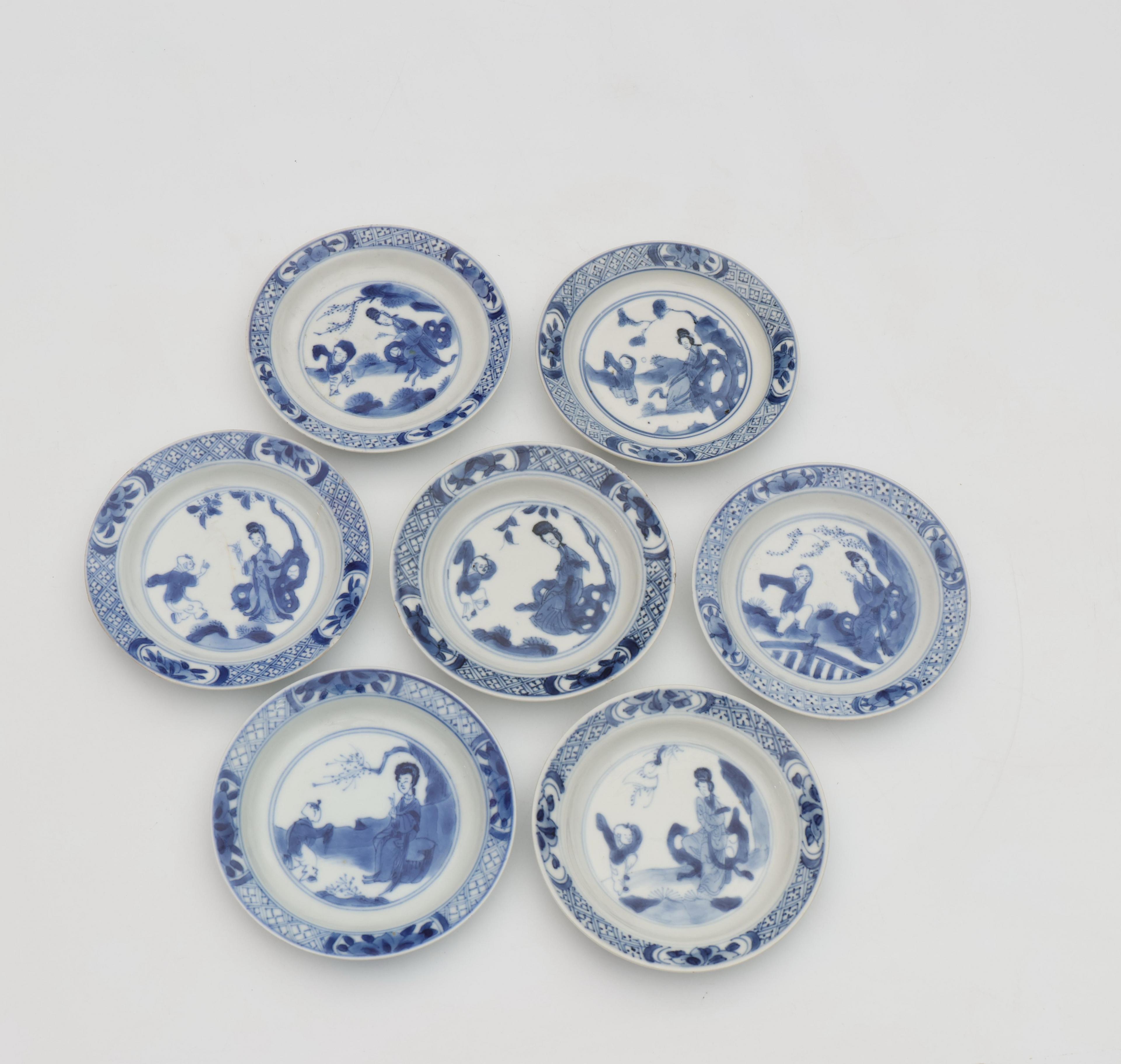 China, a set of seven small blue and white porcelain saucers, Kangxi period, (1662-1722),