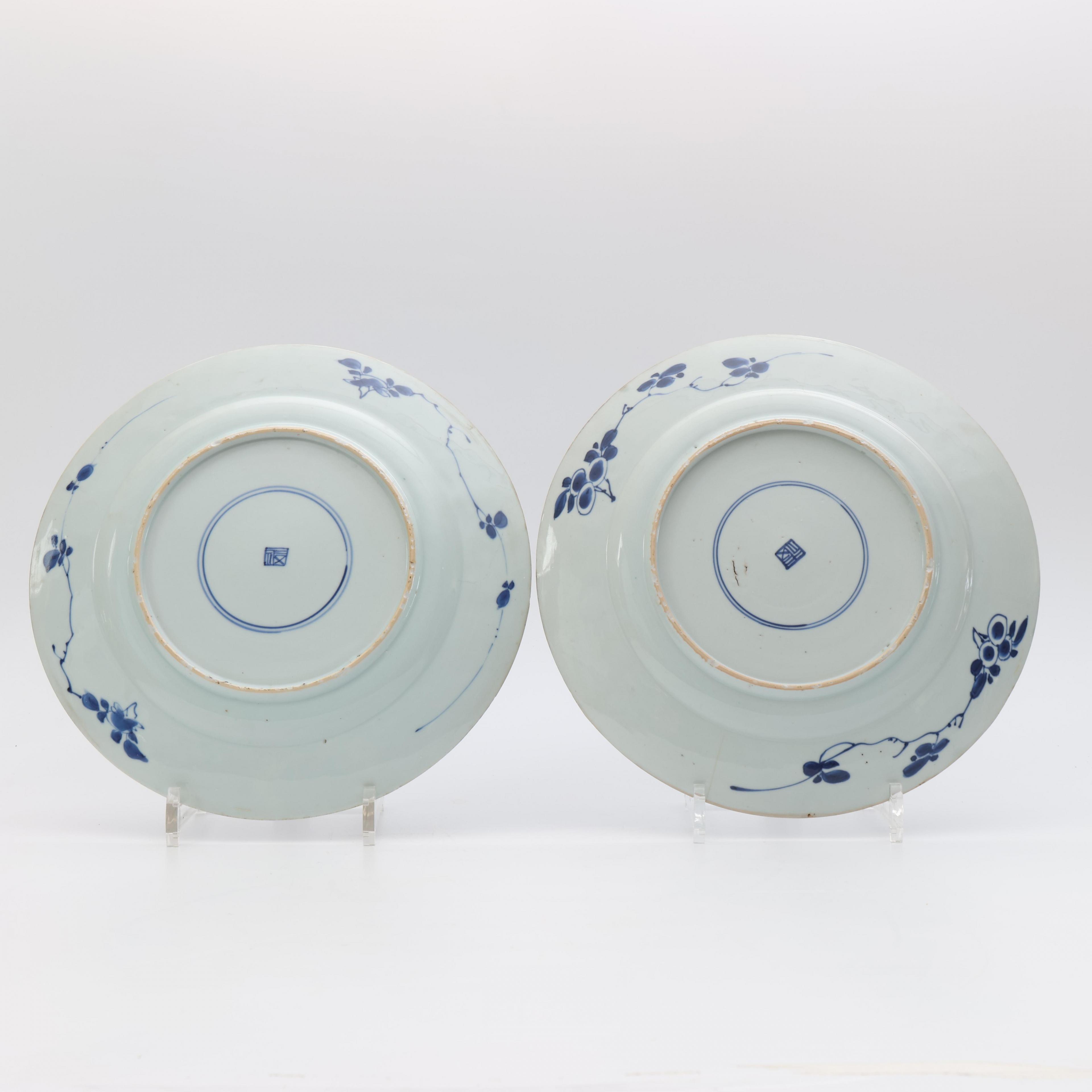 each decorated in various shades of blue with a pair of pheasants perched on rockwork amidst large peony and chrysanthemum blooms, bordered by cartouches of Buddha's hand fruit and pomegranate on a dense composite scroll, cell-pattern and flower-head ground (one with a small firing crack to the rim resulting in a faint hairline visible to the reverse)