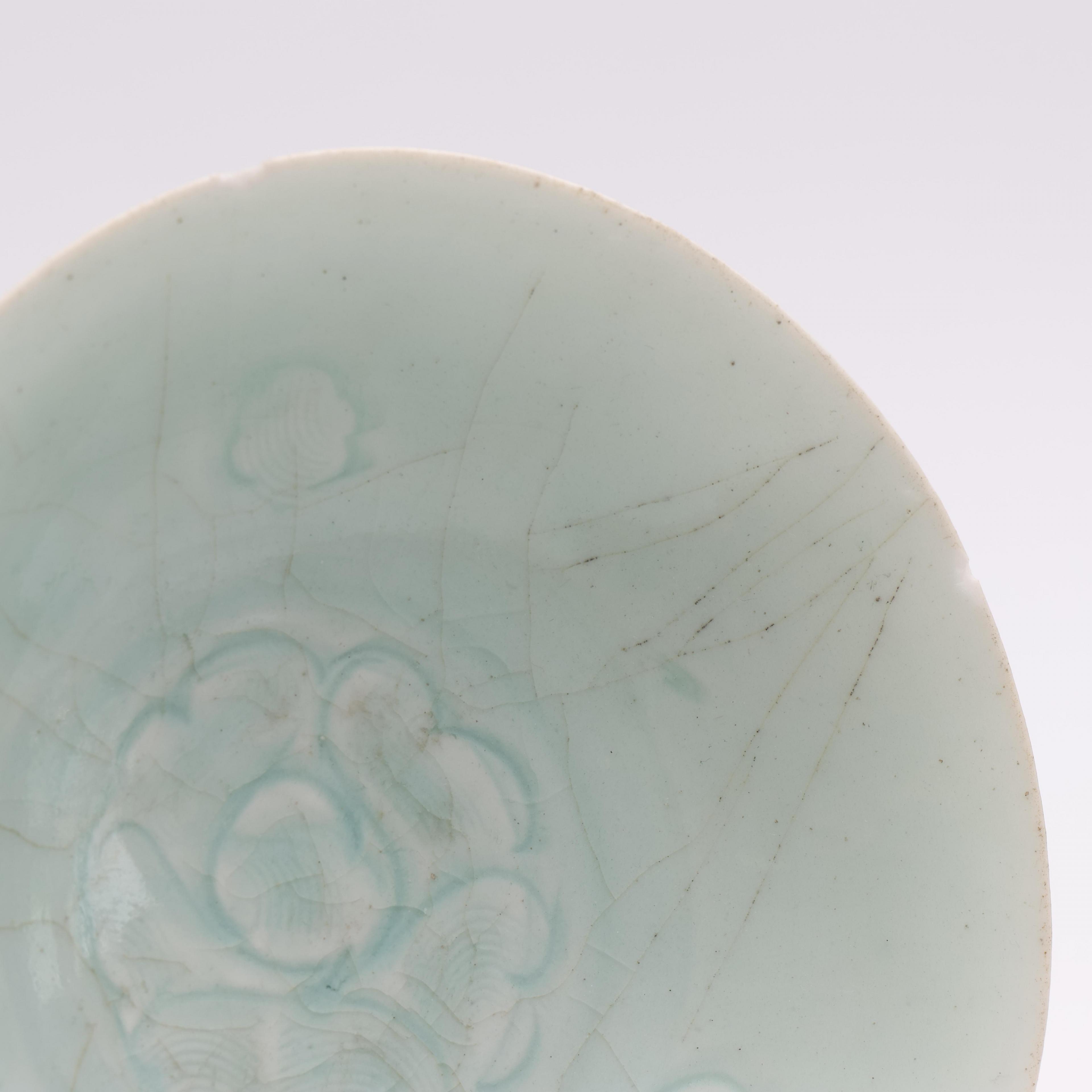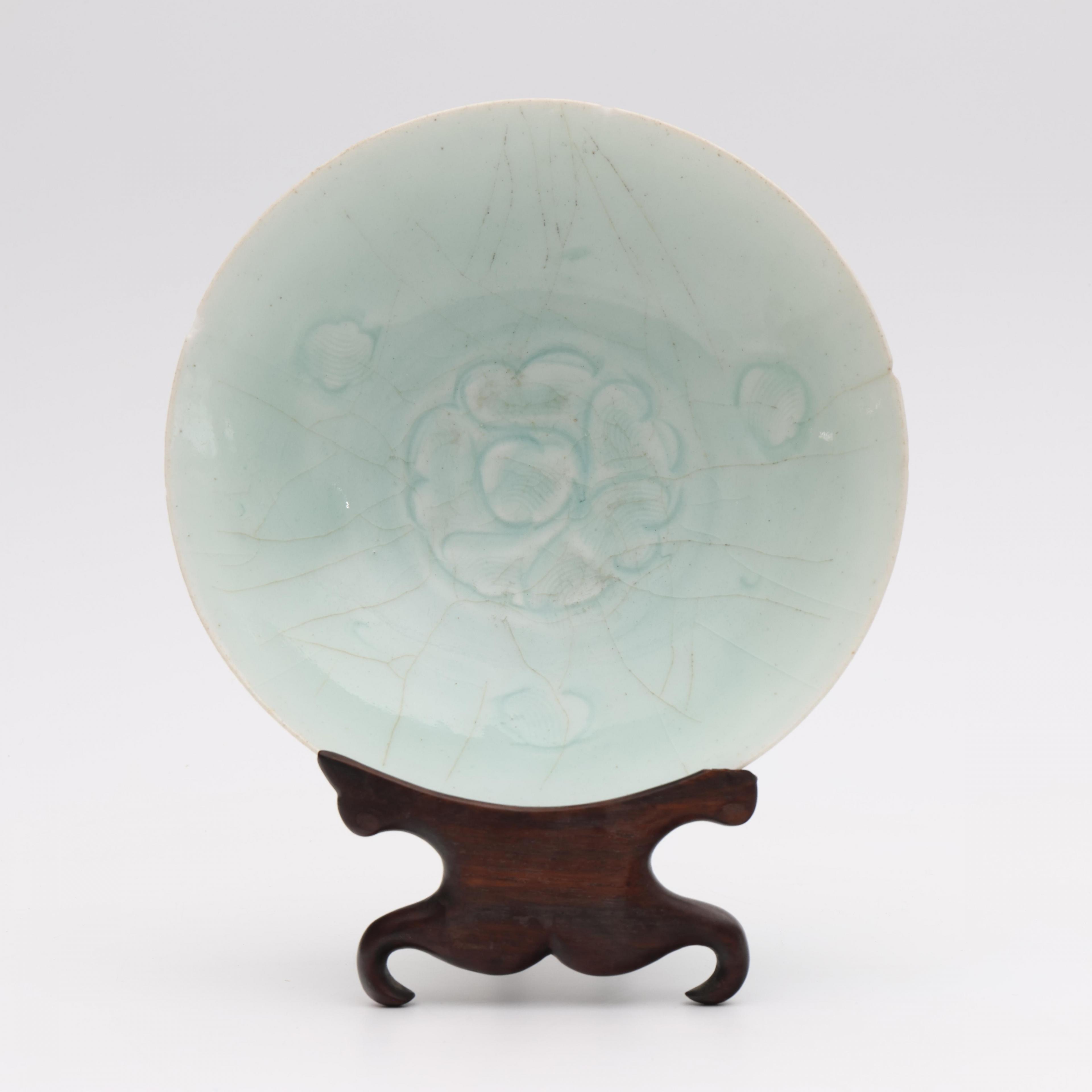 incised with a central flower, covered in a bluish tinted glaze, with wood stand (glaze cracks, small hairlines and small rim chips)