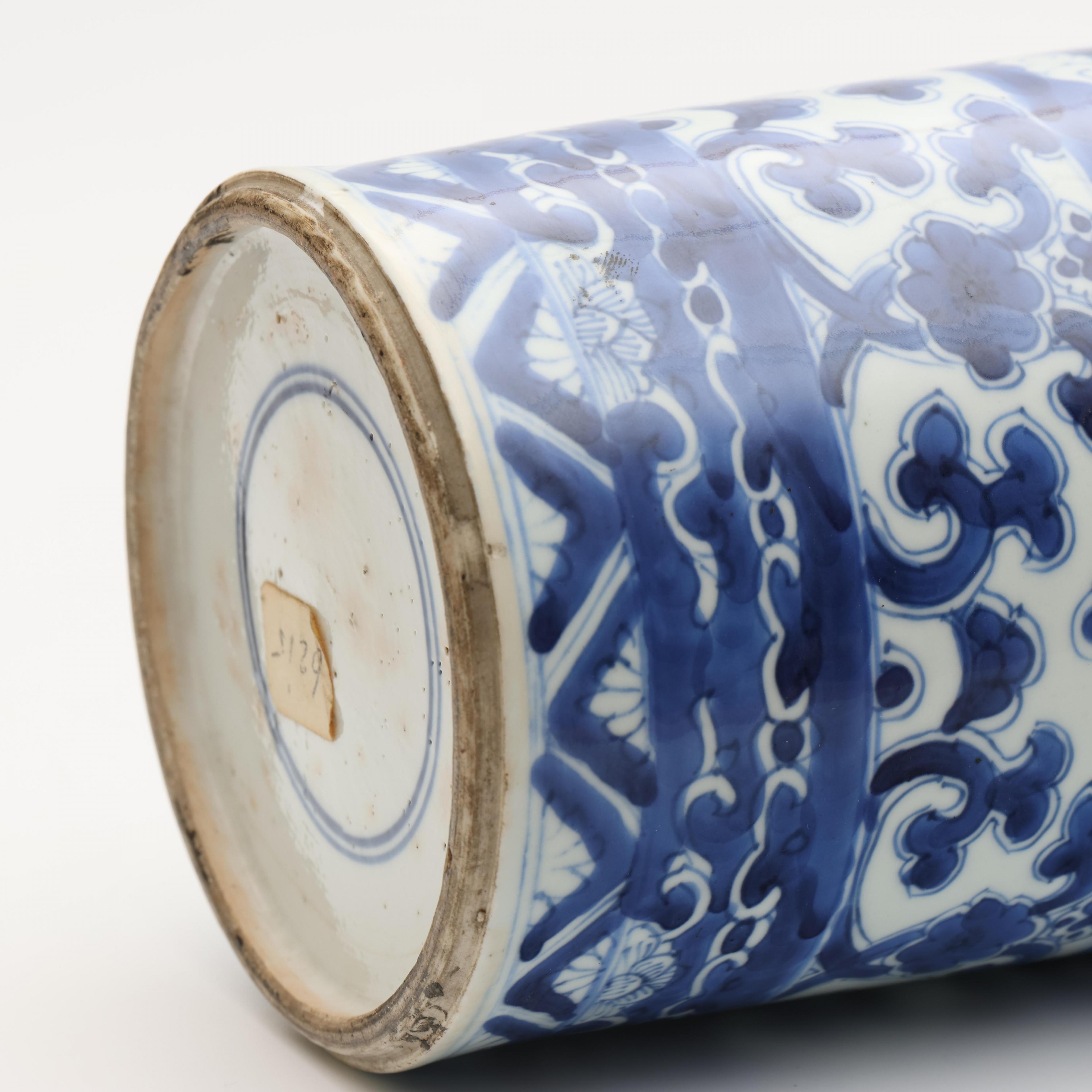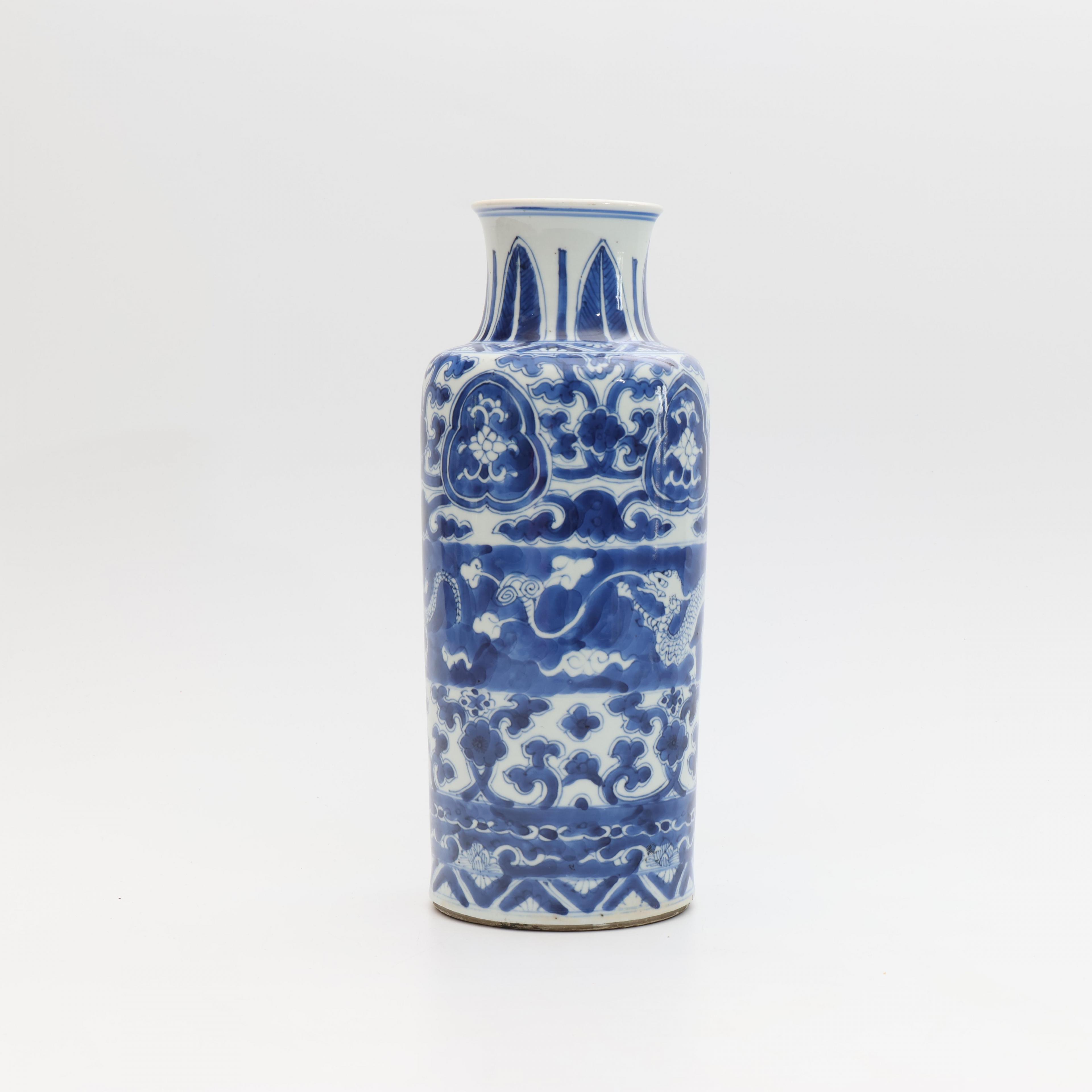the cylindrical vase decorated with a central band of two chilong and lingzhi fungus, embedded in various floral and geometrical bands, the short neck with upright leaves (minor old frits to the footrim)