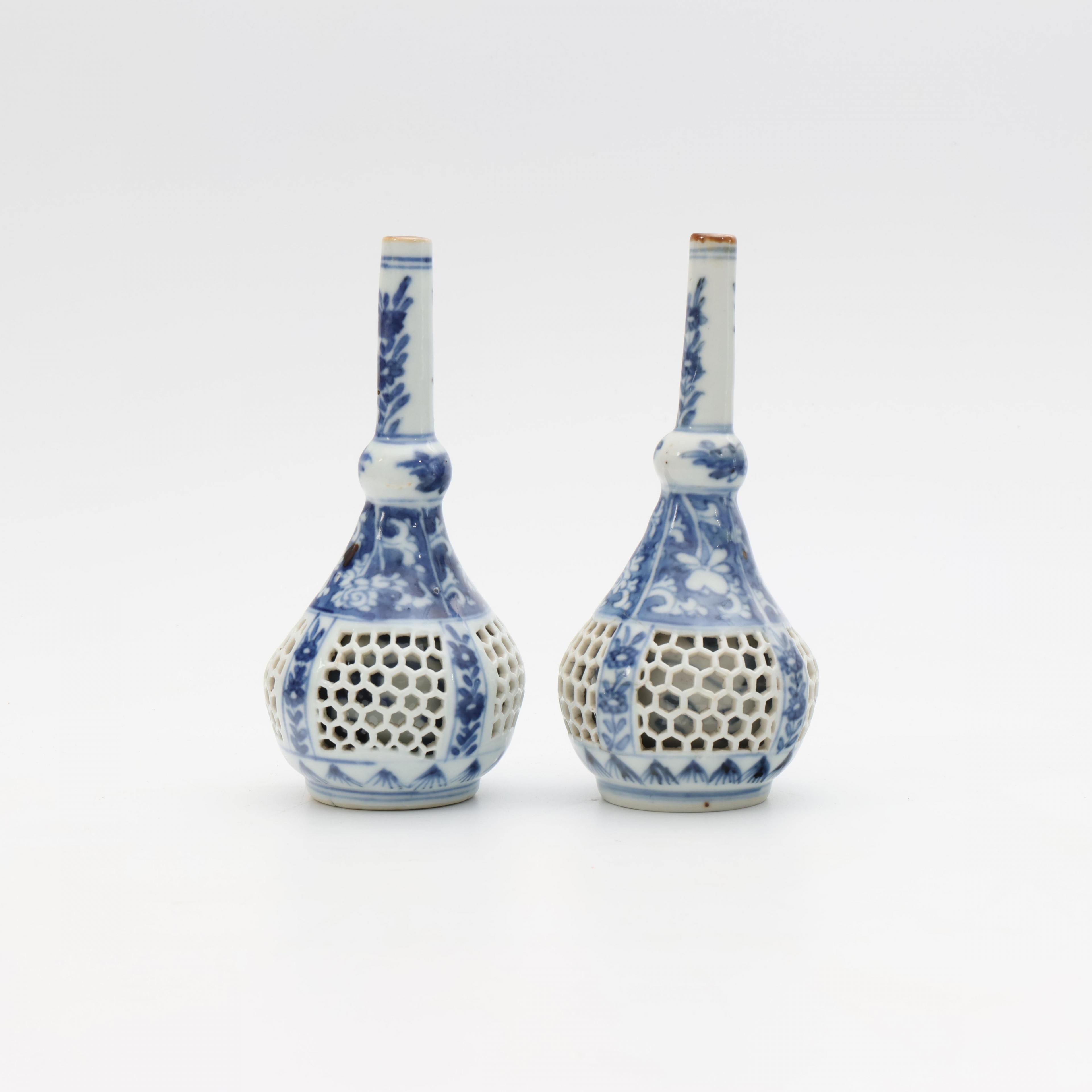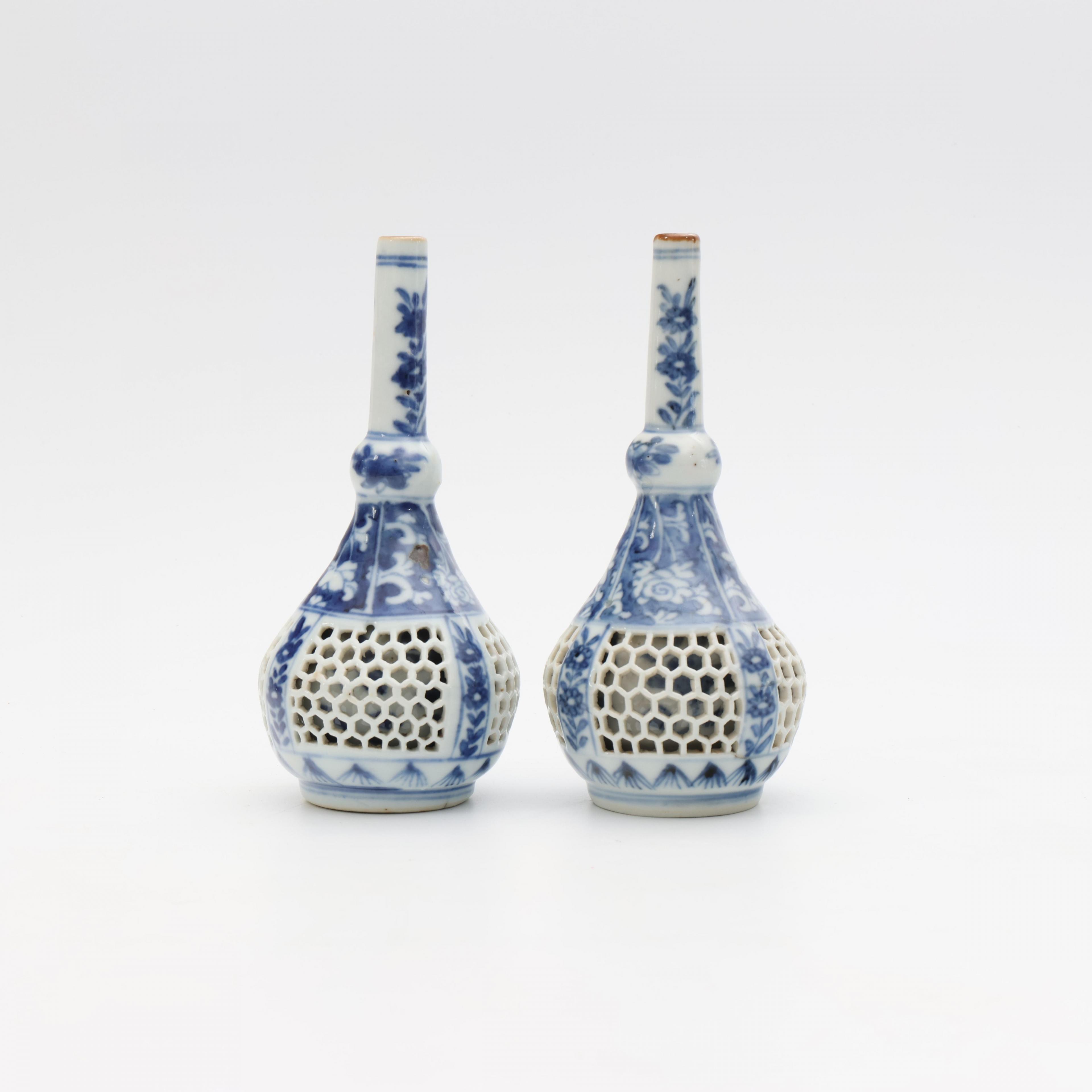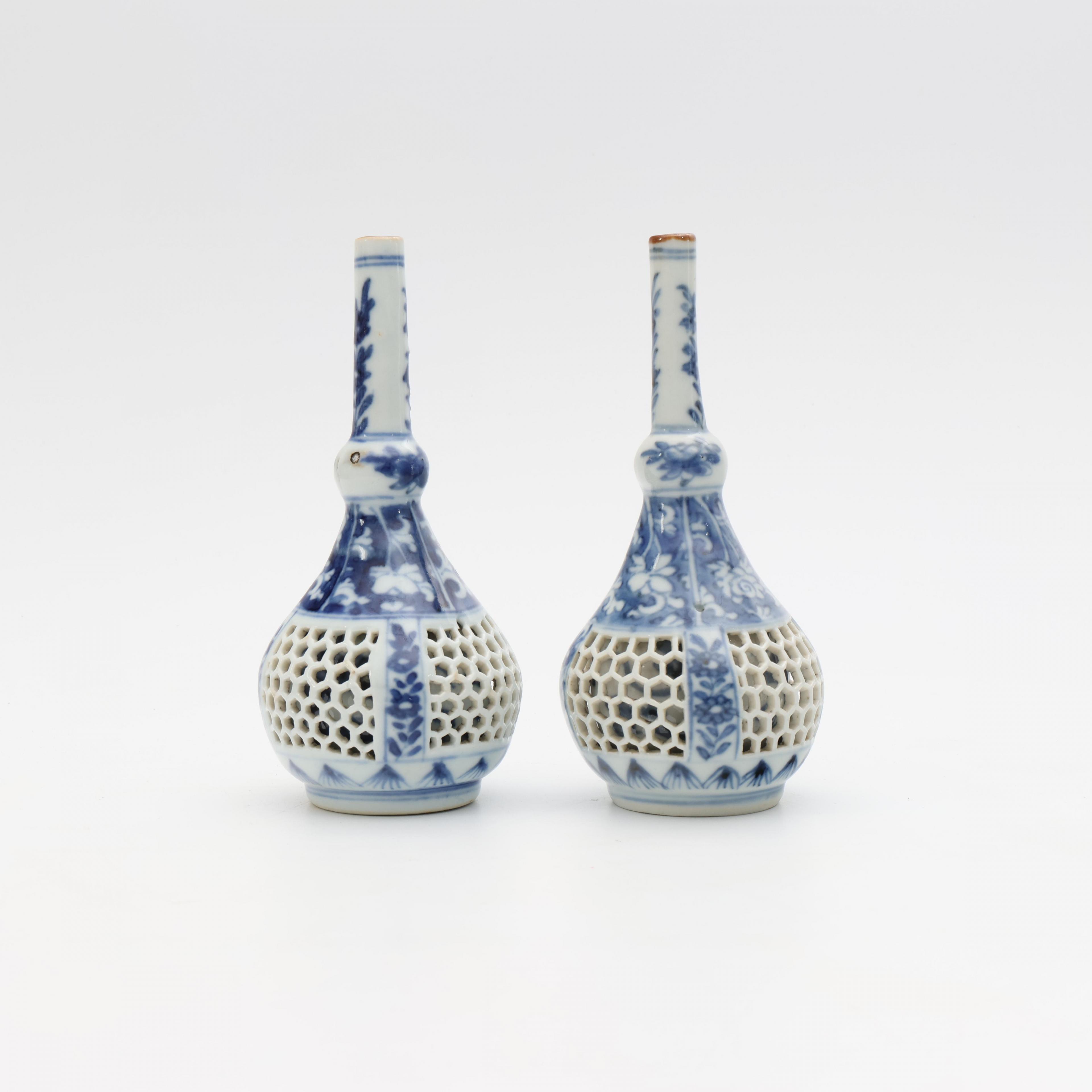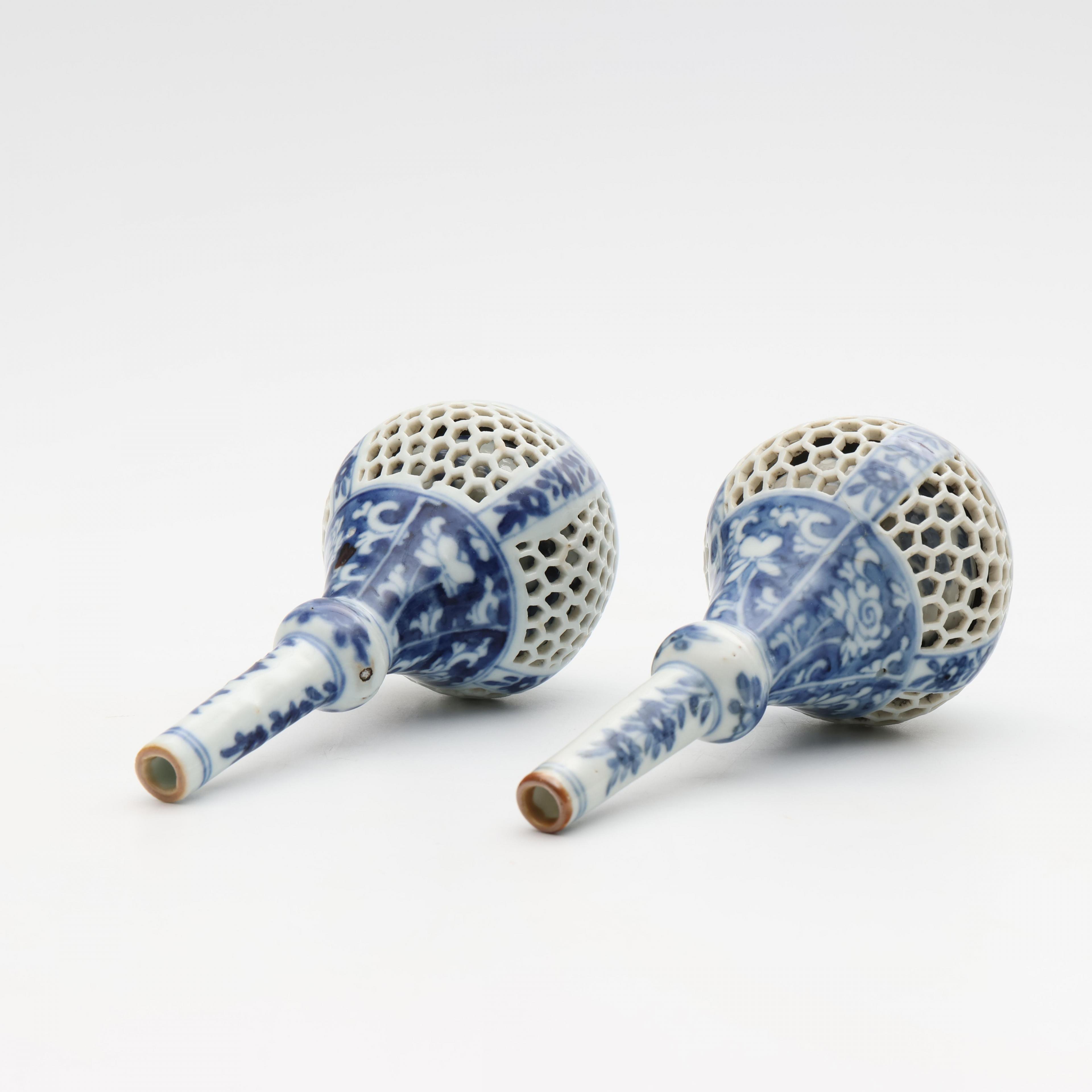 China, a pair of blue and white porcelain reticulated rosewater sprinklers, Kangxi period (1662-1722),