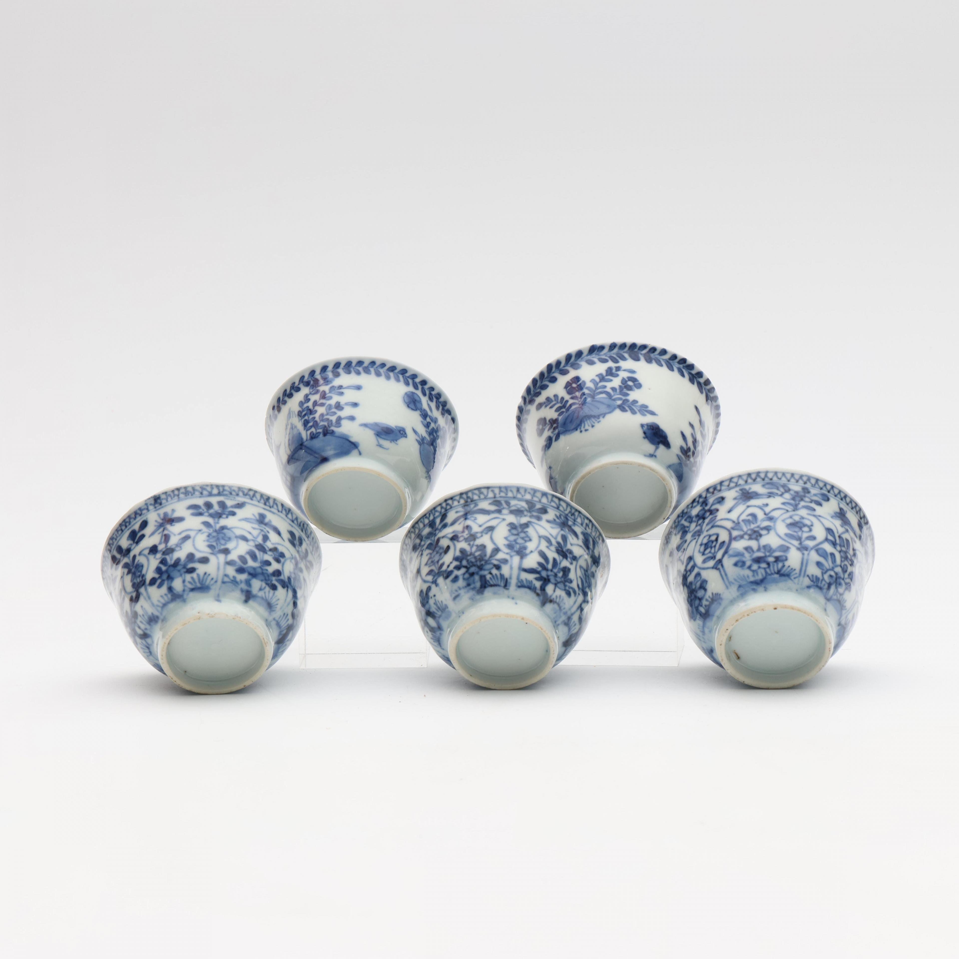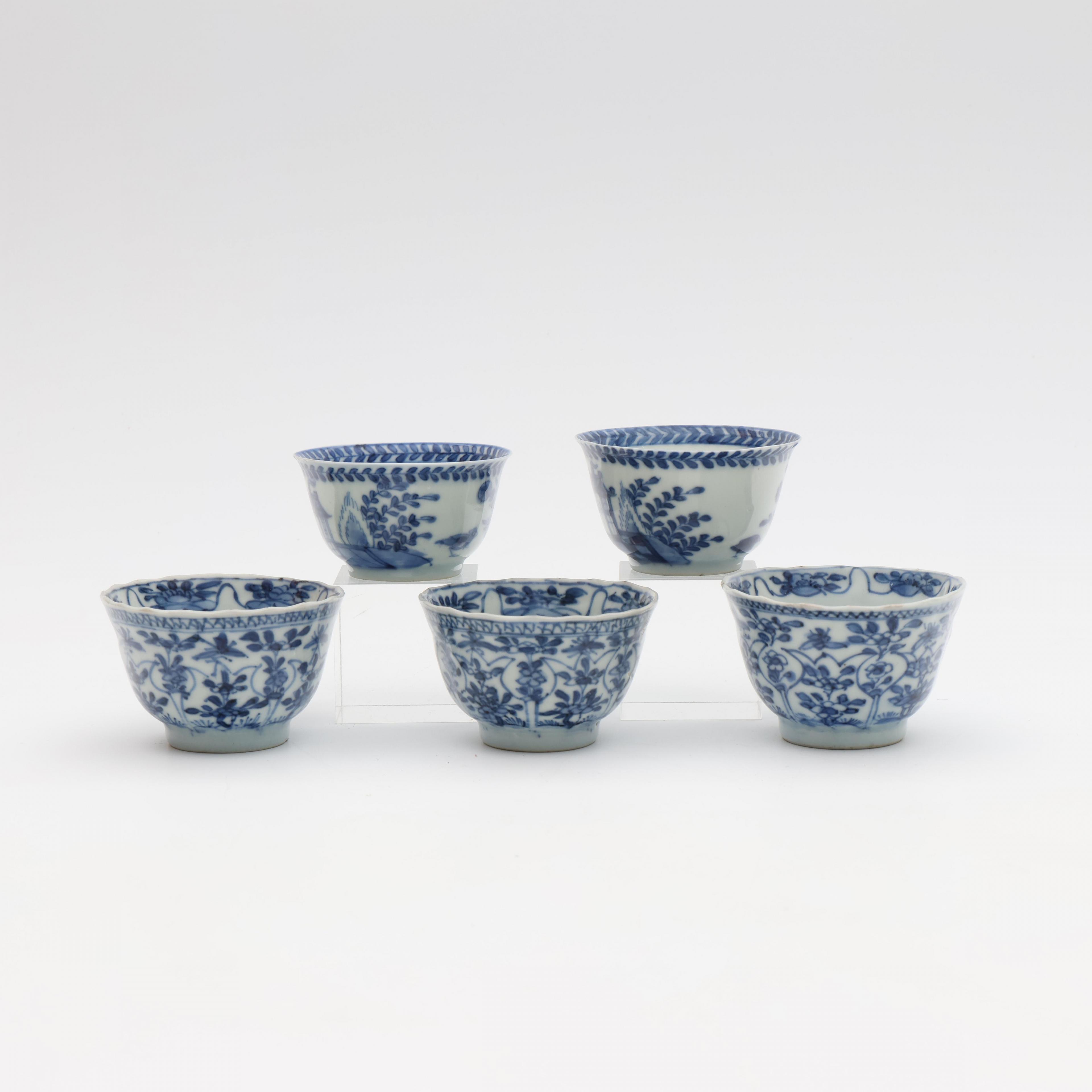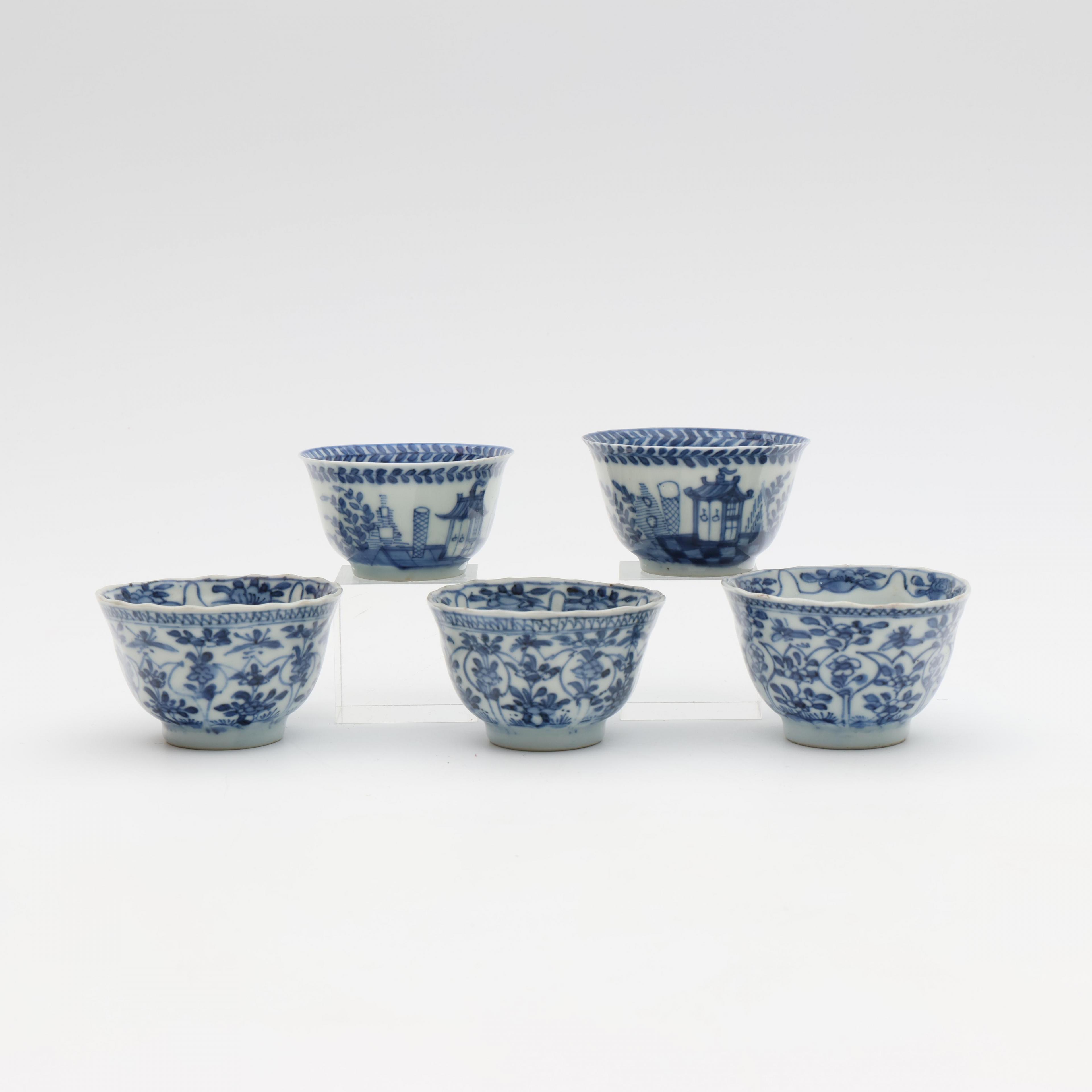China, a set of three and a pair of blue and white porcelain cups, 18th century,