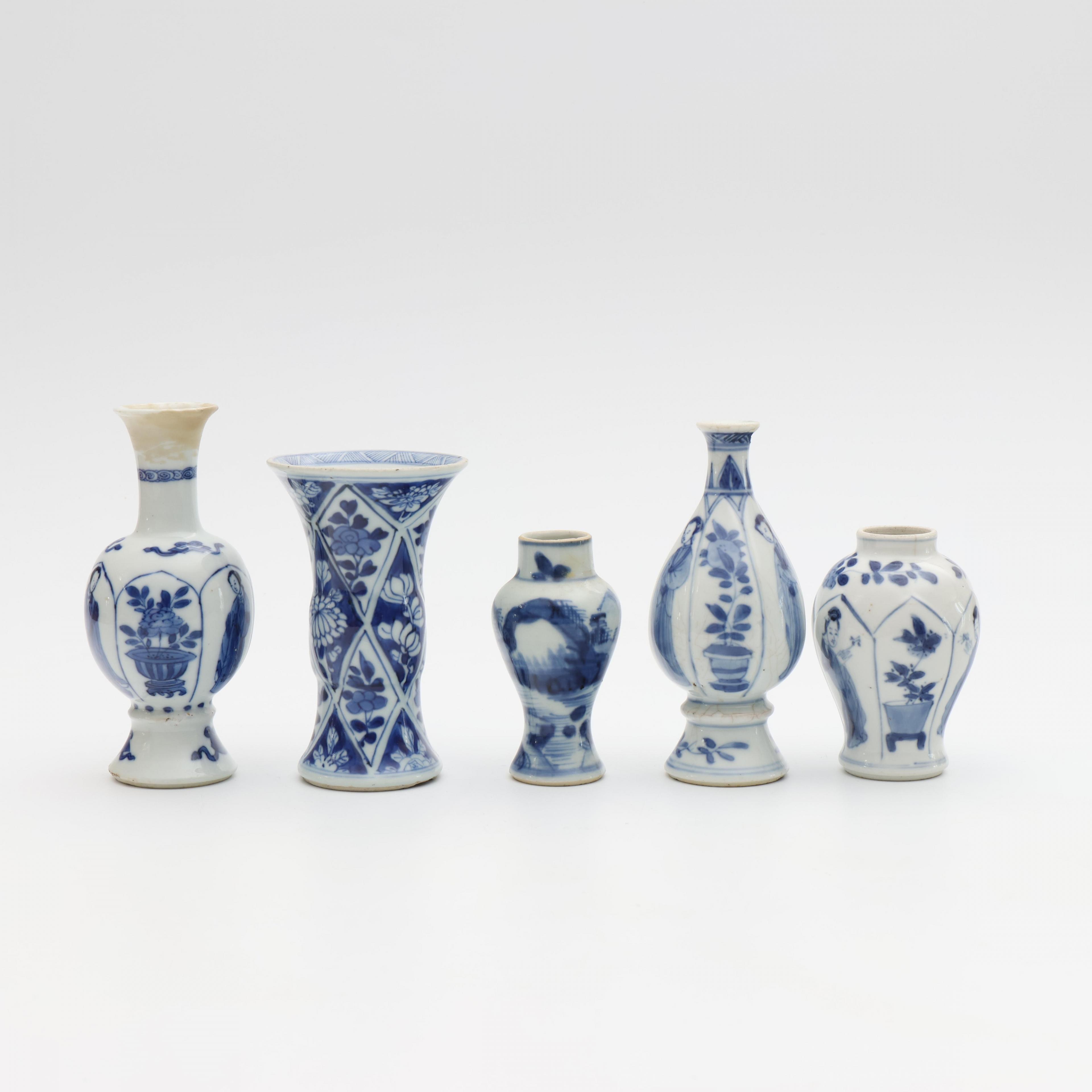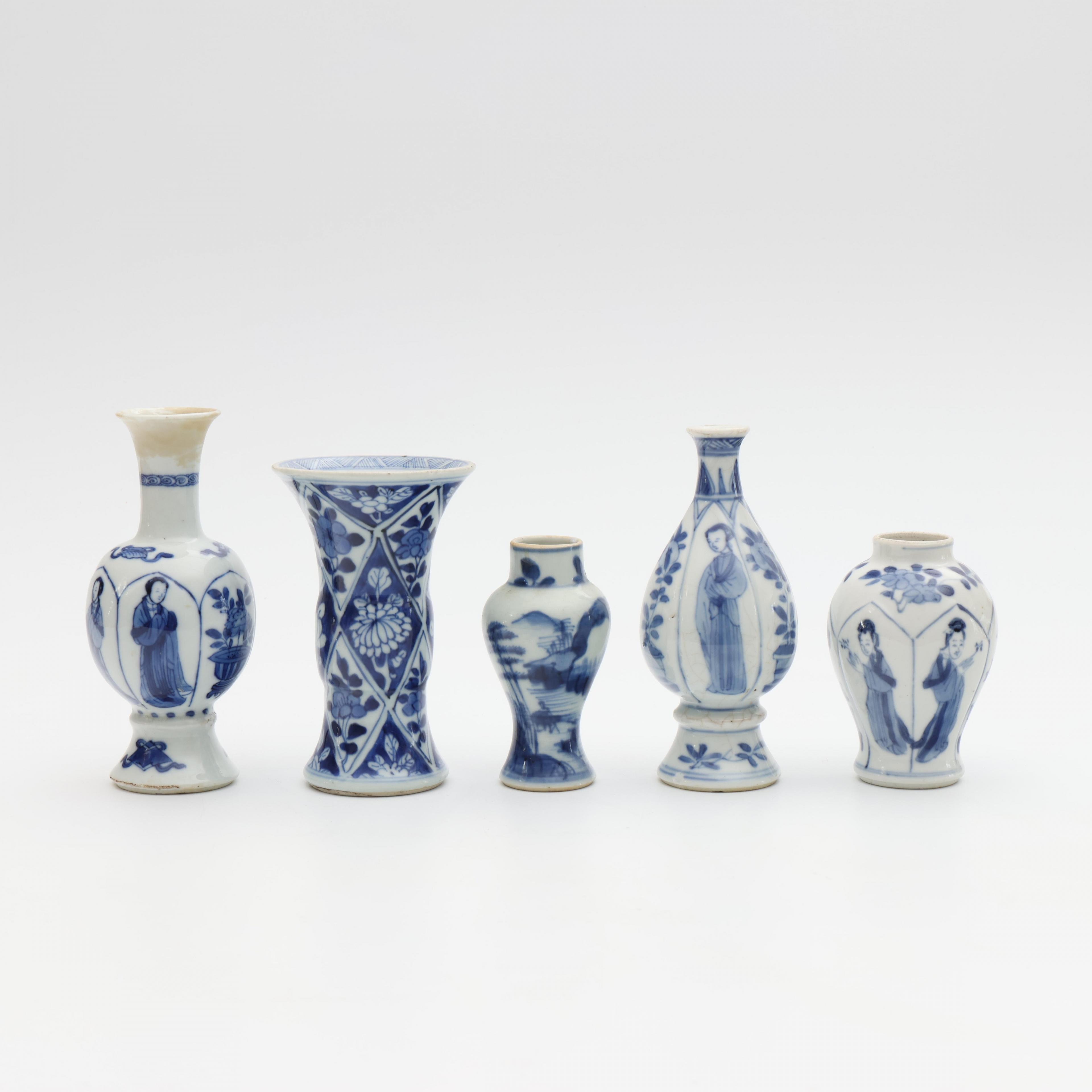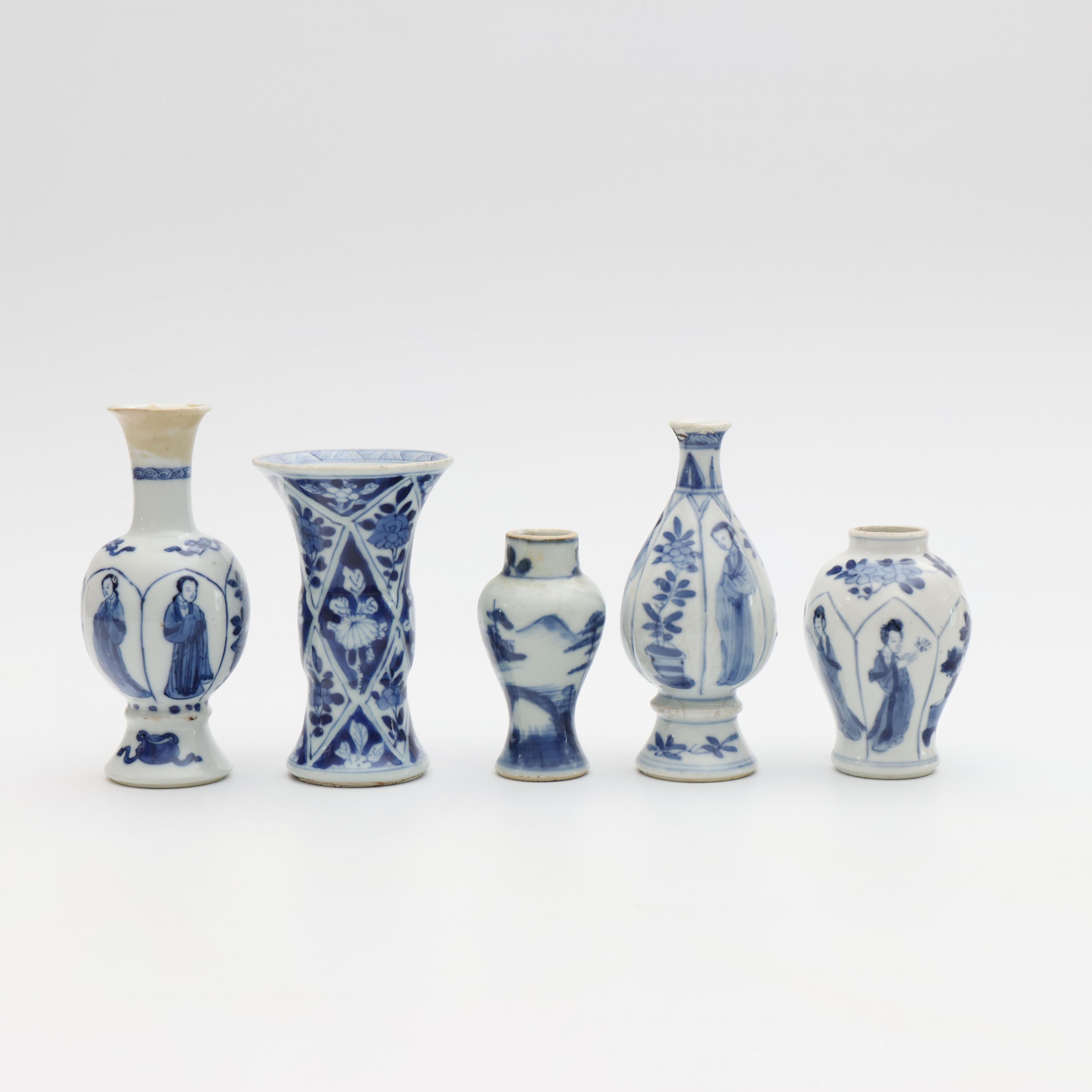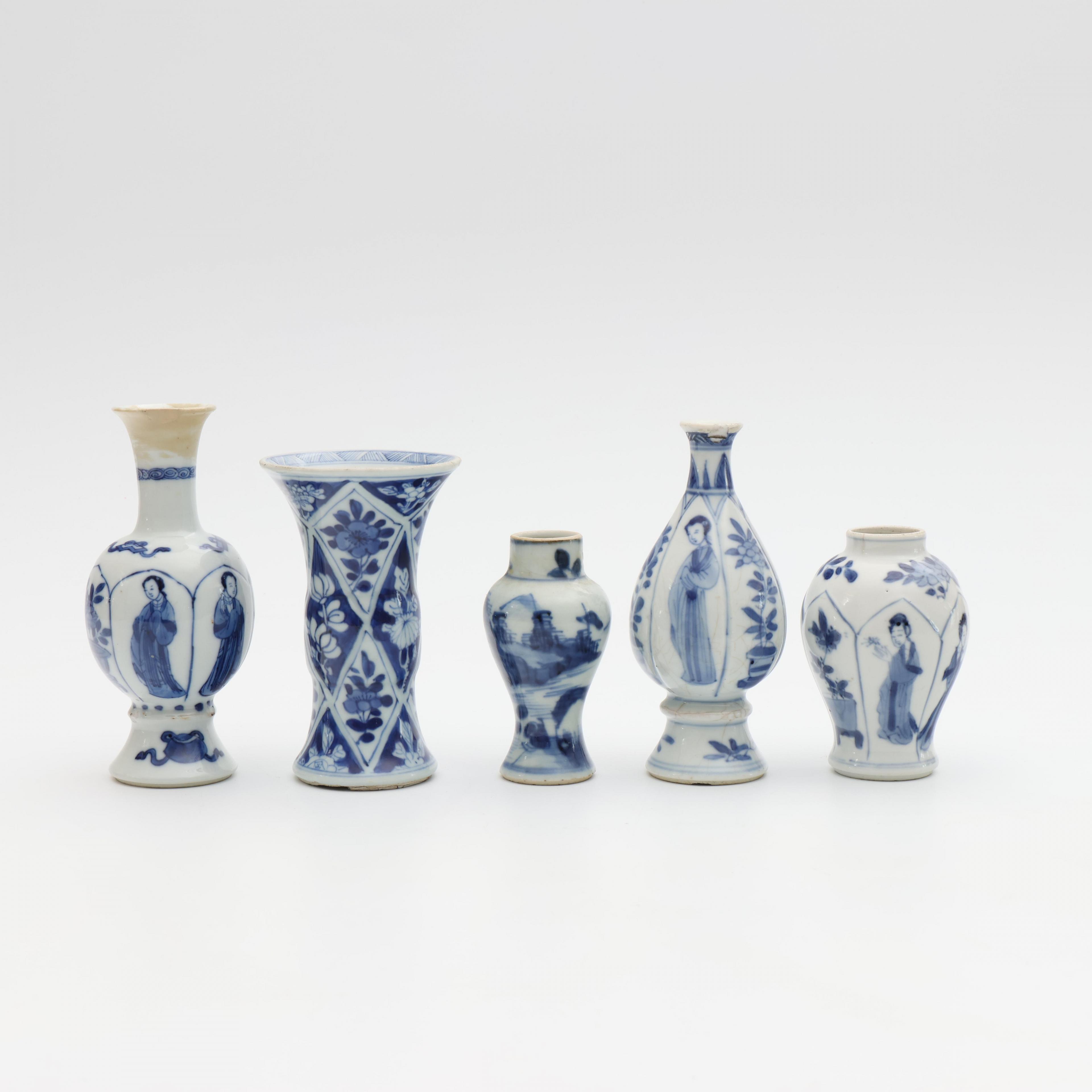 one trumpet vase with diamon-shaped panels of flowers, one with riverscape and three vases of various shape with elegant ladies (one vase with ladies with restored neck and one with small rim chip, the riverscape vase with small reglued chip, the trumpet vase with old chip to the foot)