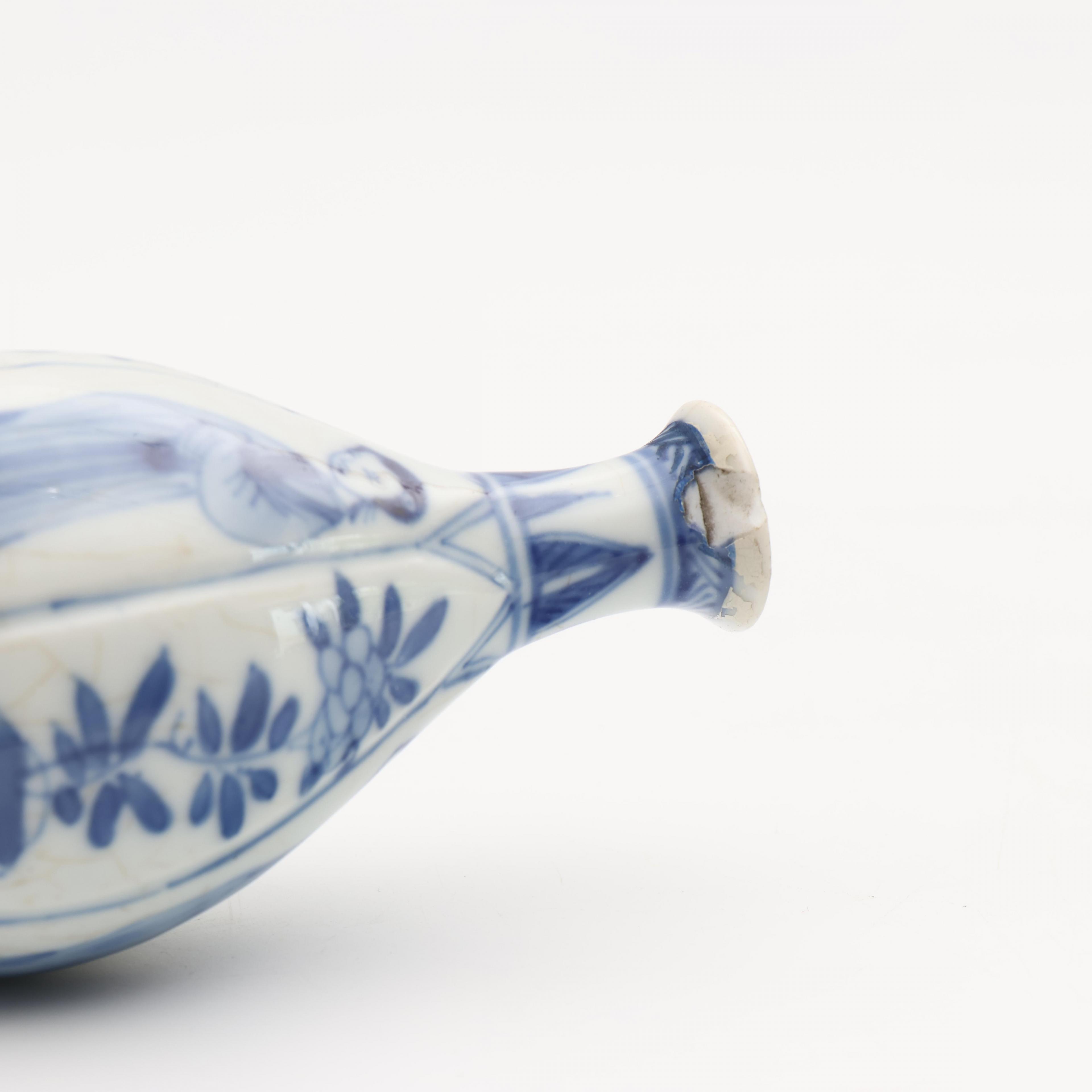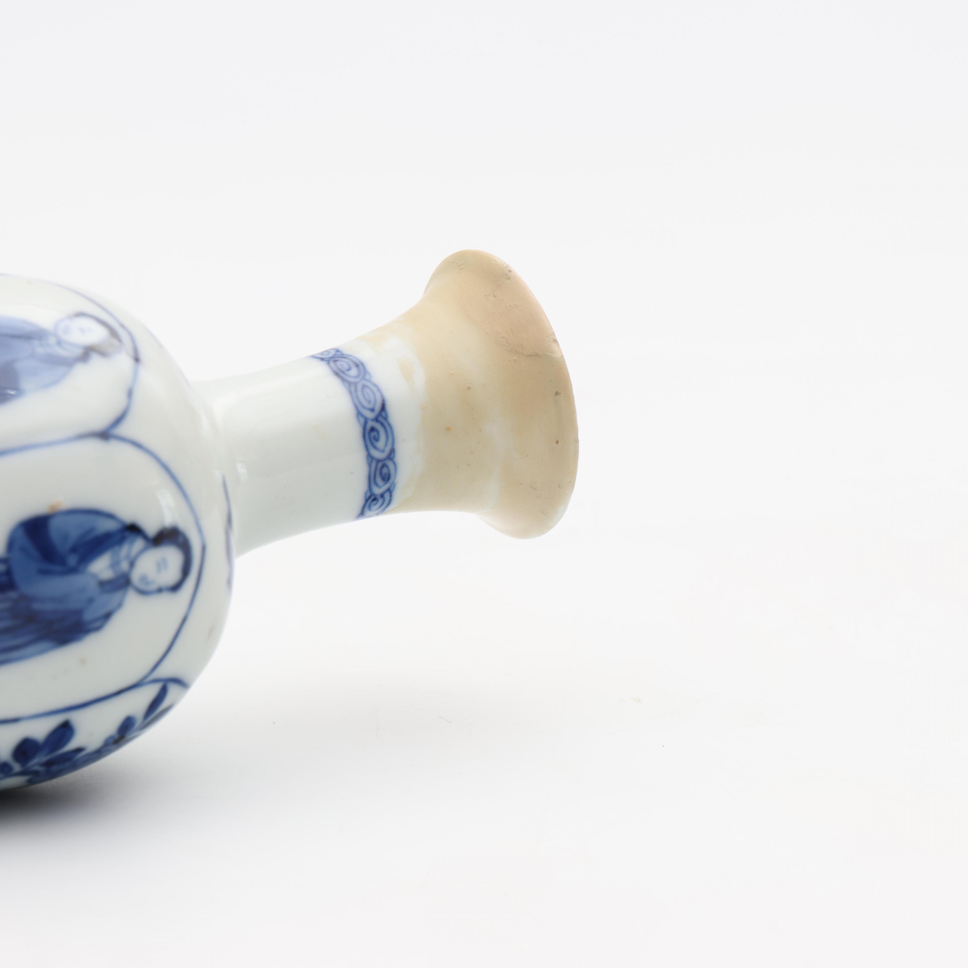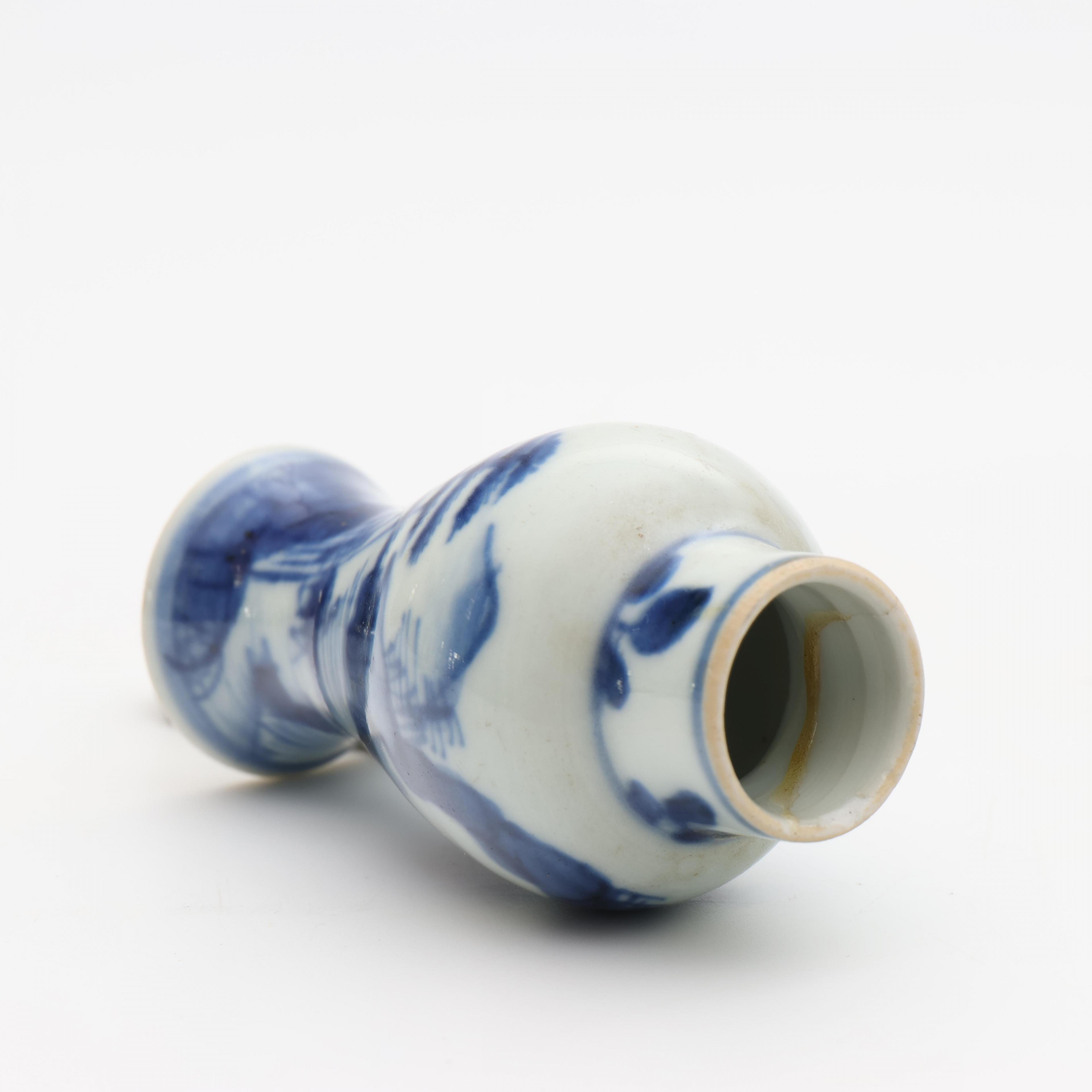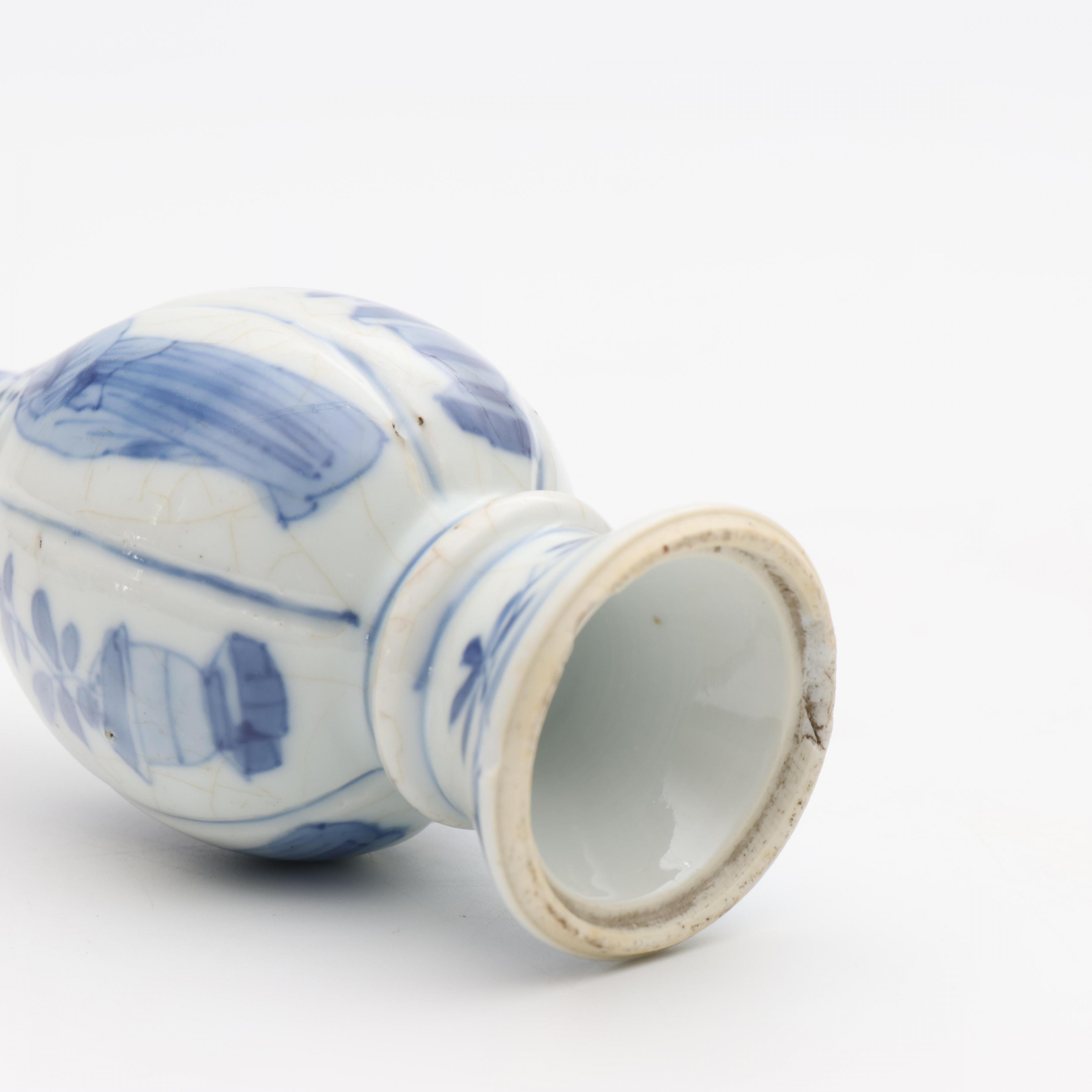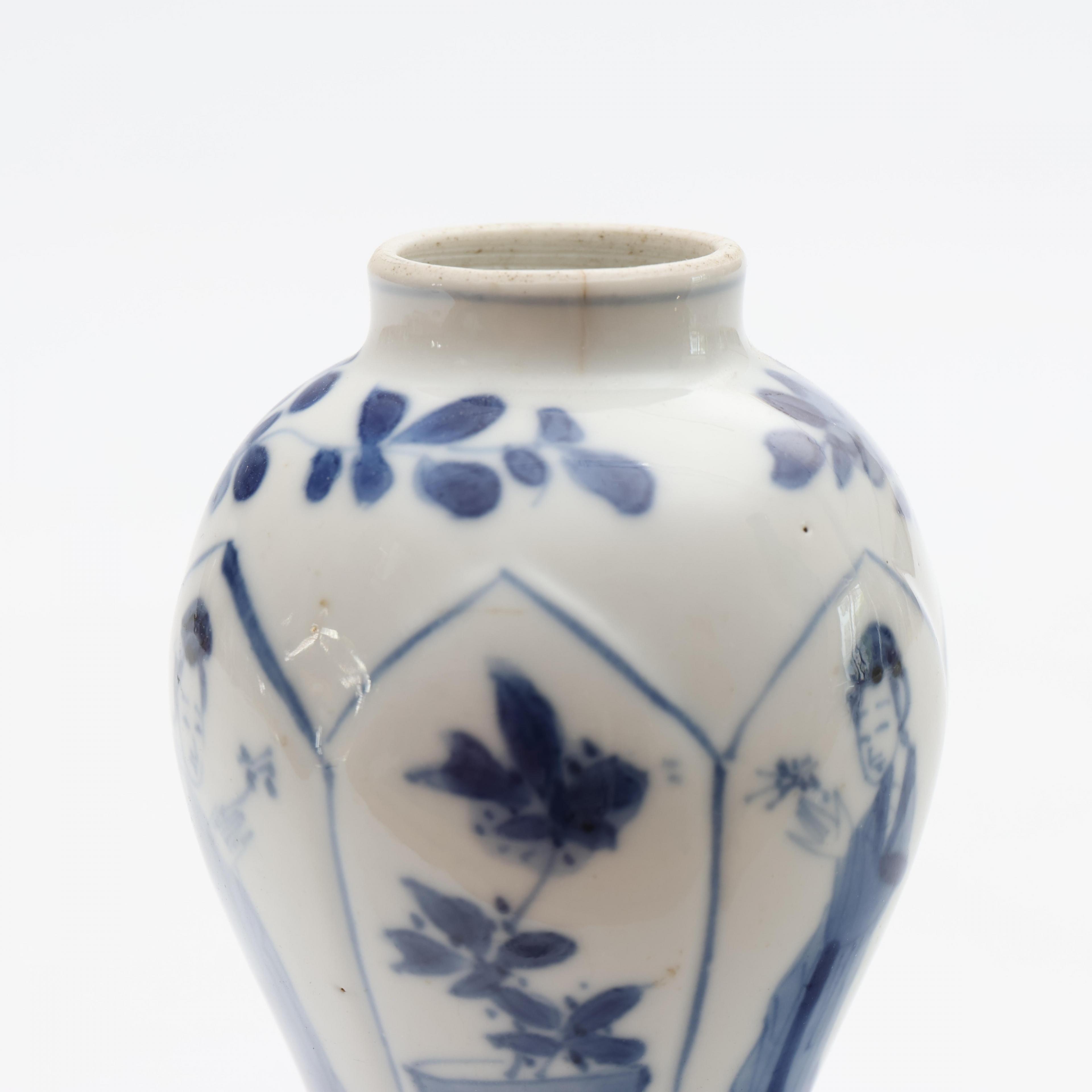 one trumpet vase with diamon-shaped panels of flowers, one with riverscape and three vases of various shape with elegant ladies (one vase with ladies with restored neck and one with small rim chip, the riverscape vase with small reglued chip, the trumpet vase with old chip to the foot)