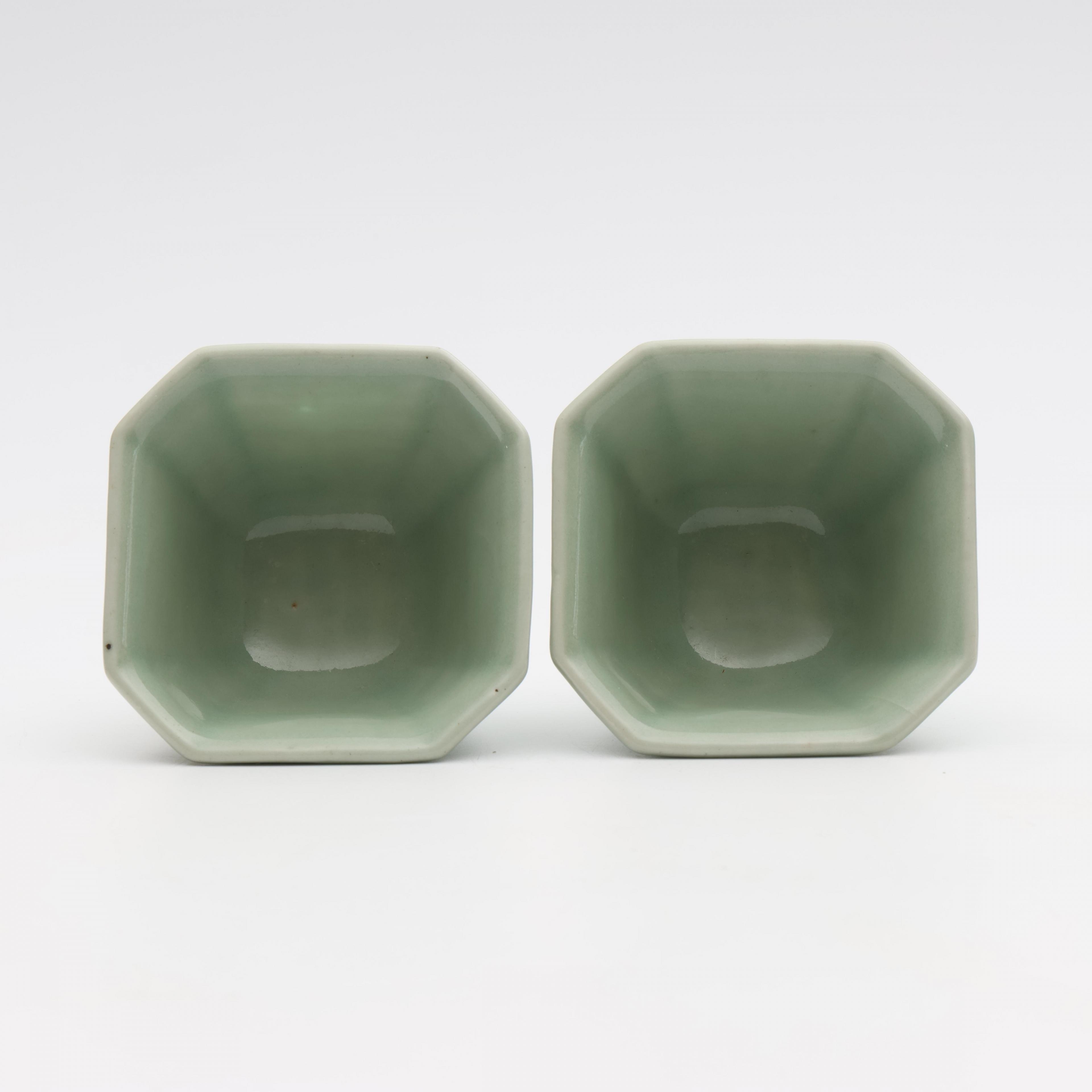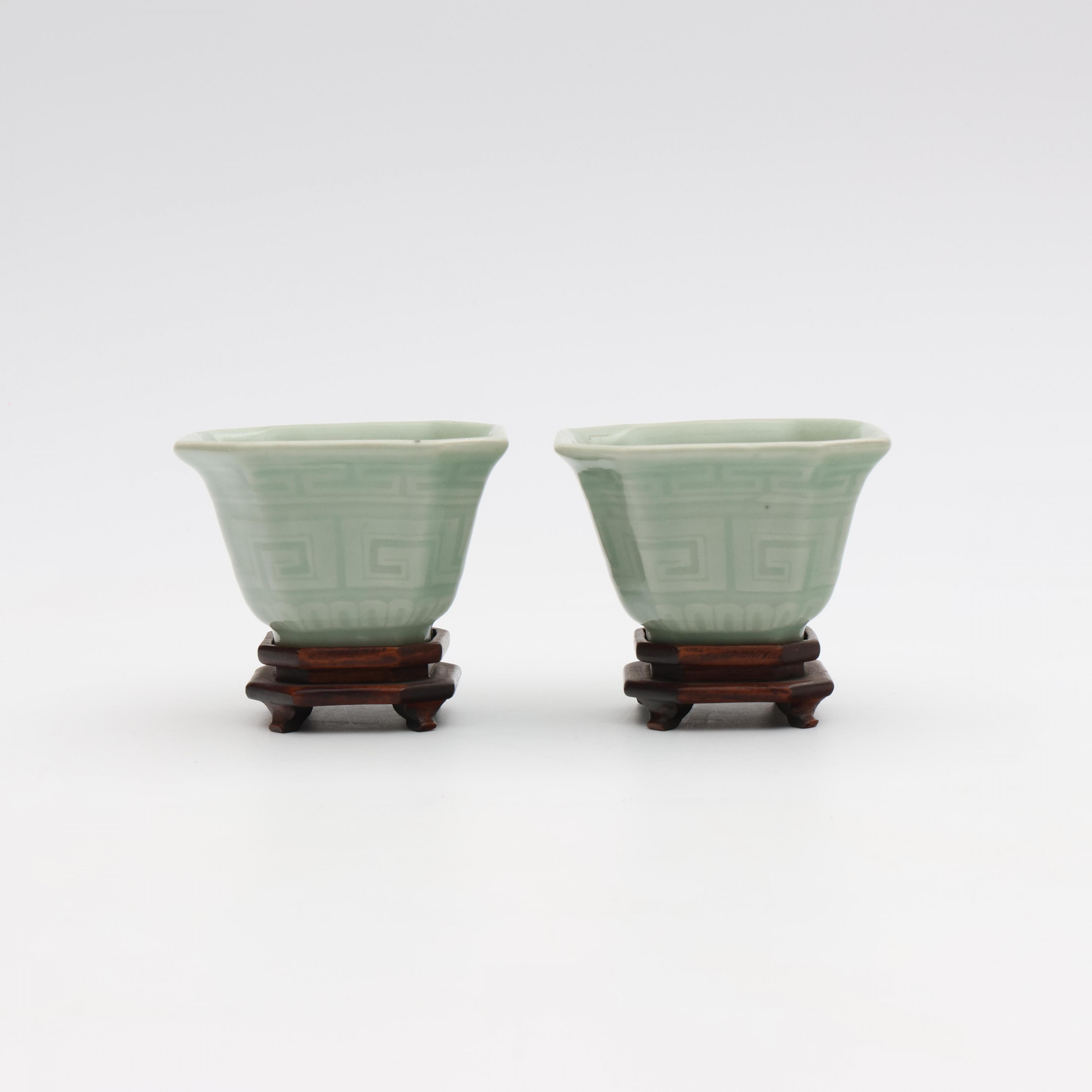 China, a pair of square celadon-glazed archaistic bowls, 19th century,