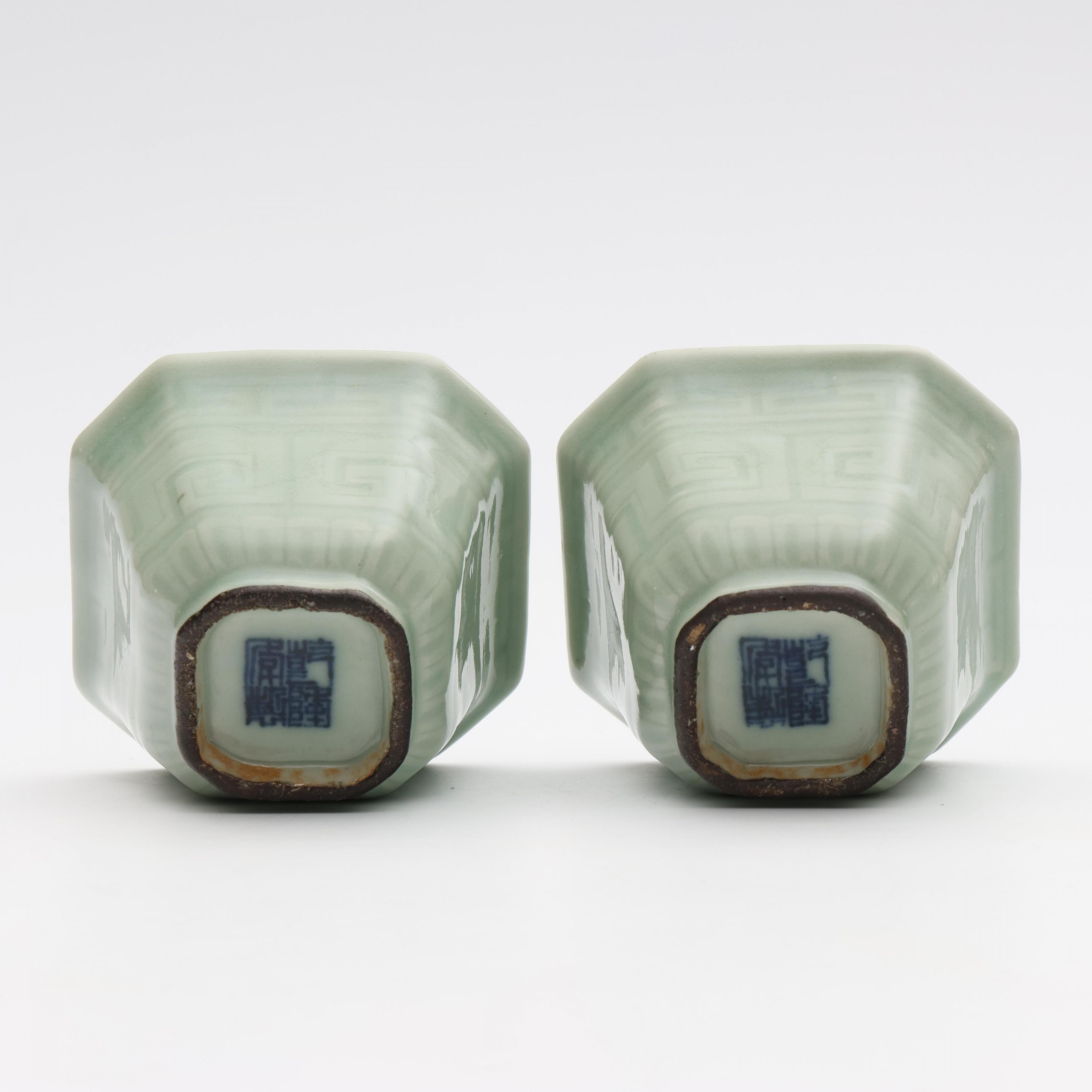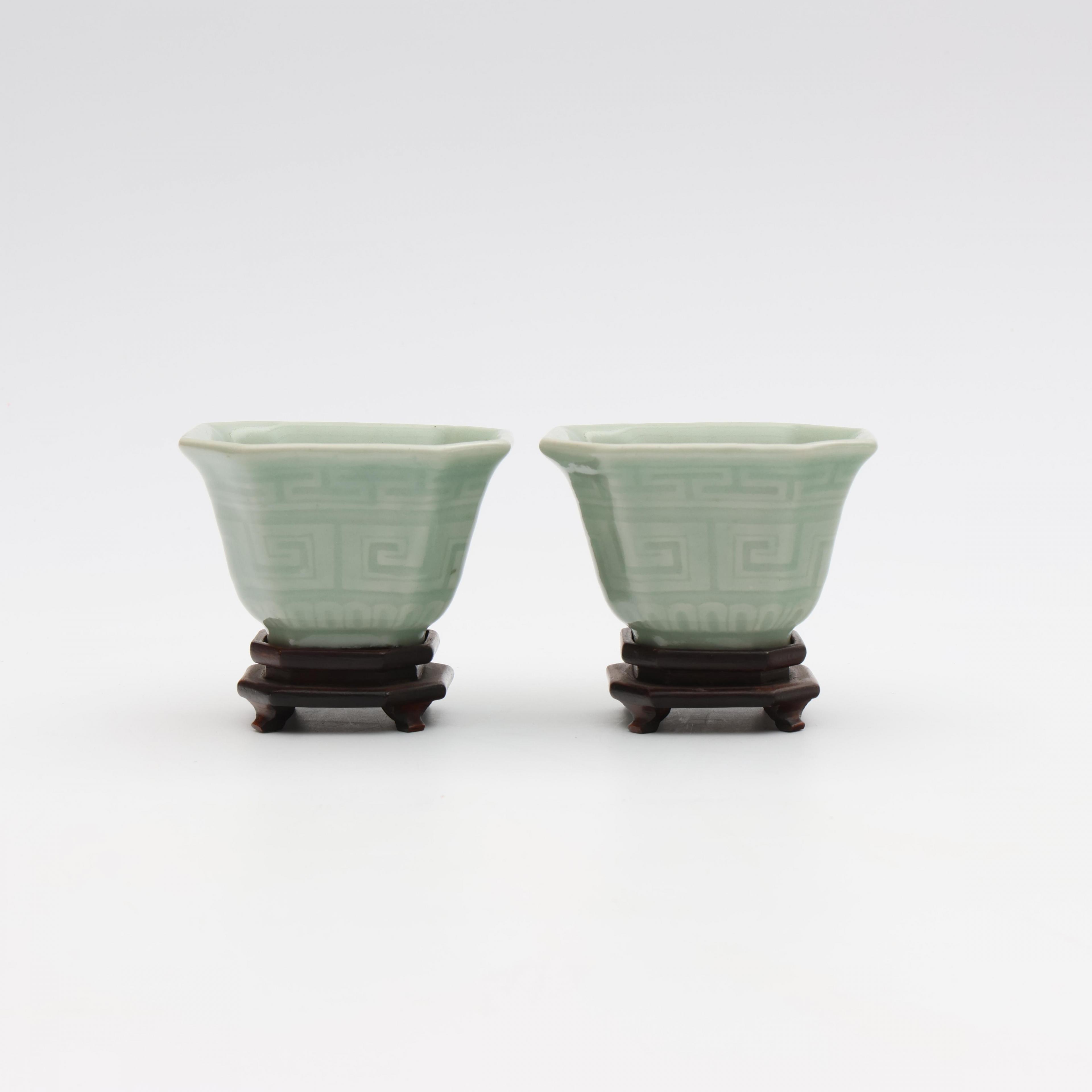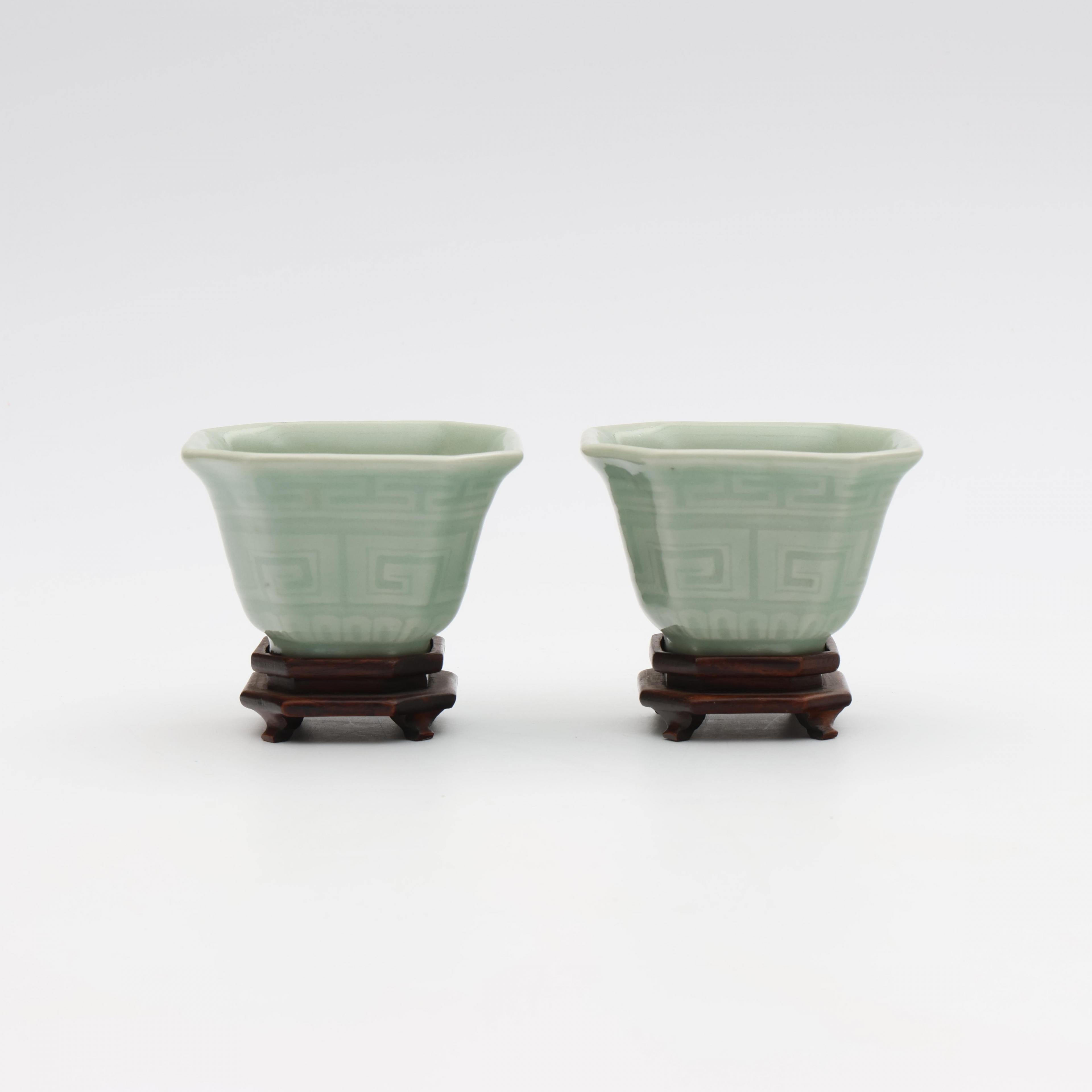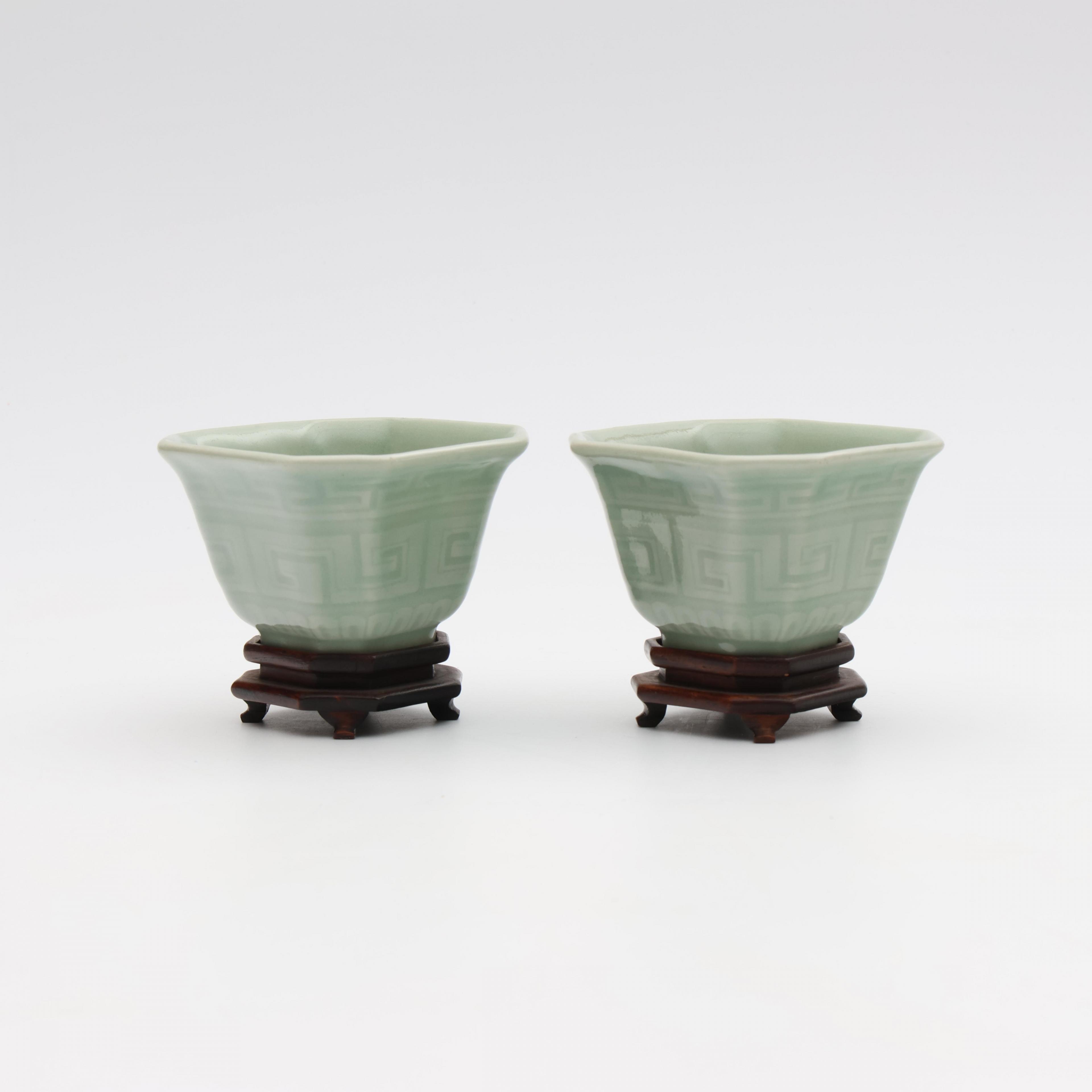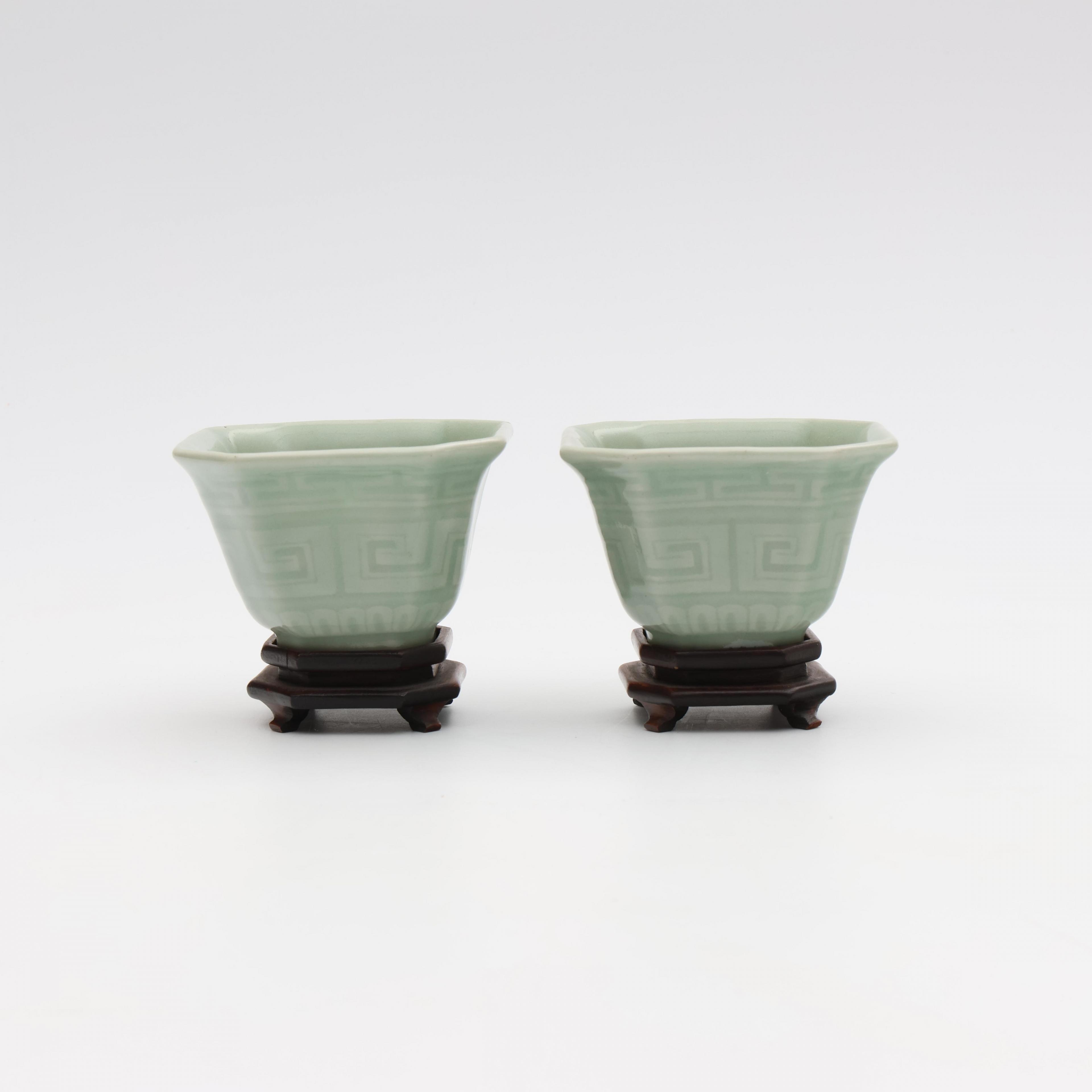 each moulded with archaistic geometrical scrolls and covered in a subtle pale green glaze, the base with apocryphal Qianlong seal mark, on wood stands (one with faint hairline/ glaze crack of ca. 3 cm)