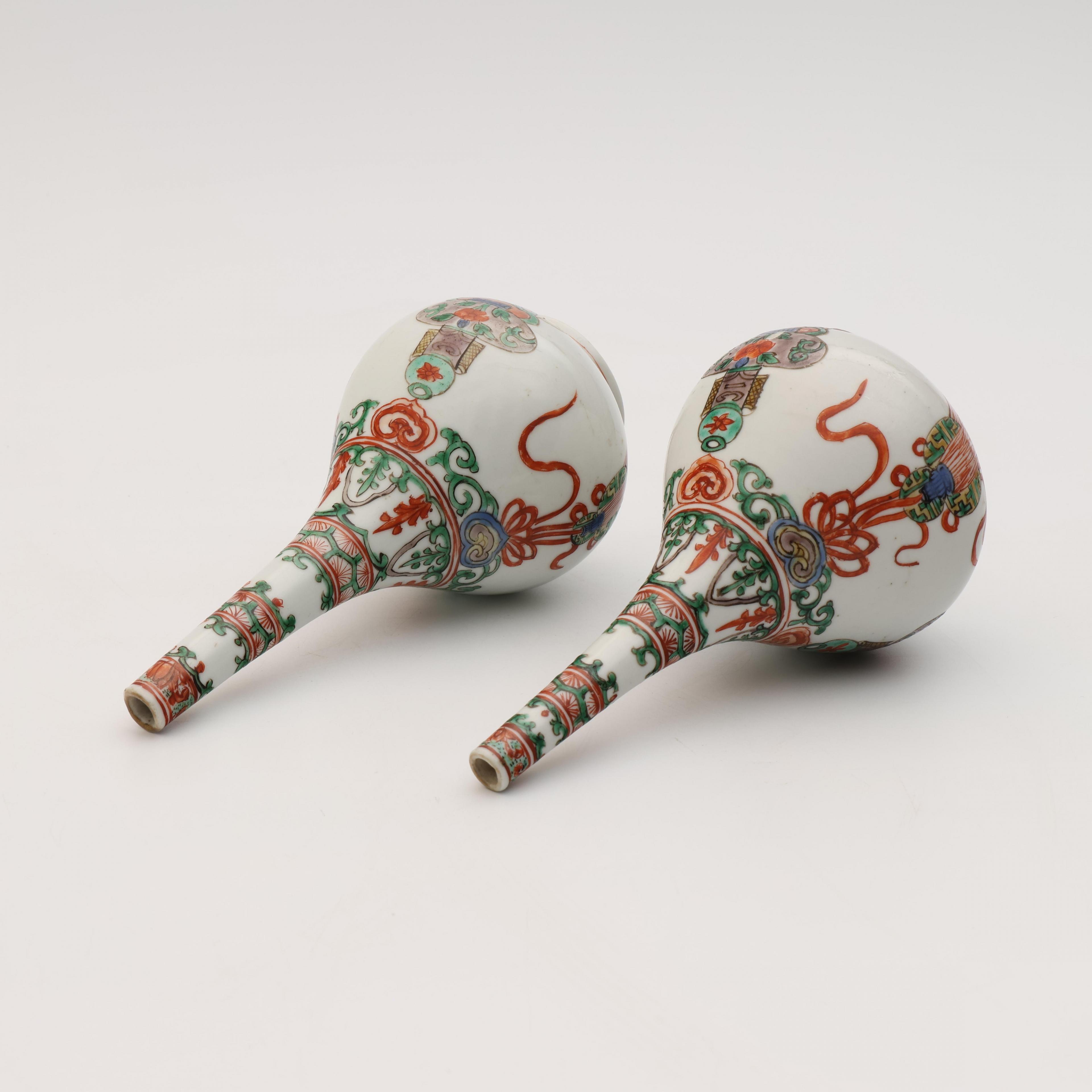 each moulded with bulbous body and tall, slender neck, painted with antiquities suspending from ruyi-heads, the necks with various borders (one with small glaze frit to the body, otherwise in good overall condition)