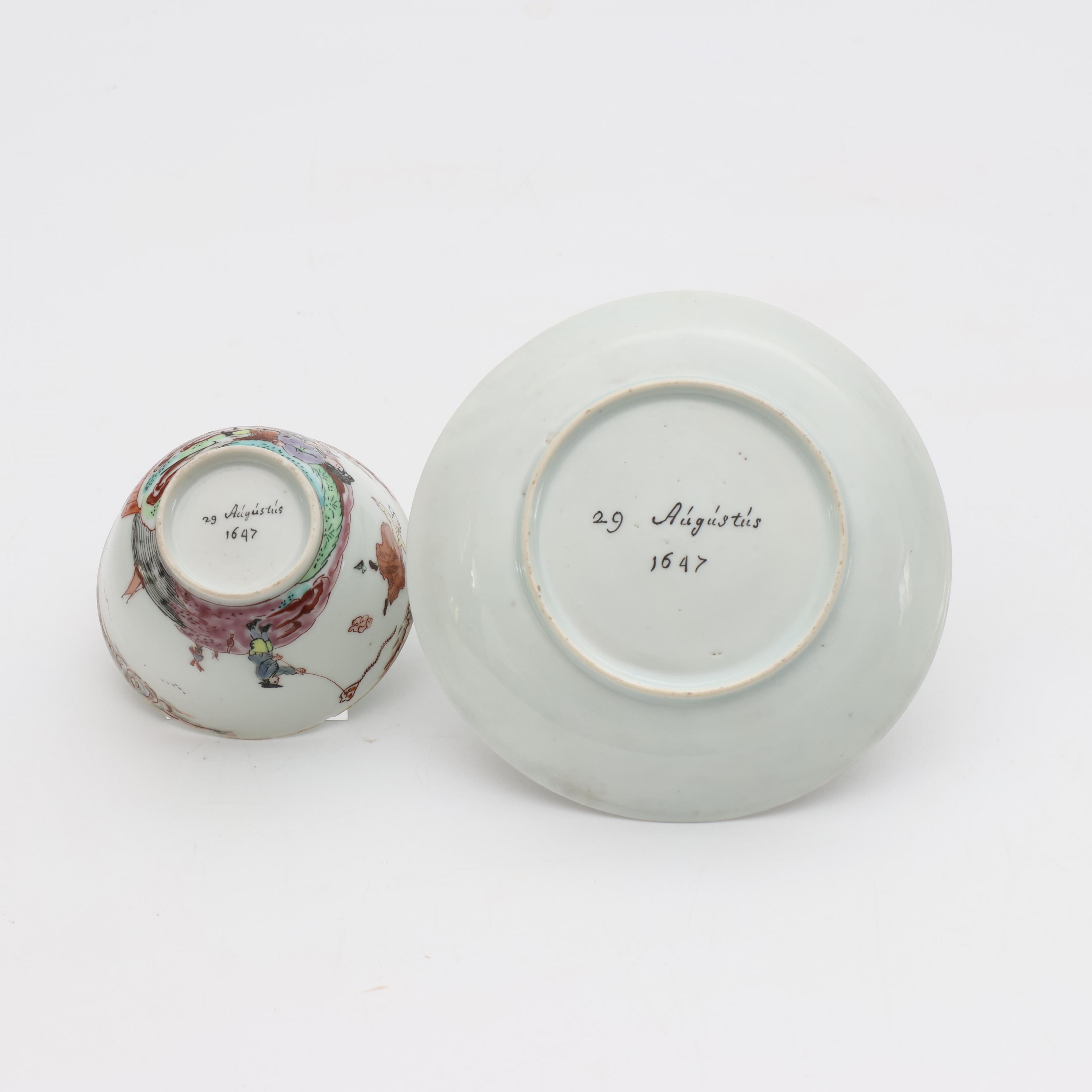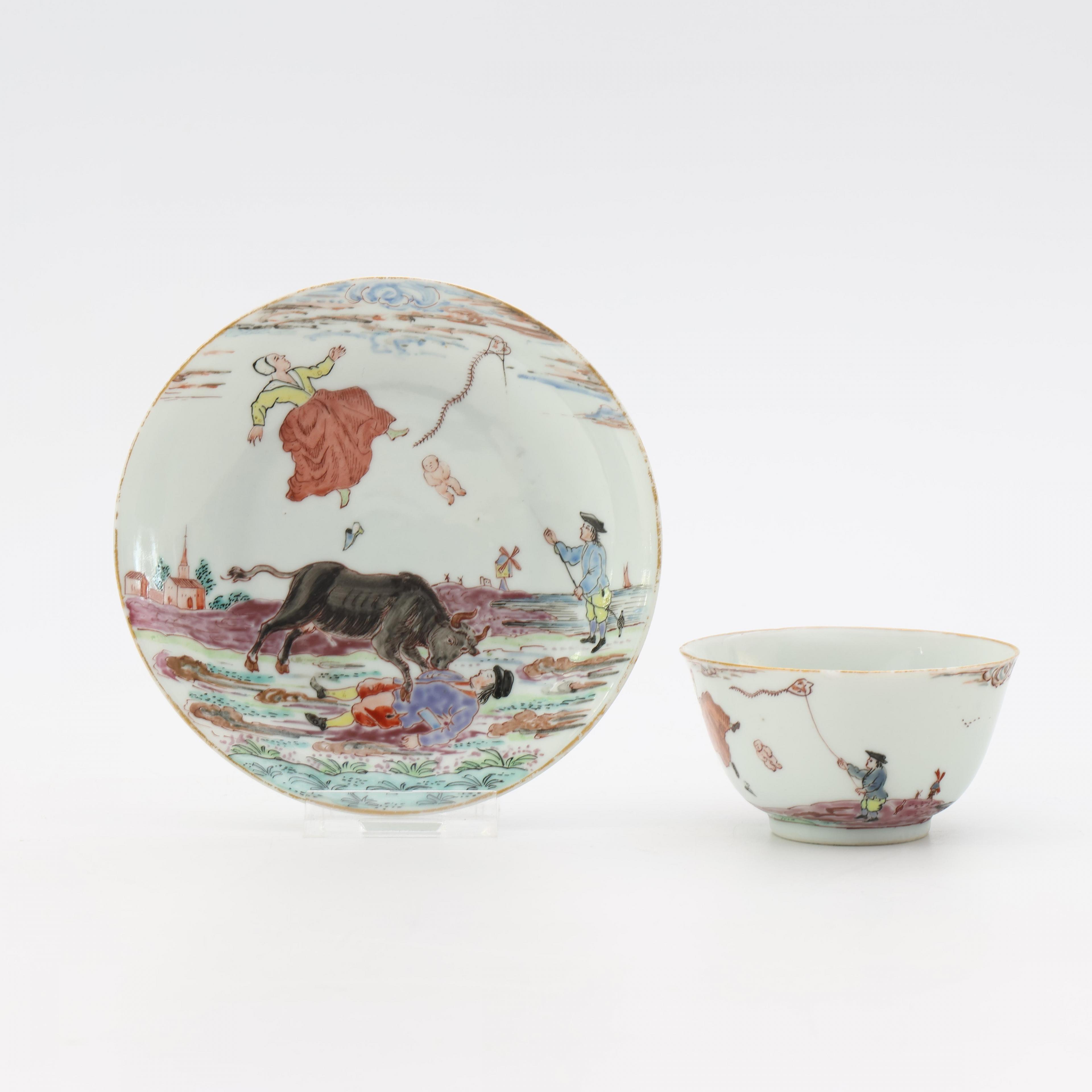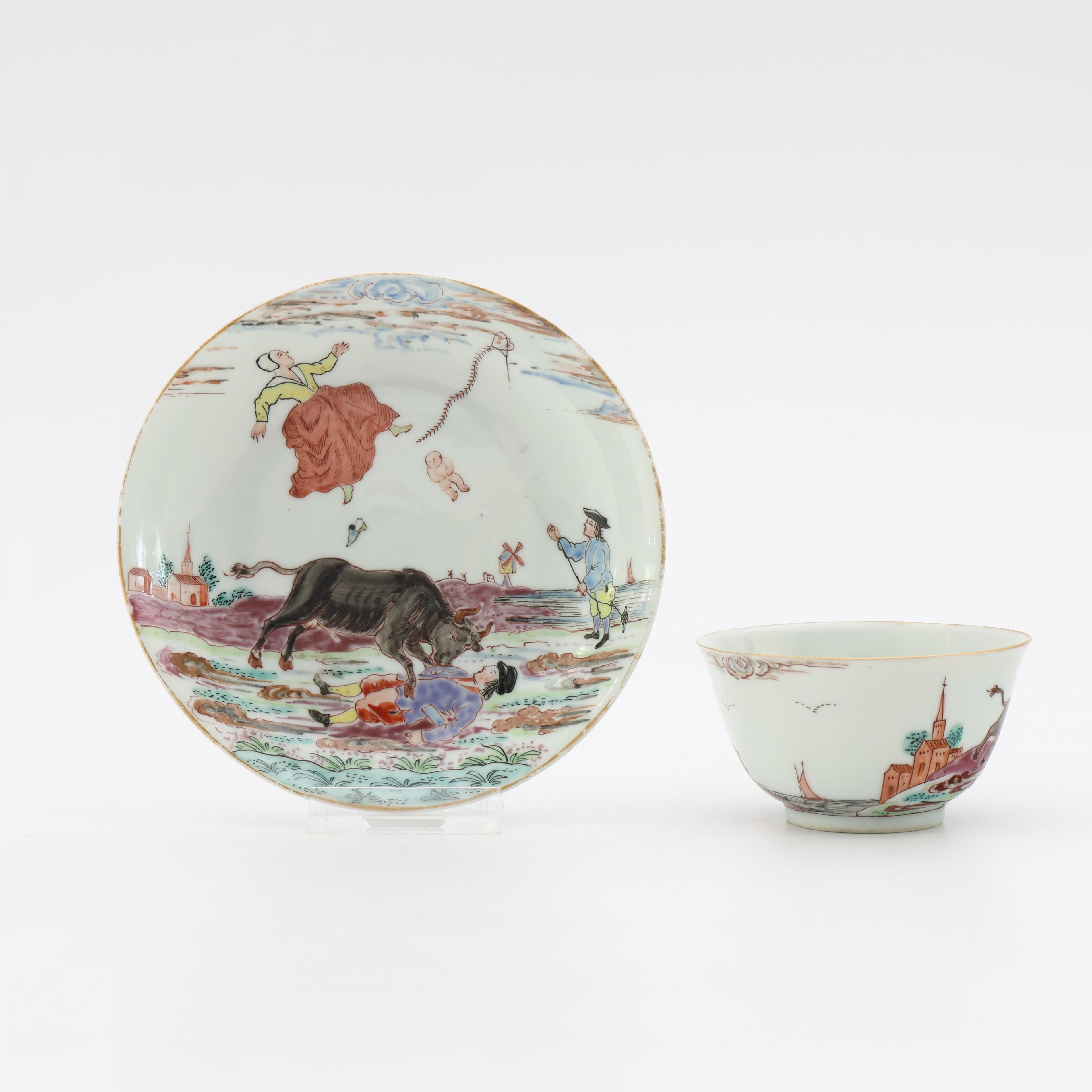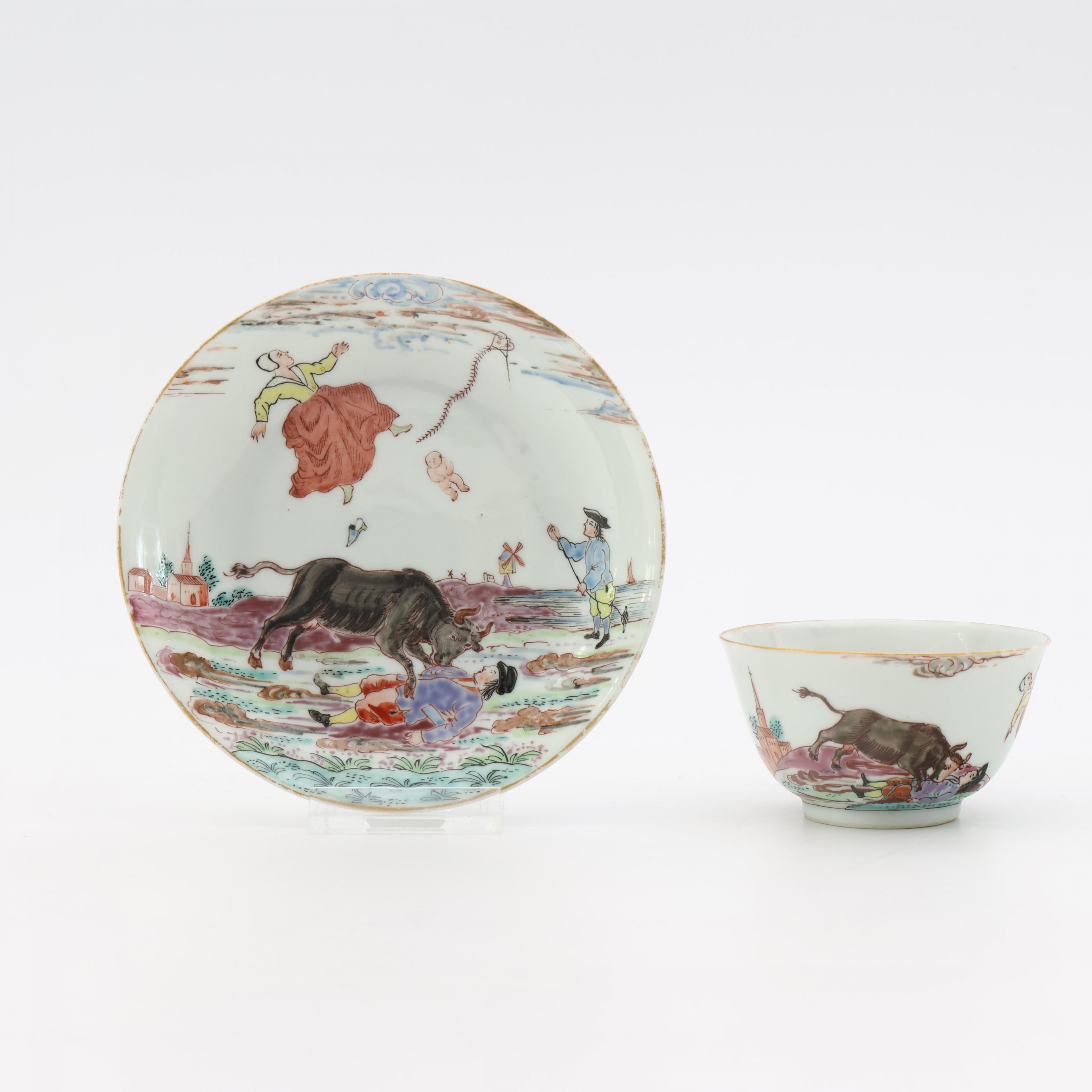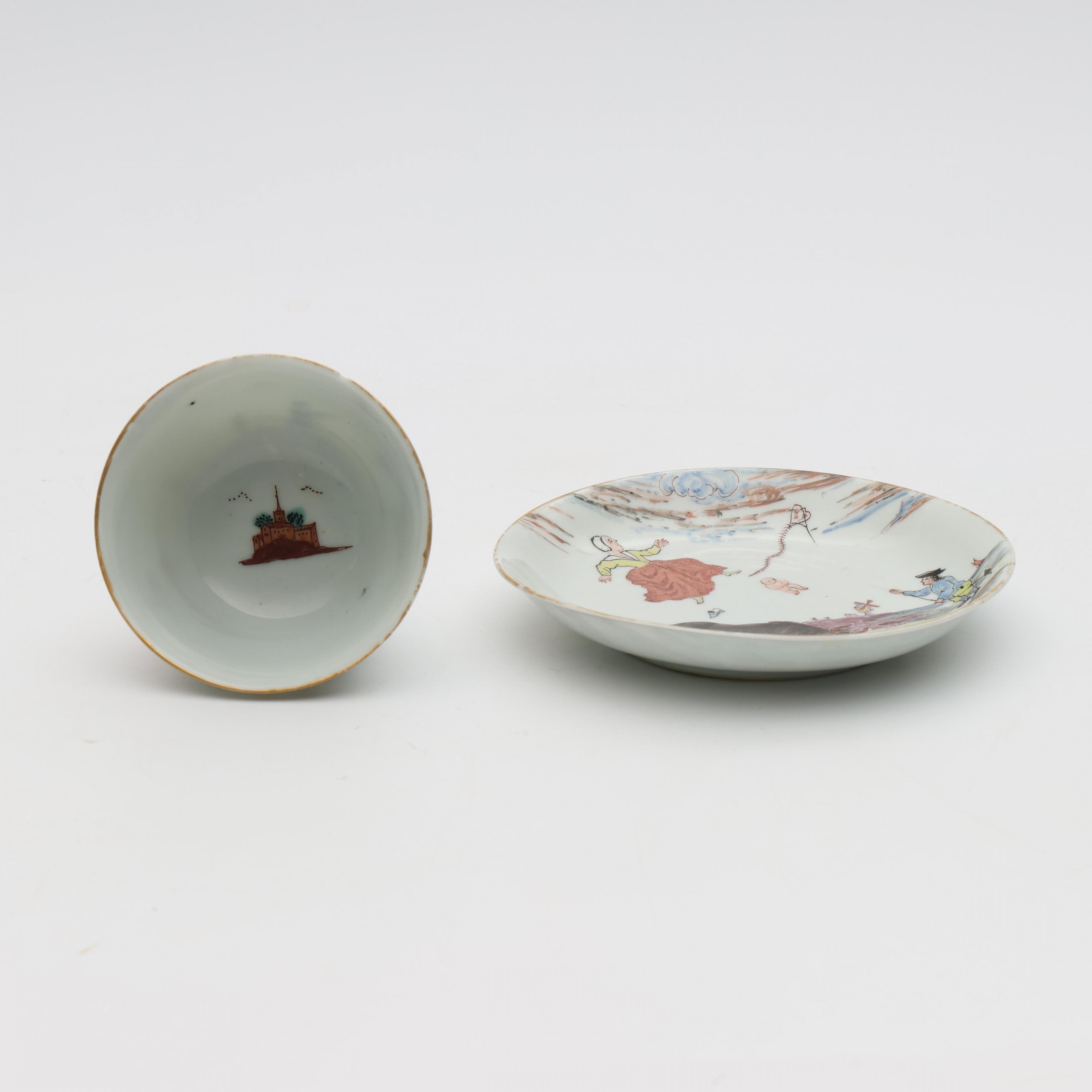 decorated with the story of a farmer and his wife, who, being attached by a bull, gives birth in mid-air, a boy flying his kite is seen on the right and a church and a windmill in the background, the base of both cup and saucer inscribed with the date 29 Augustus 1647 (the cup with minor nick to the rim, otherwise in good overall condition)