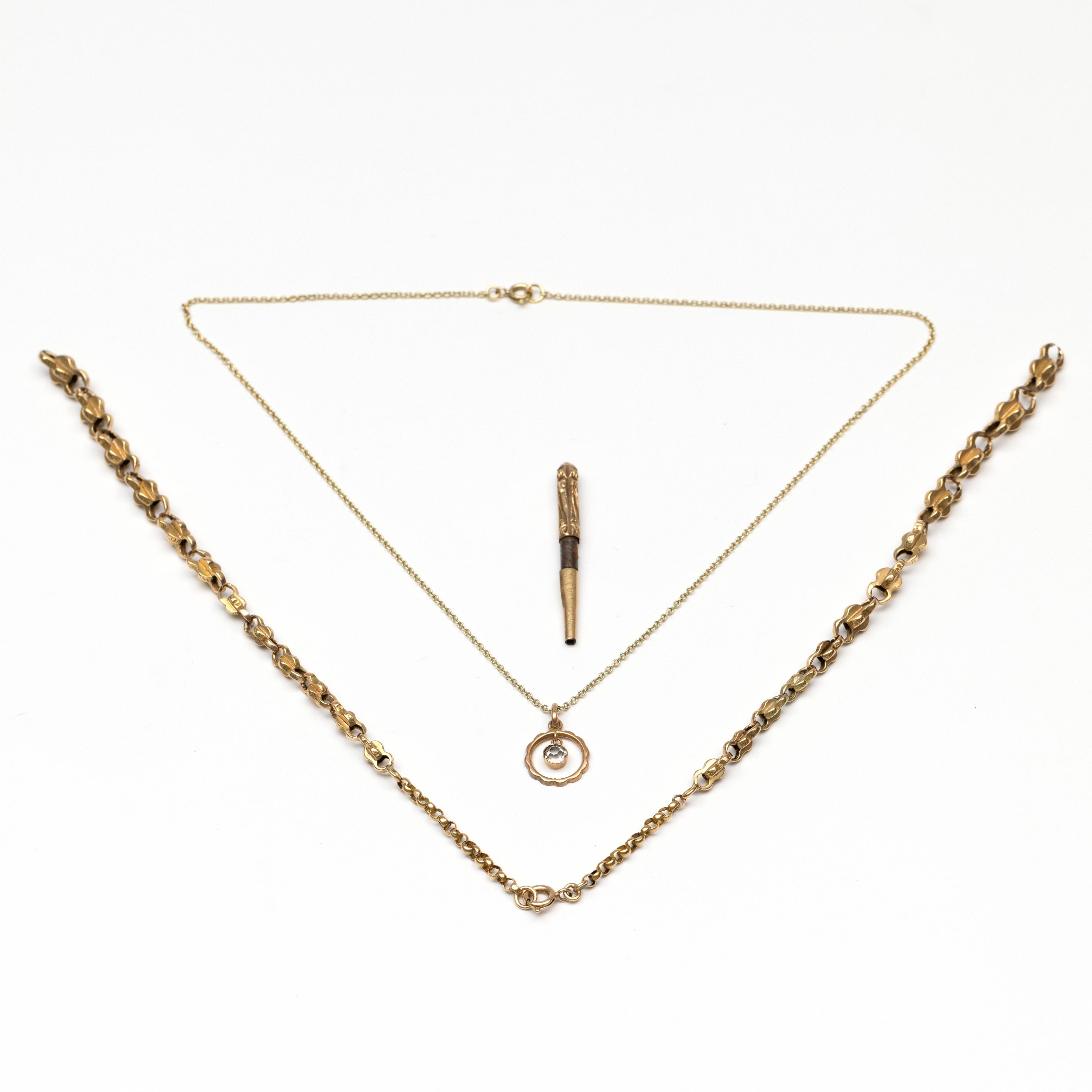 Various 14 k. gold pieces of jewellery, including a pendant with a paste and a watch key.
