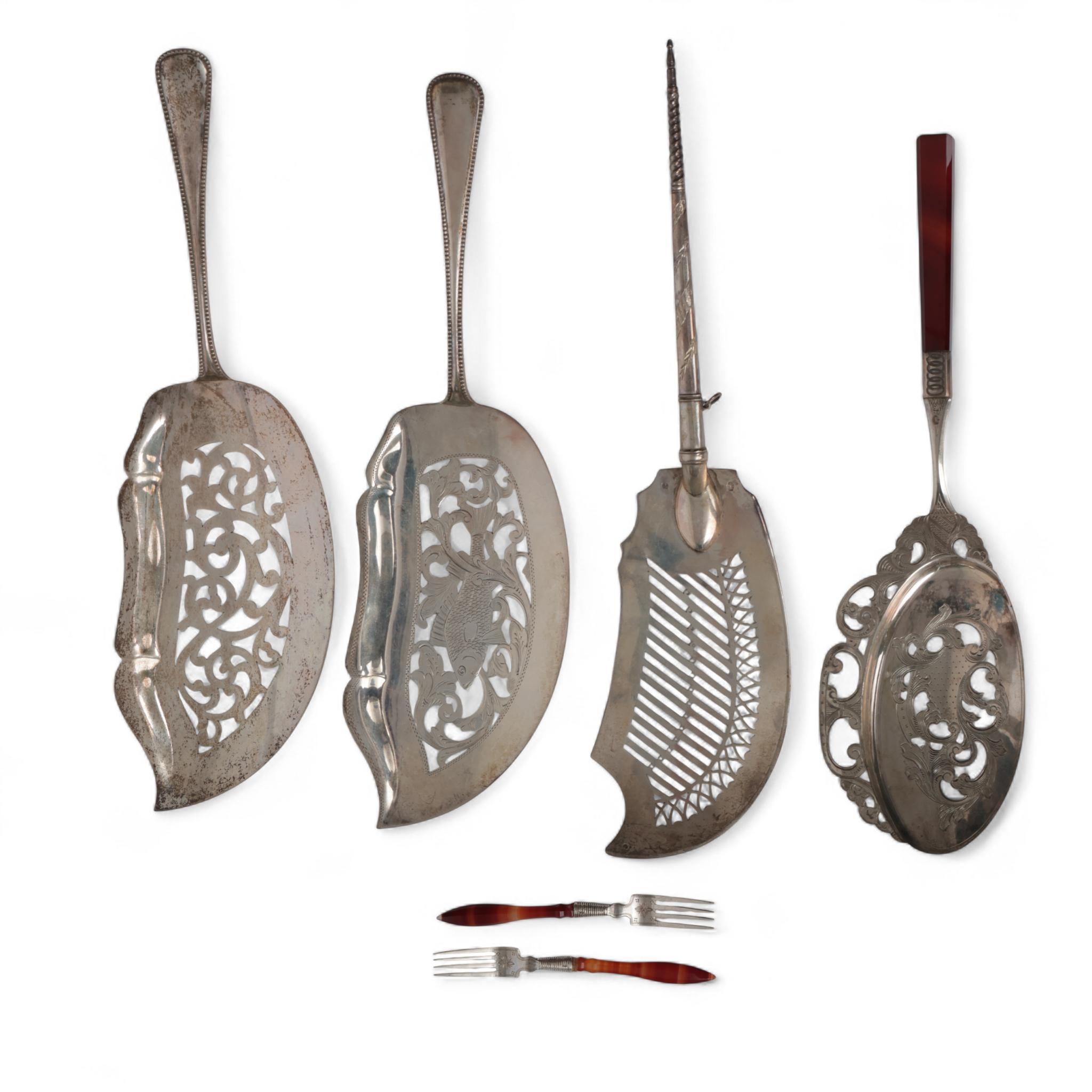 waarbij een schep met kornalijnen heft, mt. A. Kuijlenburg Pz., Schoonhoven 1870, vorkjes mt. W. Lobensteijn Schoonhoven 1875/1918, en drie scheppen mt. Fa. J.M van Kempen Schoonhoven diverse jaarletters, alle 2e gehalte,