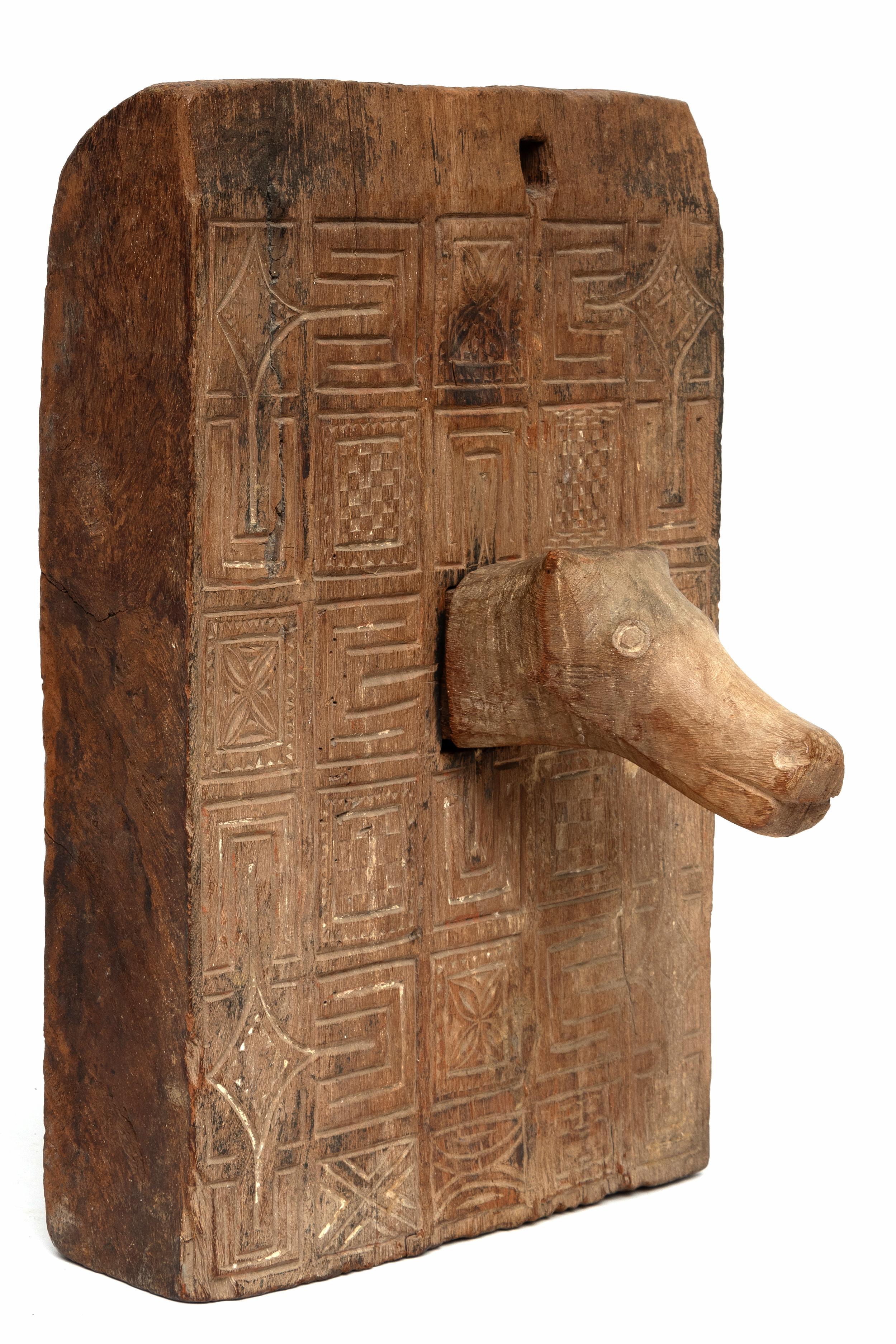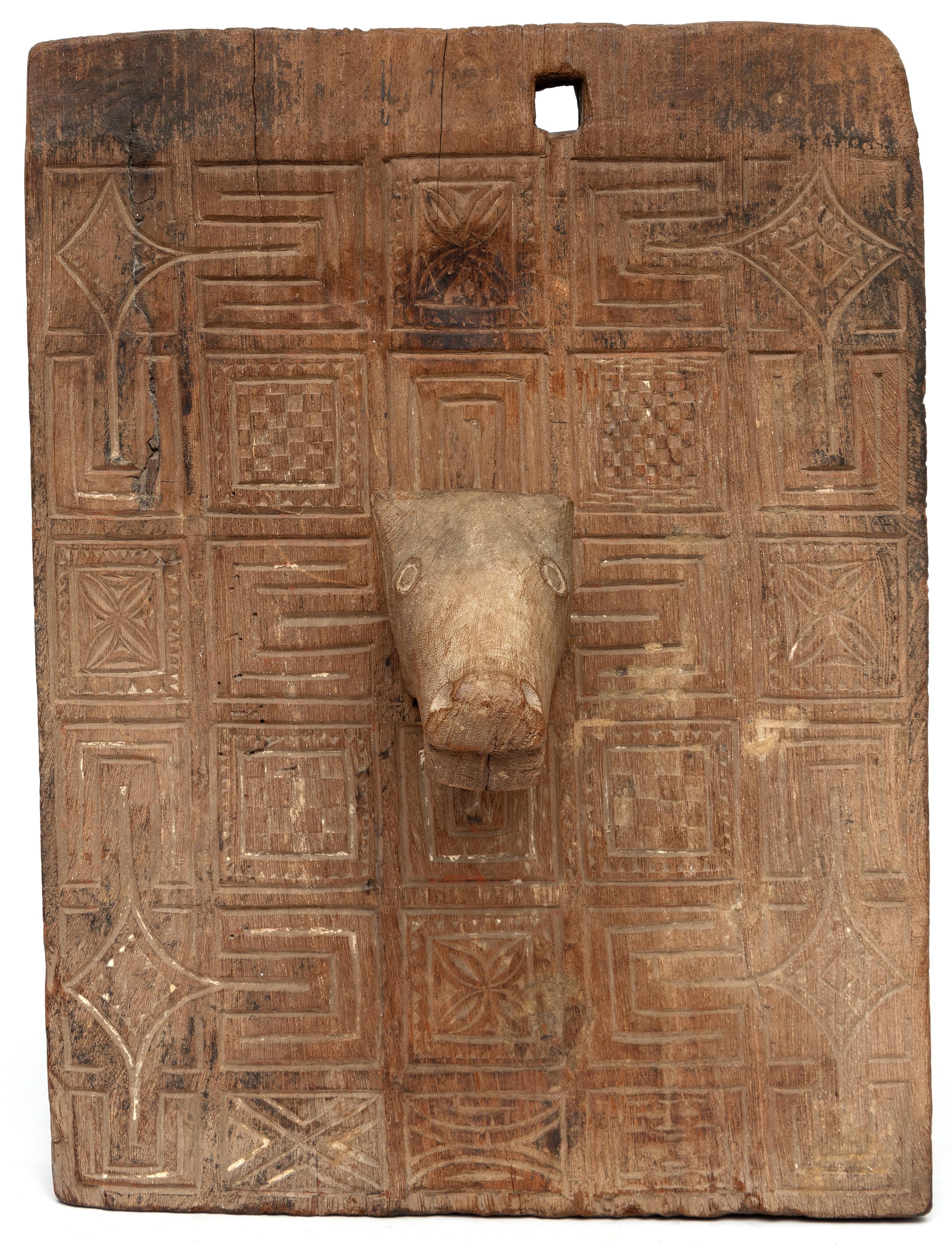 showing a protruding head of a buffalo against a background of rectangular panels in relief.