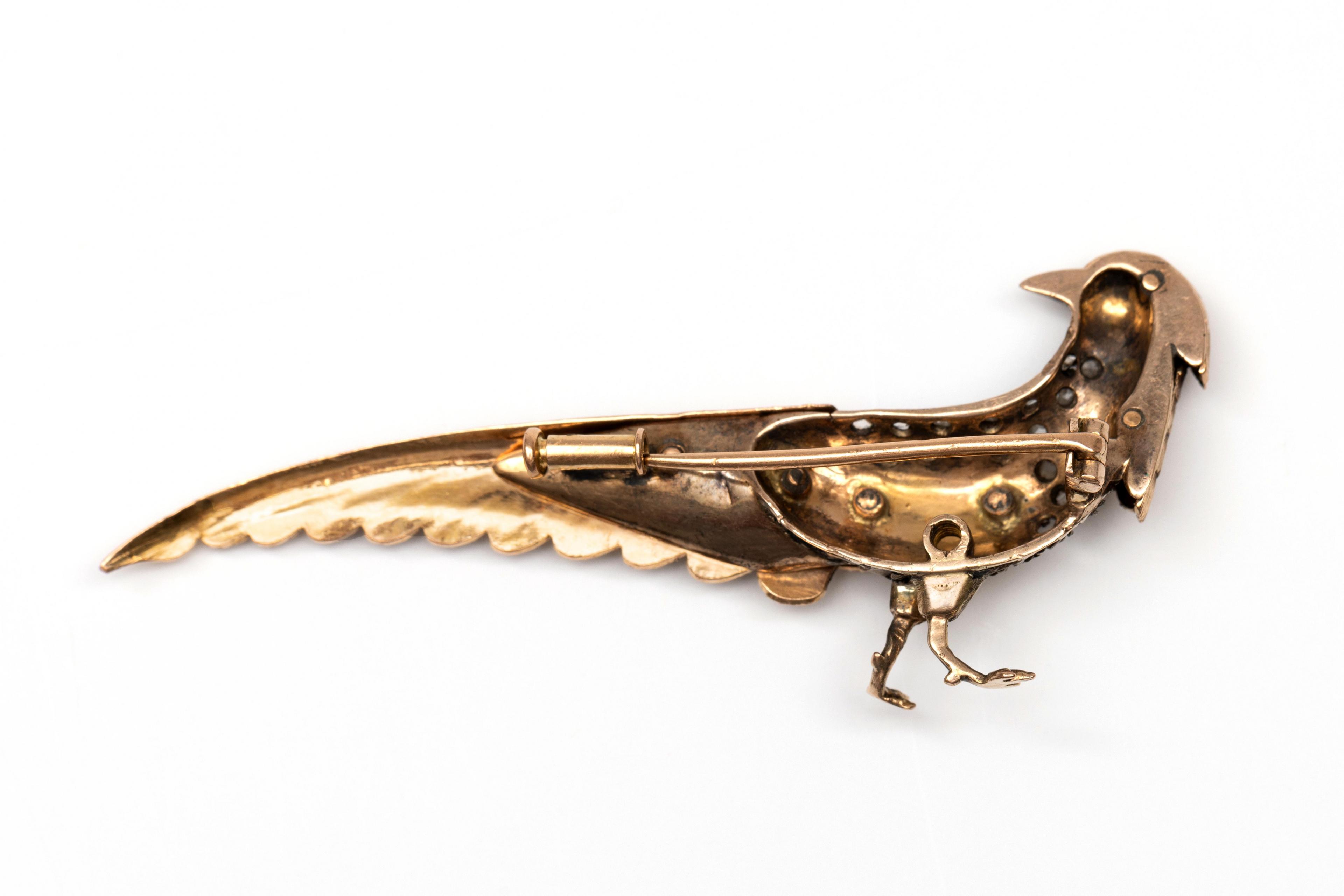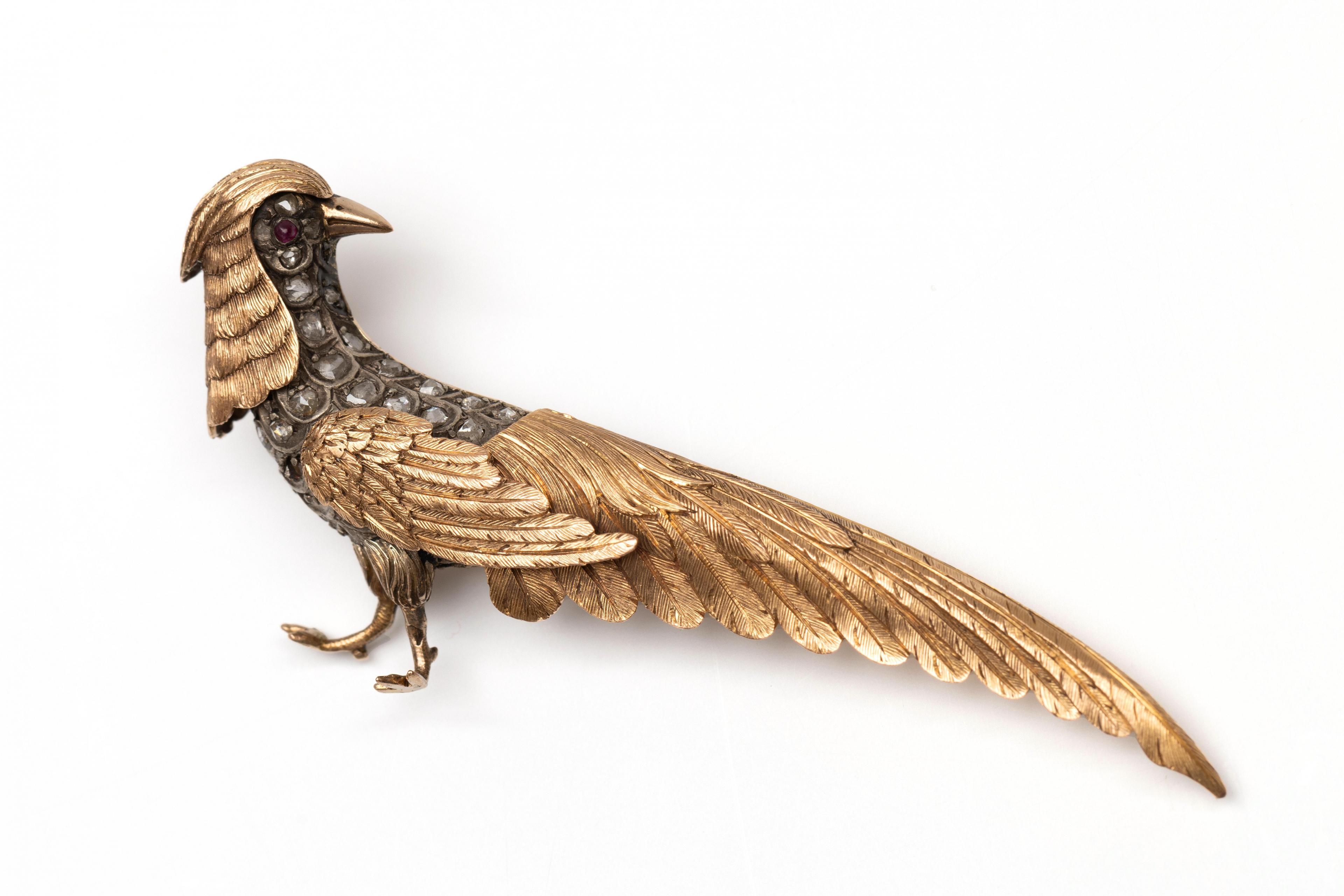 France, 18 k. gold and silver brooch, ca. 1900. In the shape of a pheasant. The body is set with rose-cut diamonds, the eye with a small cabochon-cut ruby.