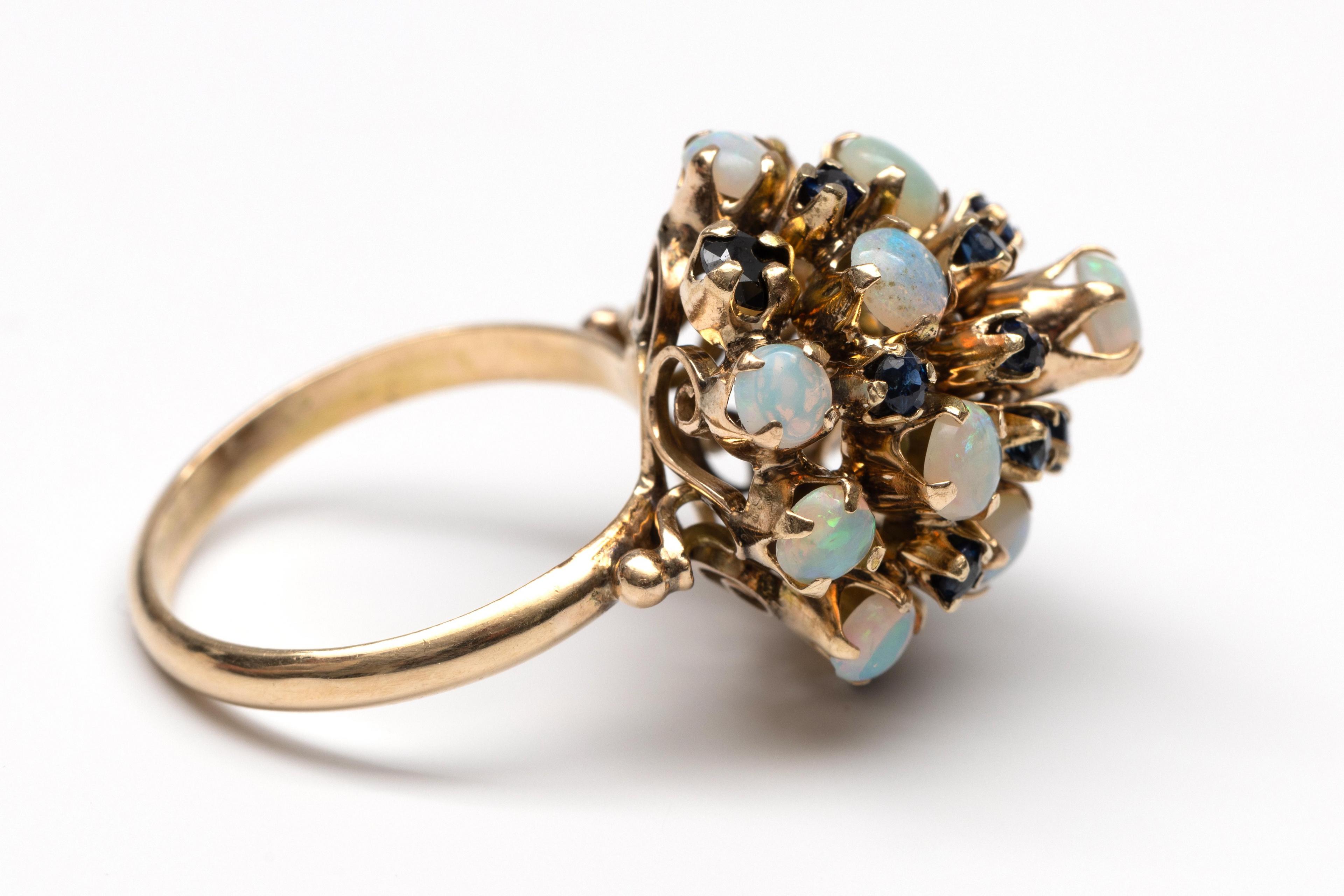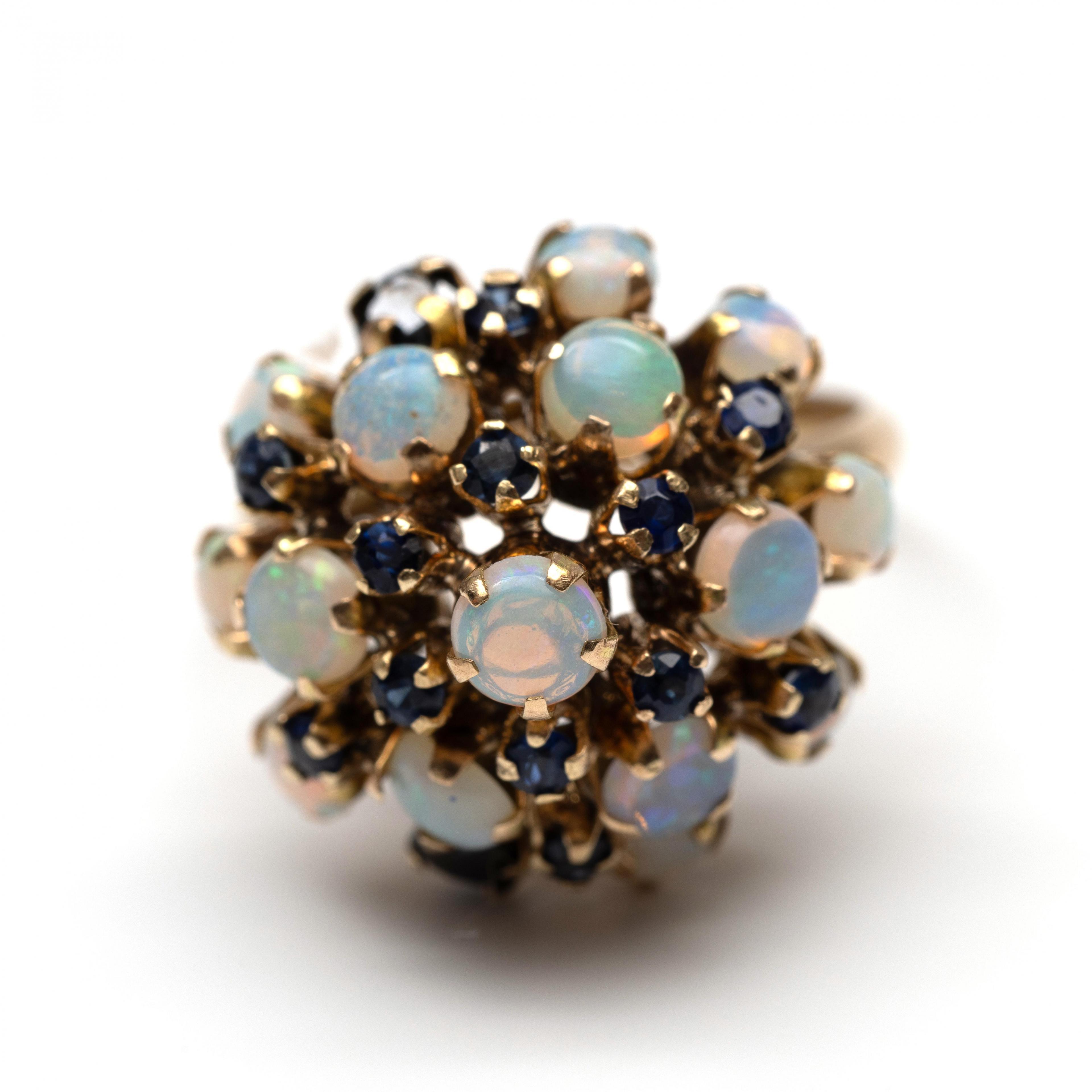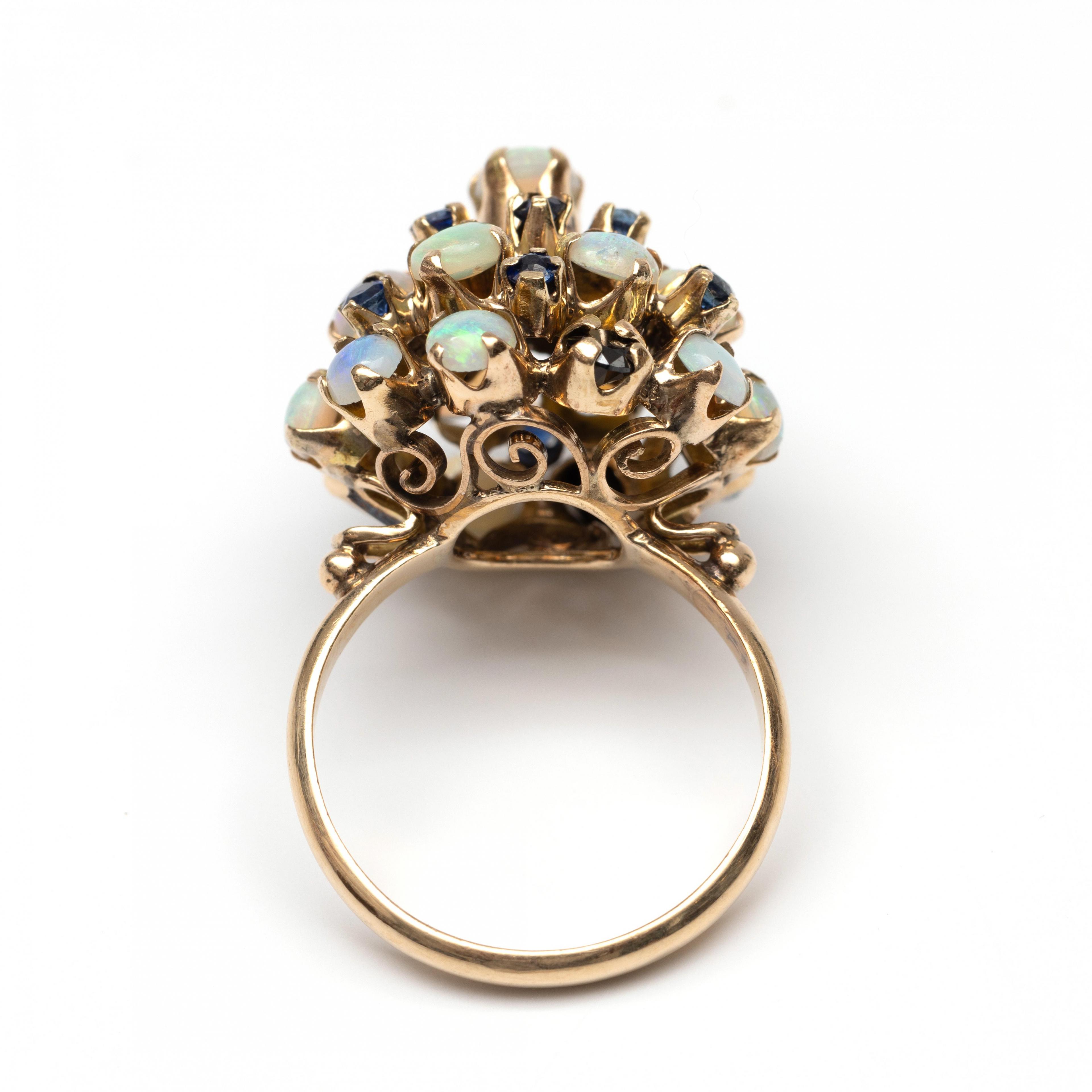 Gold cocktail ring. Set with cabochon-cut opals with small round faceted blue sapphires in between.