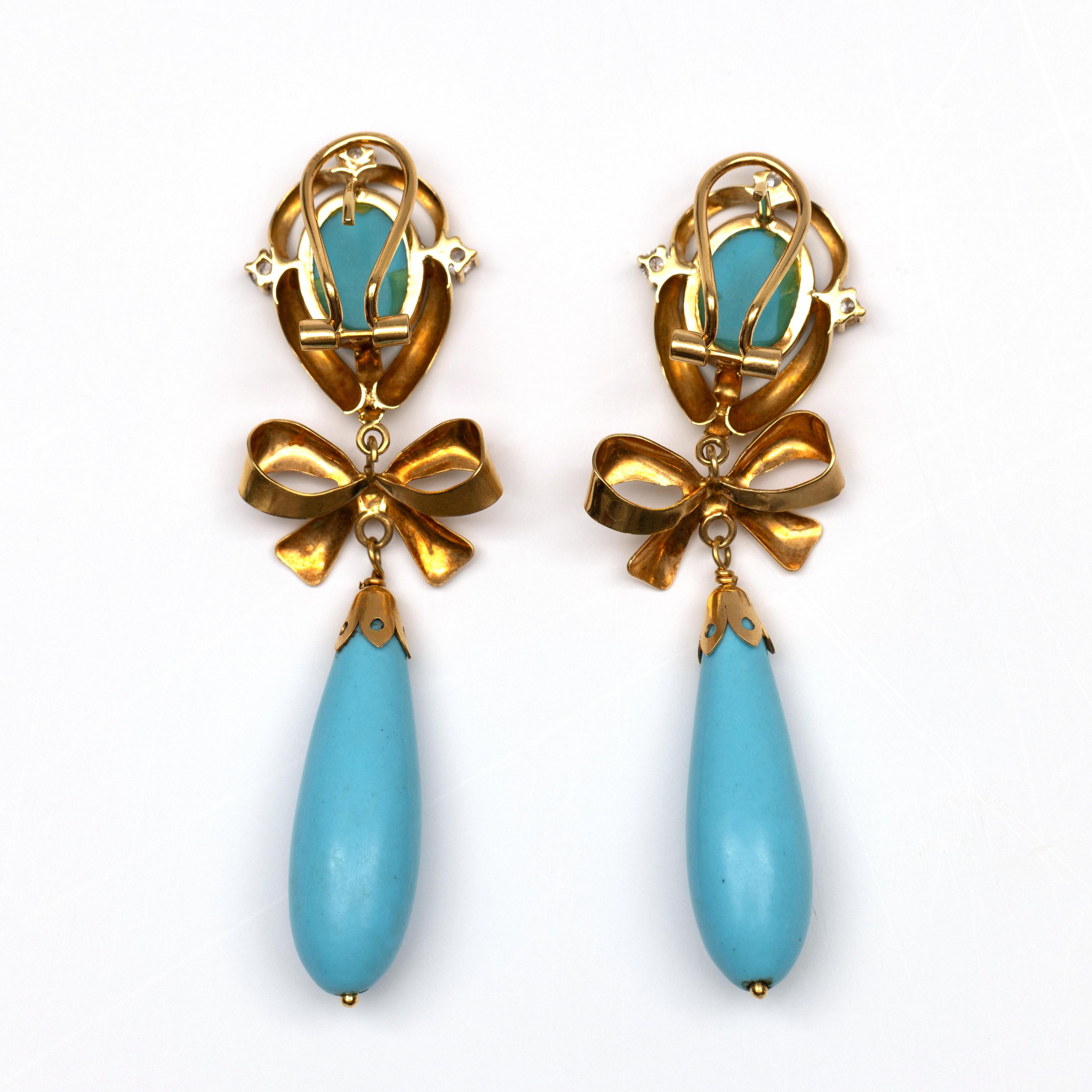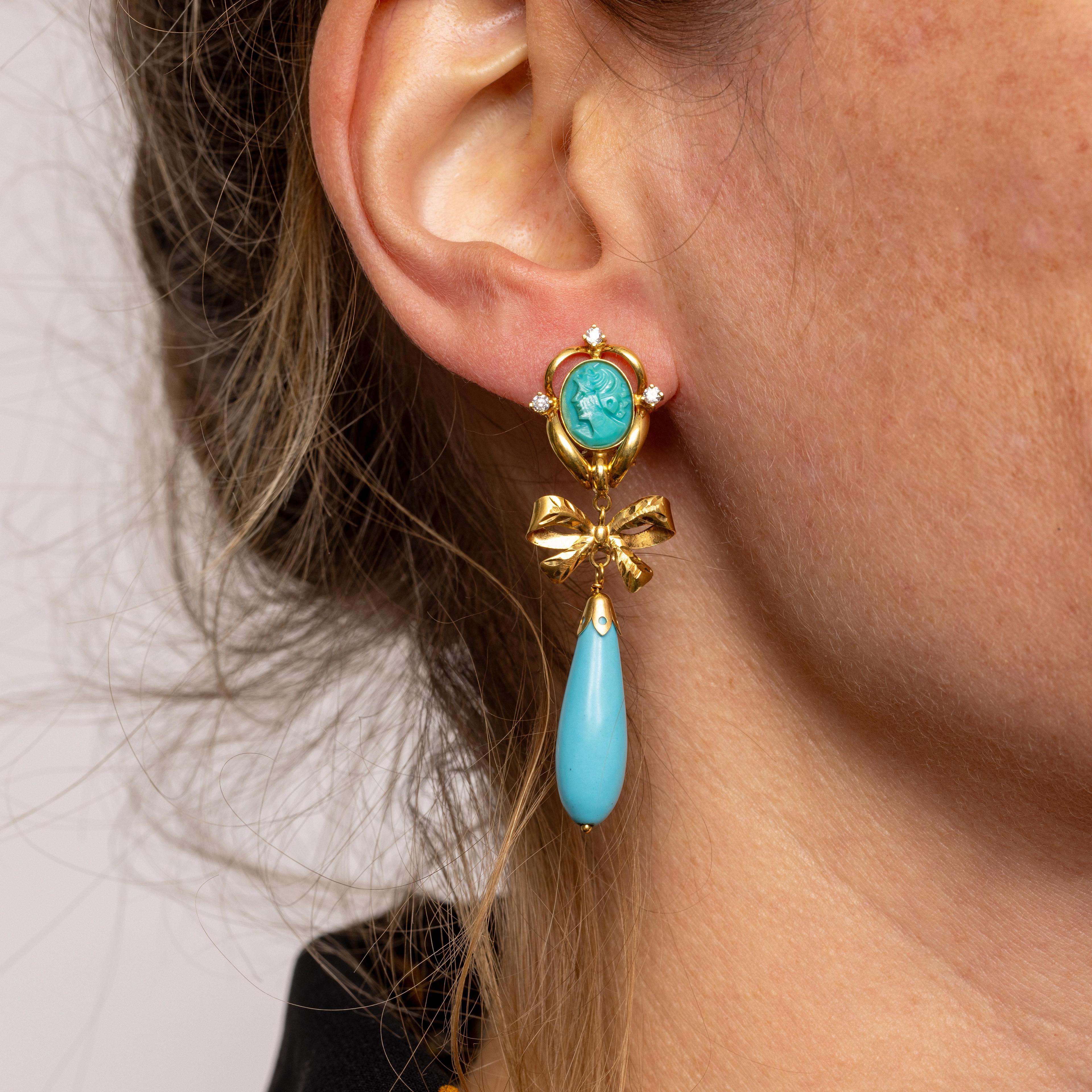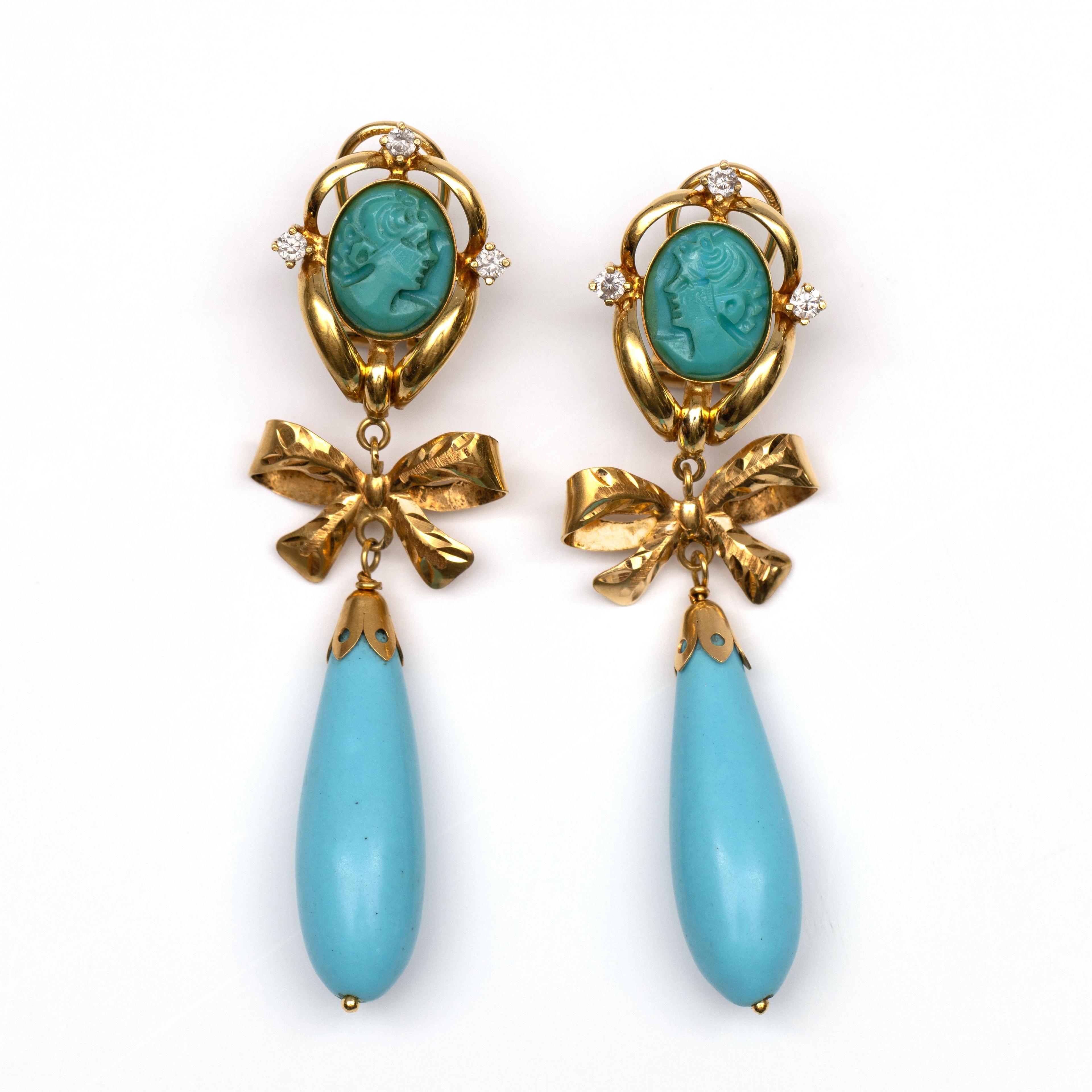Gold stud earrings, the top with an oval cameo of imitation turquoise with a portrait of a lady in profile, in an elegant border set with three imitation diamonds, below which a bow and a pampel of imitation turquoise.