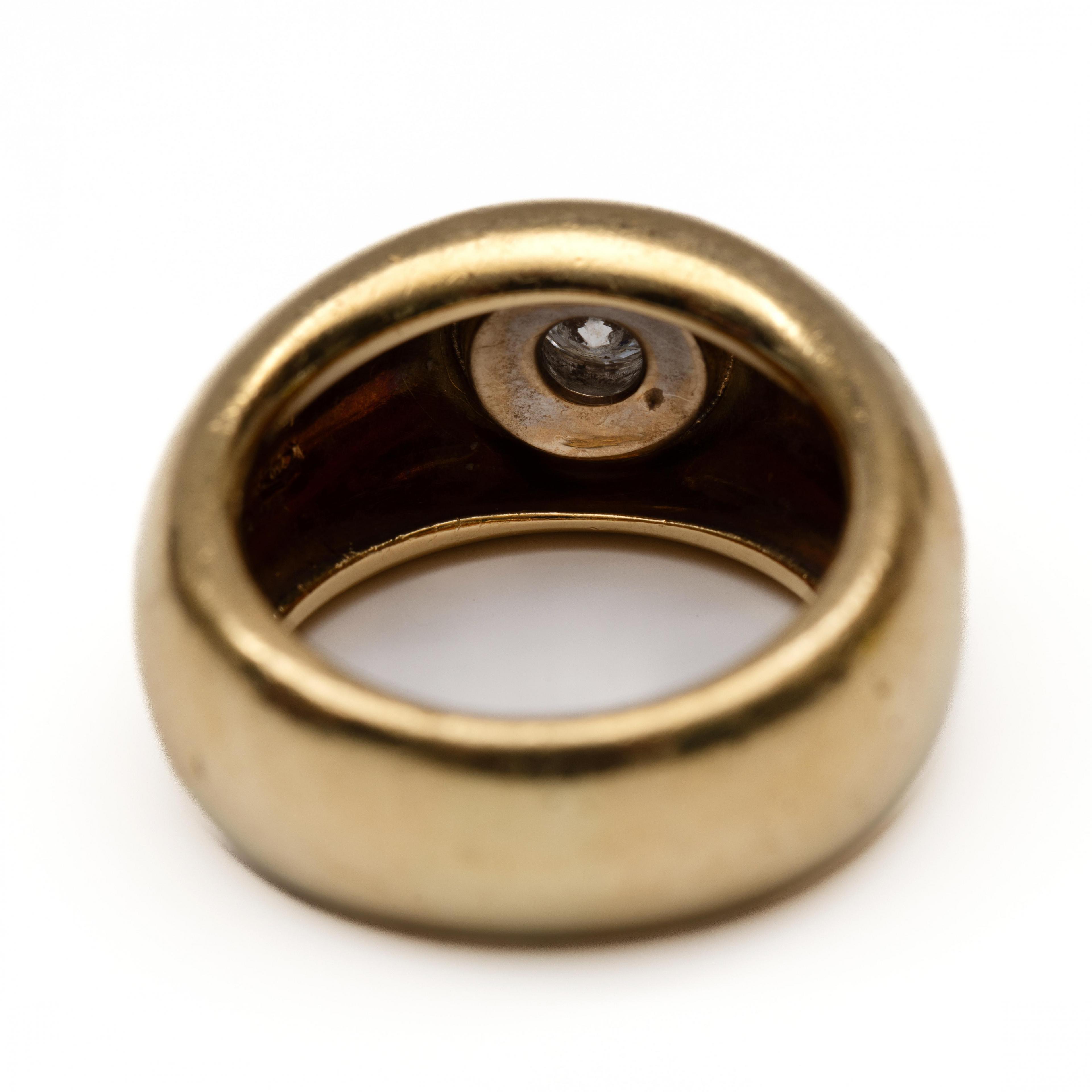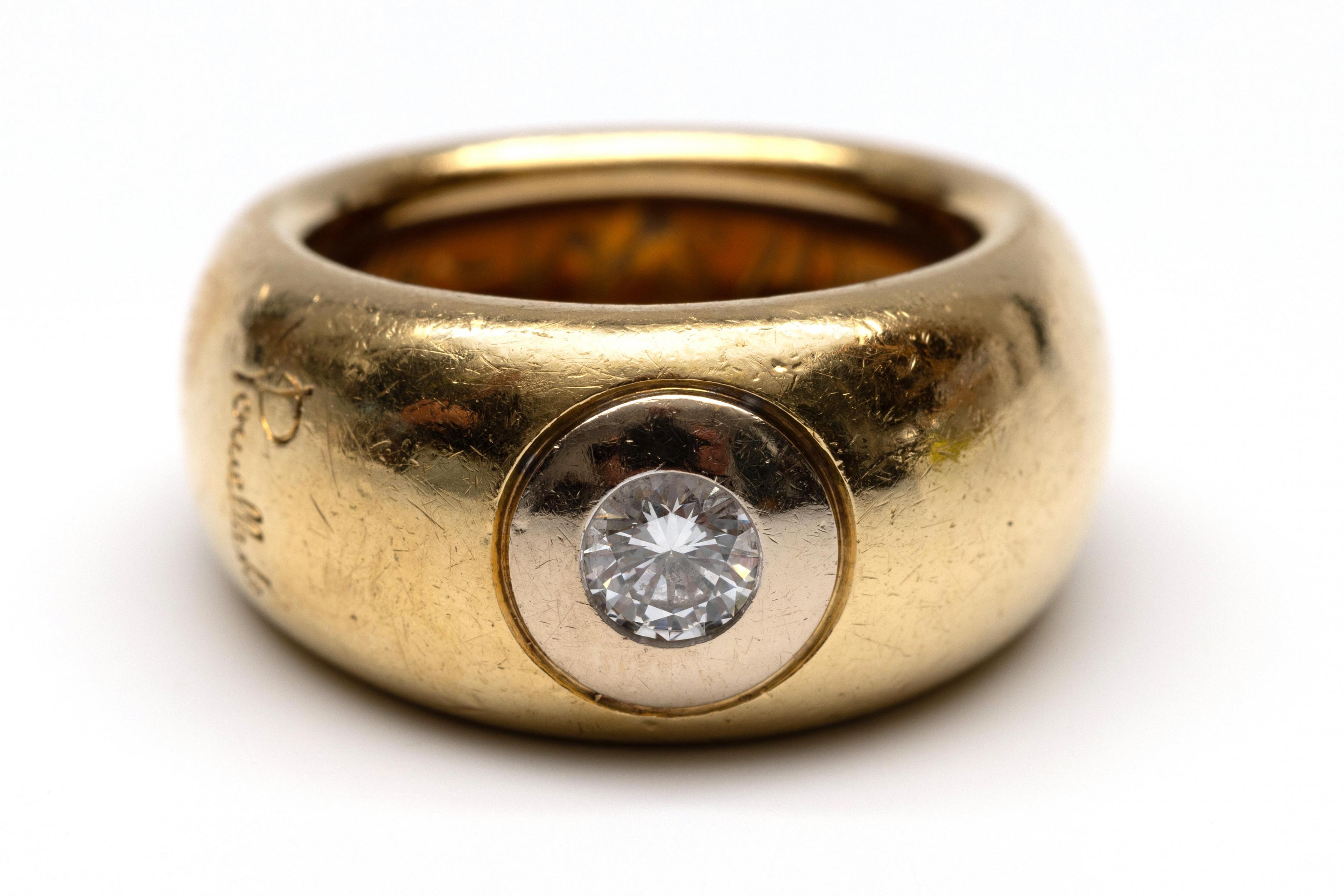Pomellato, 18 k. gold ring. The top with a white gold circle with a brilliant-cut diamond of approximately 0.24 ct. The inside with maker's mark J. Steltman, The Hague, 1968-present.