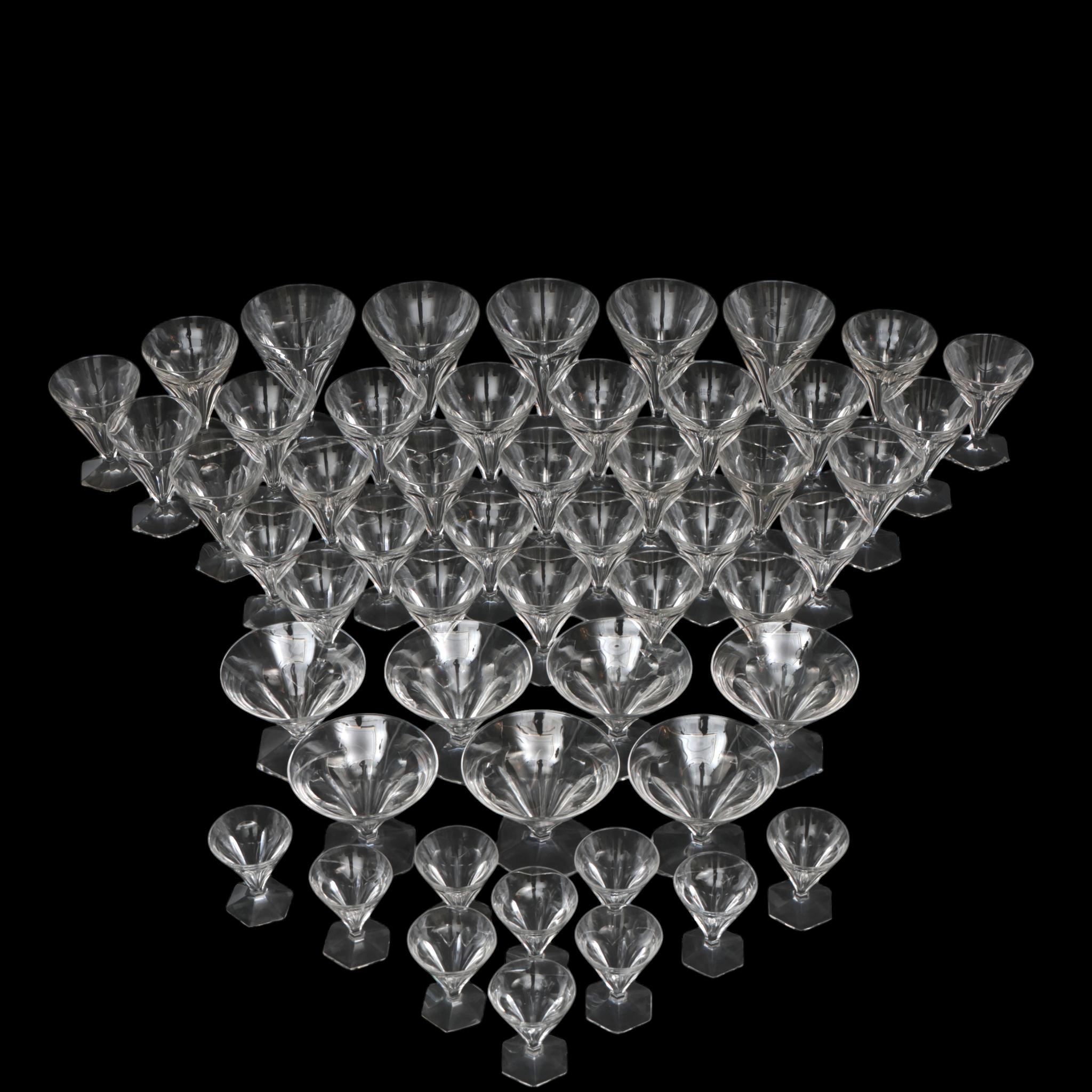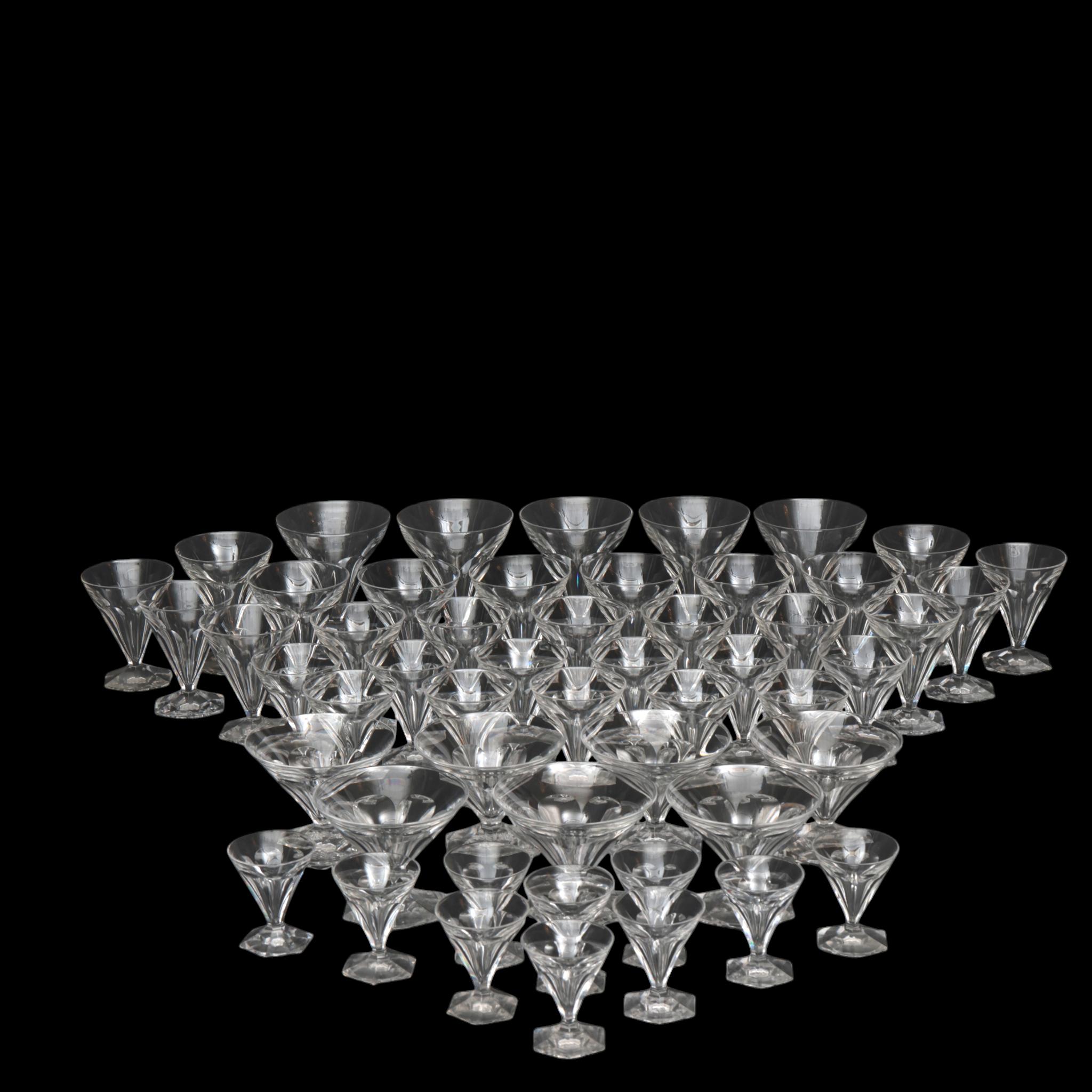 Bestaande uit vijf rode wijn glazen, acht witte wijn glazen, zeven champagne glazen, elf sherry glazen, elf bitter glazen en tien borrel glazen.