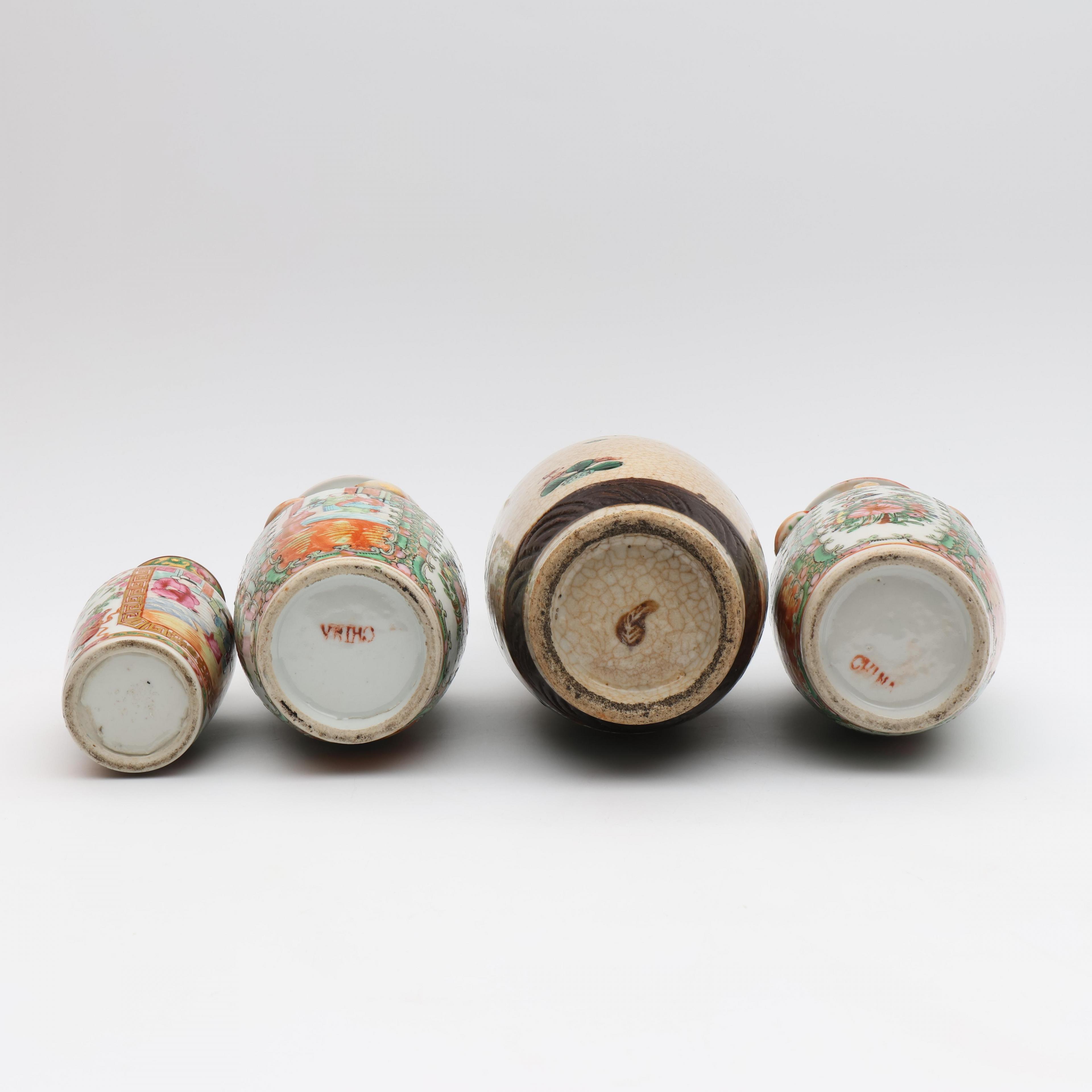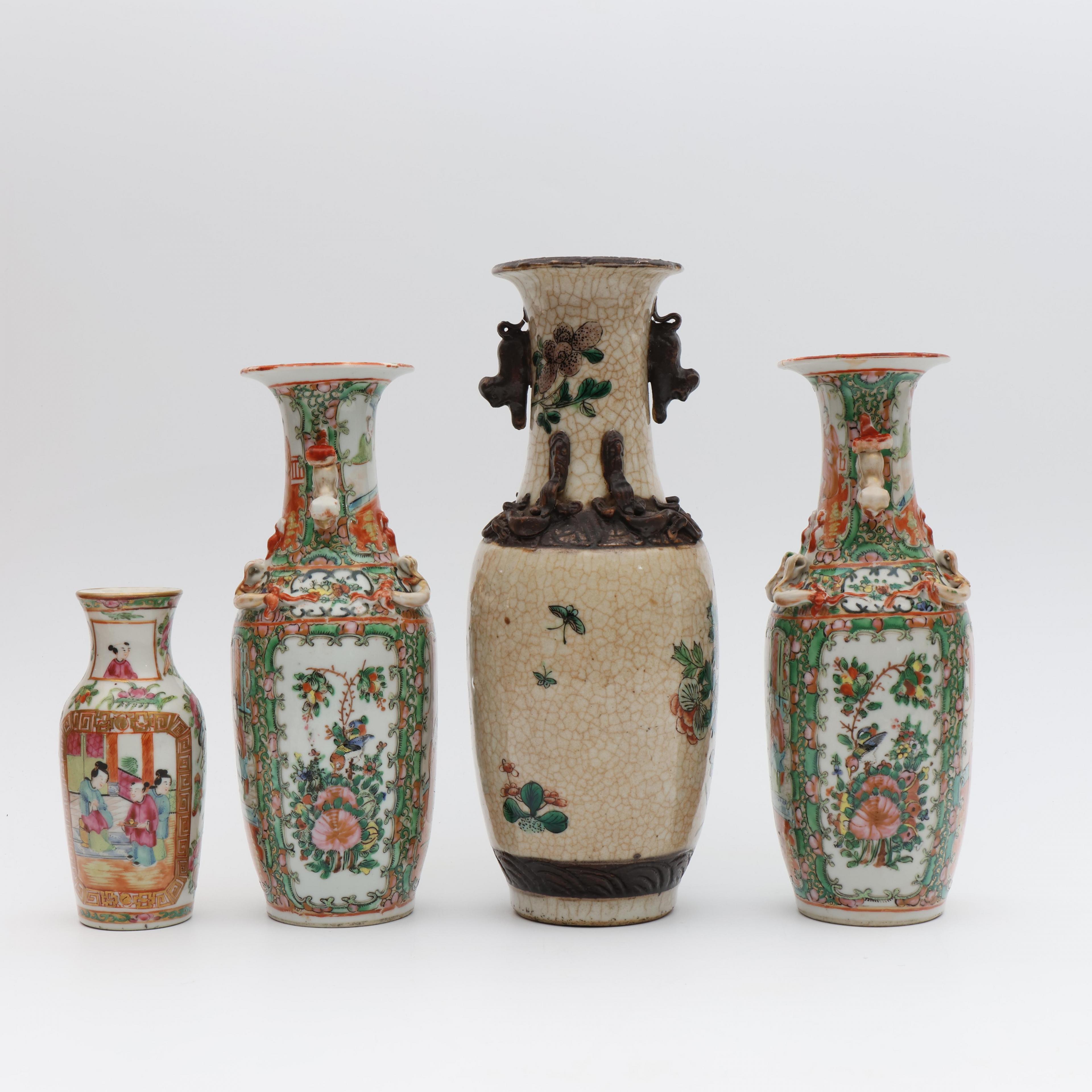 comprising a pair of Canton vases, a single Canton vase, and a famille verte Nanking porcelain vase (some damages)