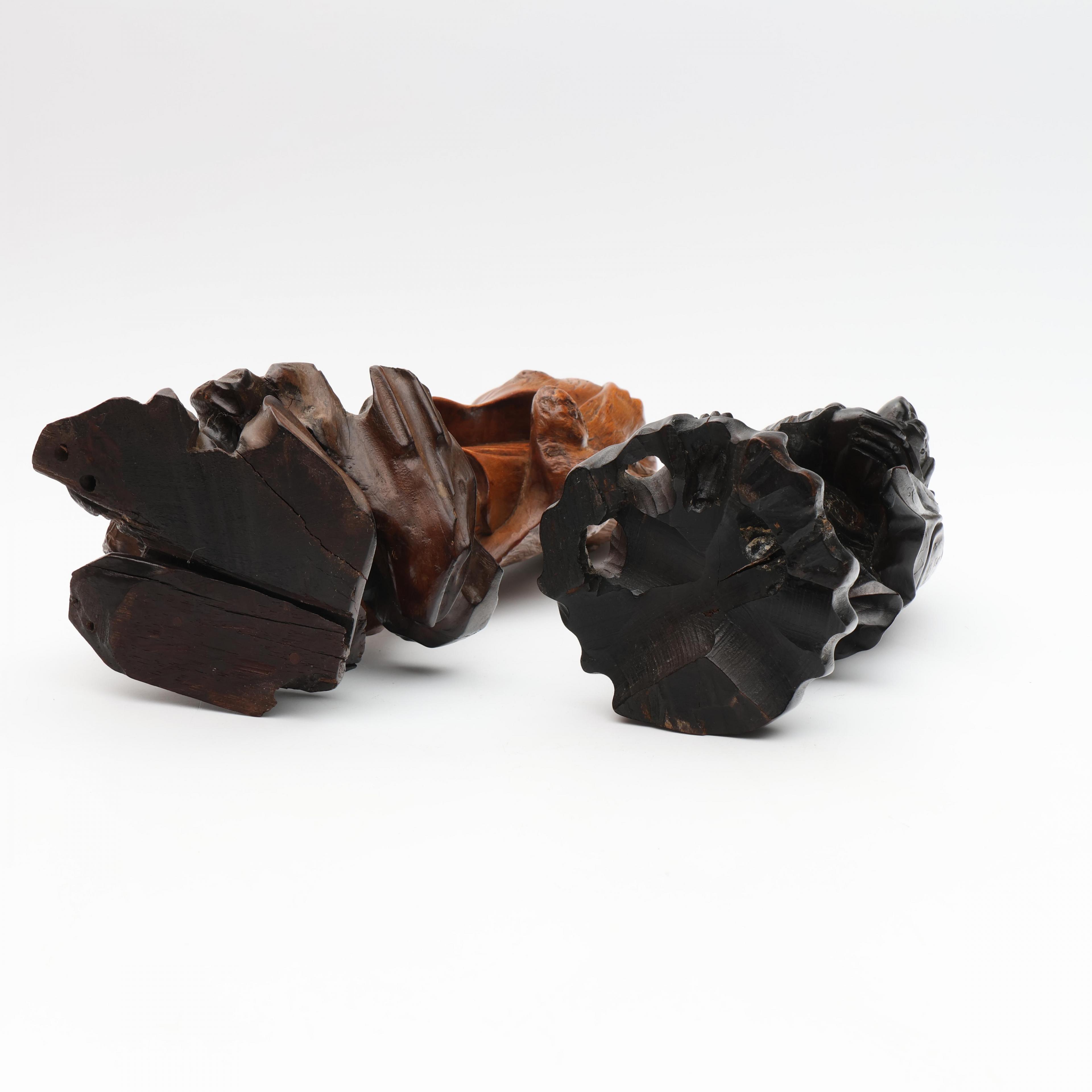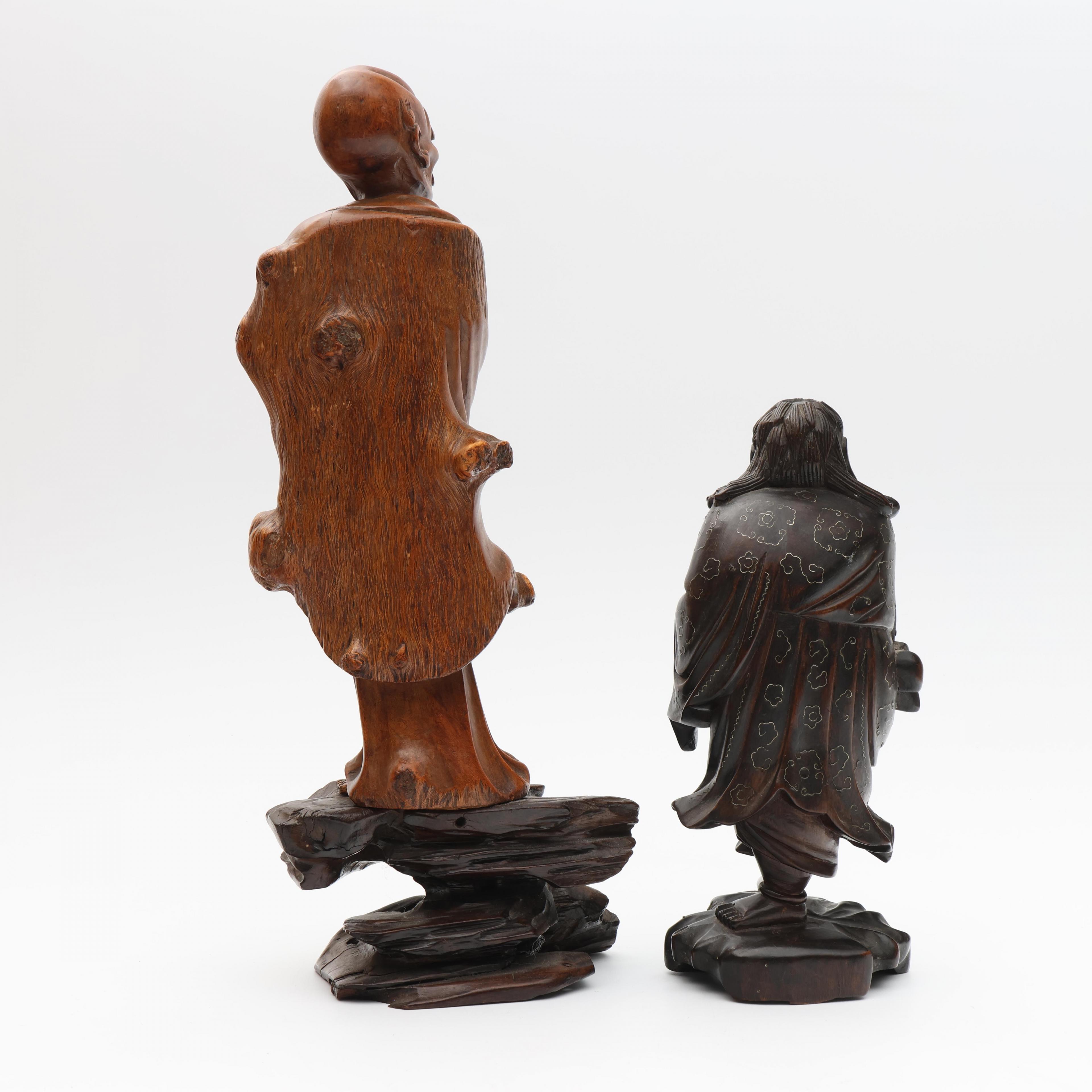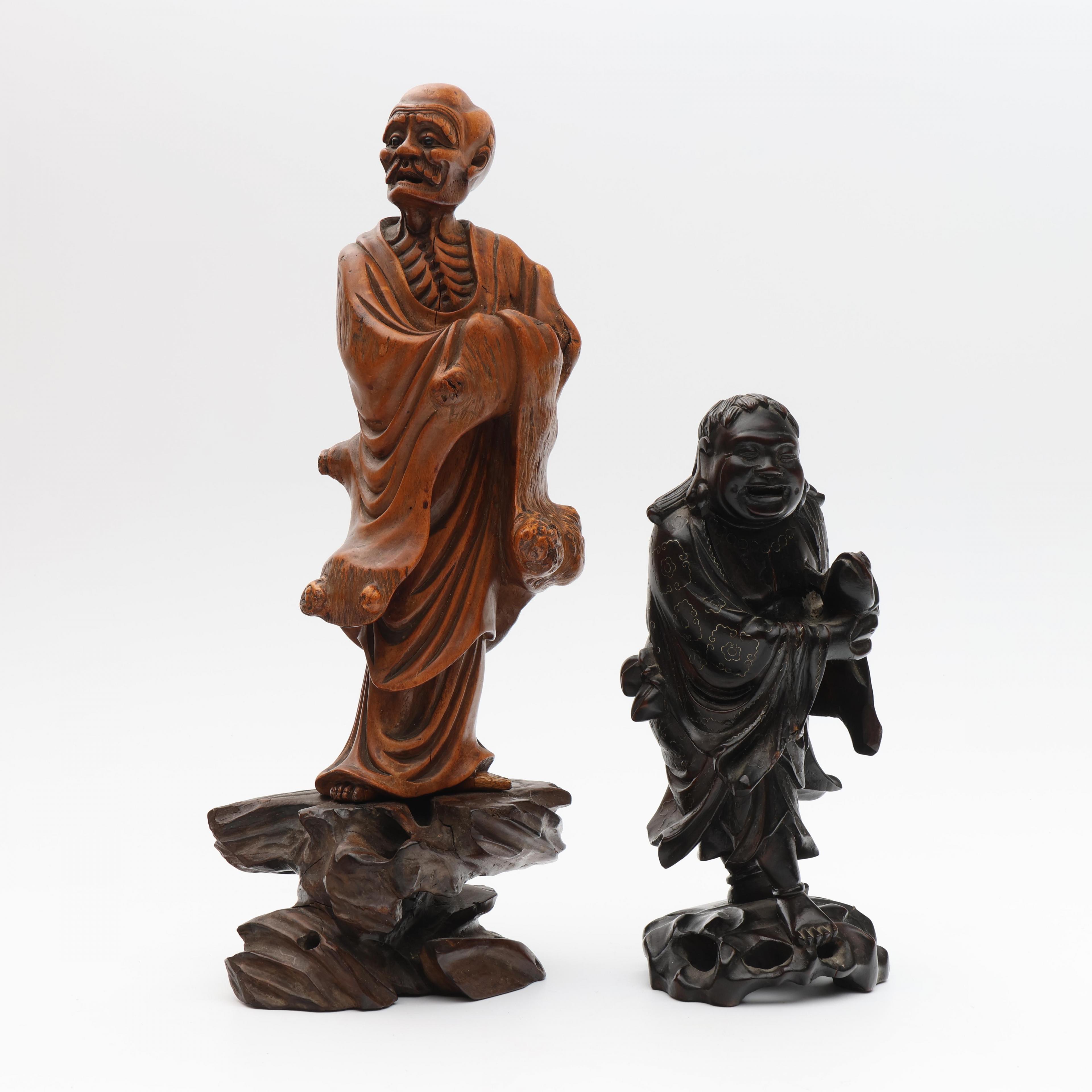 one with silver-wire inlay of Liu Hai and his three-legged toad, the other of an emaciated monk (some wear and some splits to the wood)
