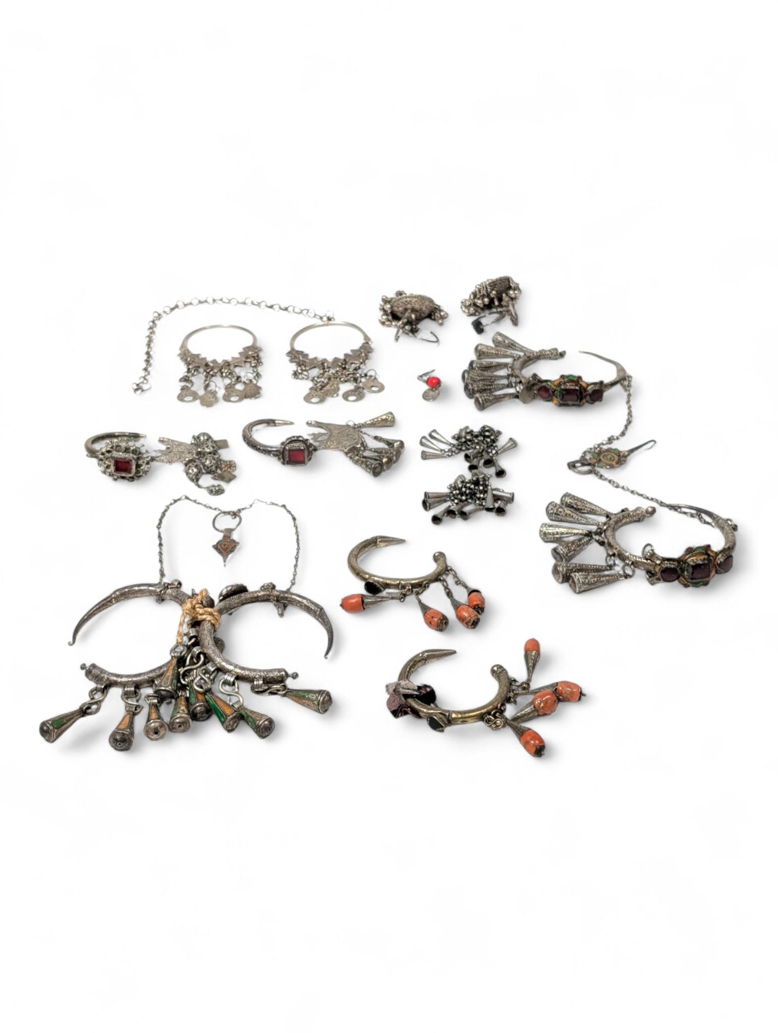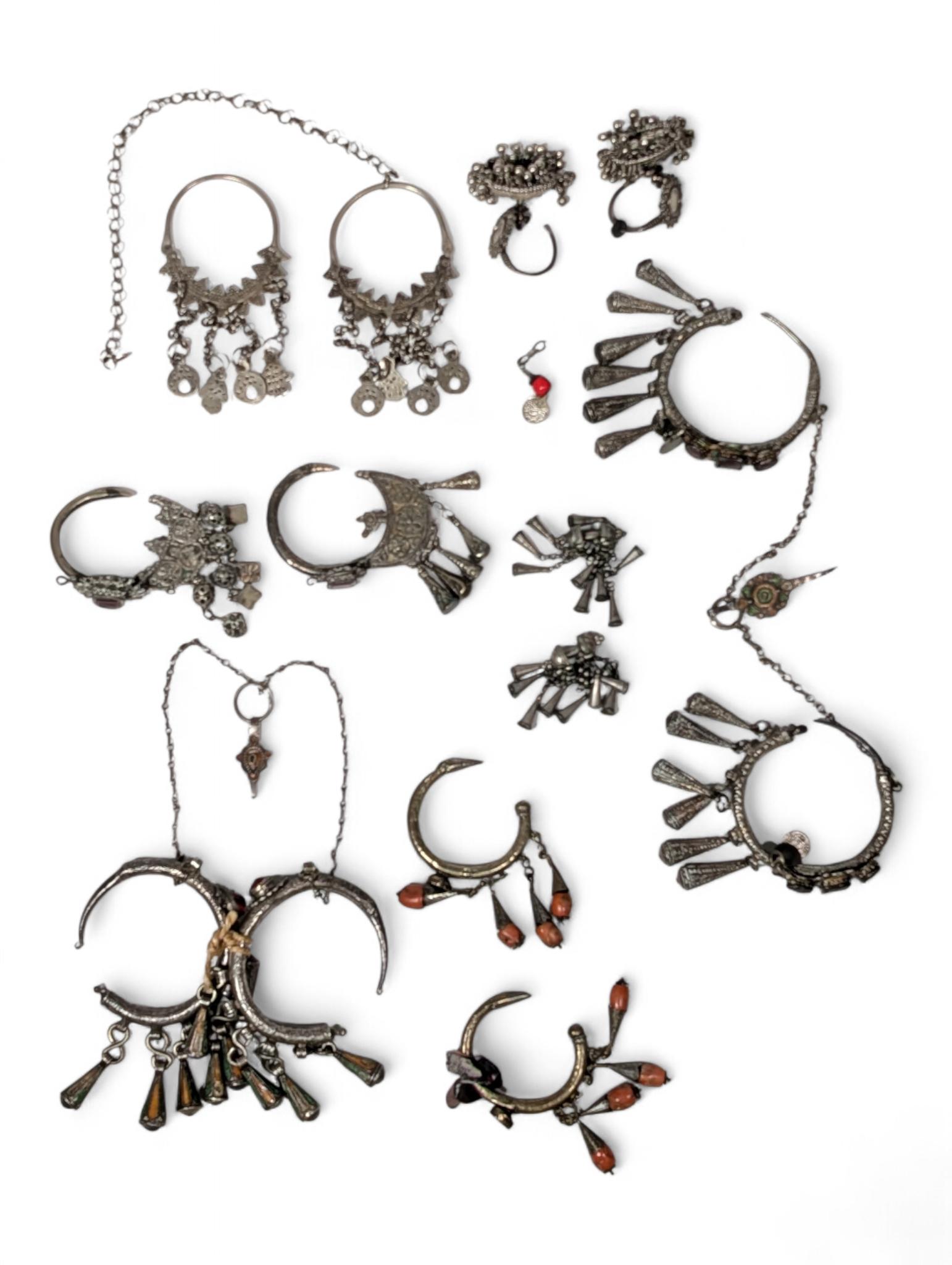 North Africa, a collection of nine silver alloy - metal ear ornaments;