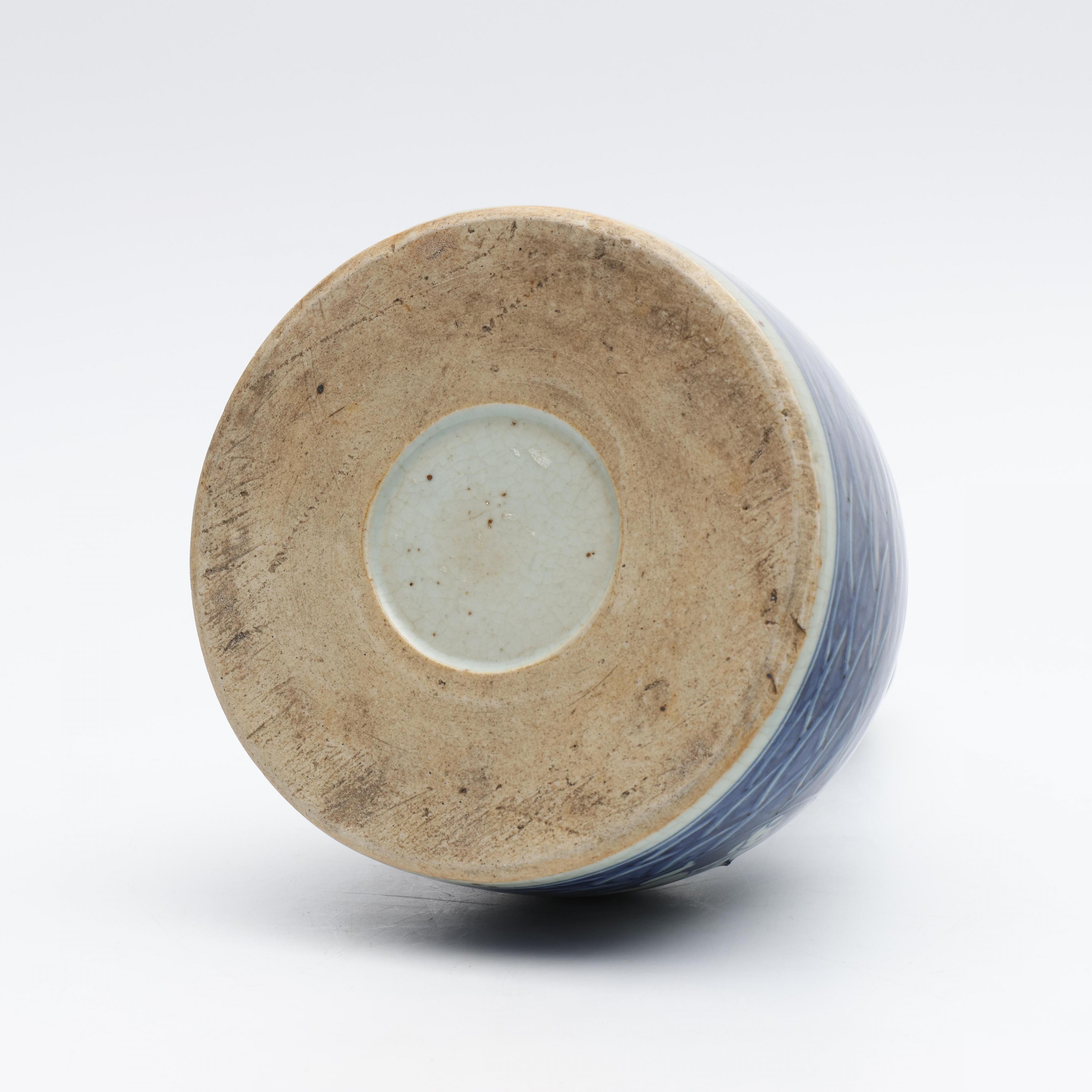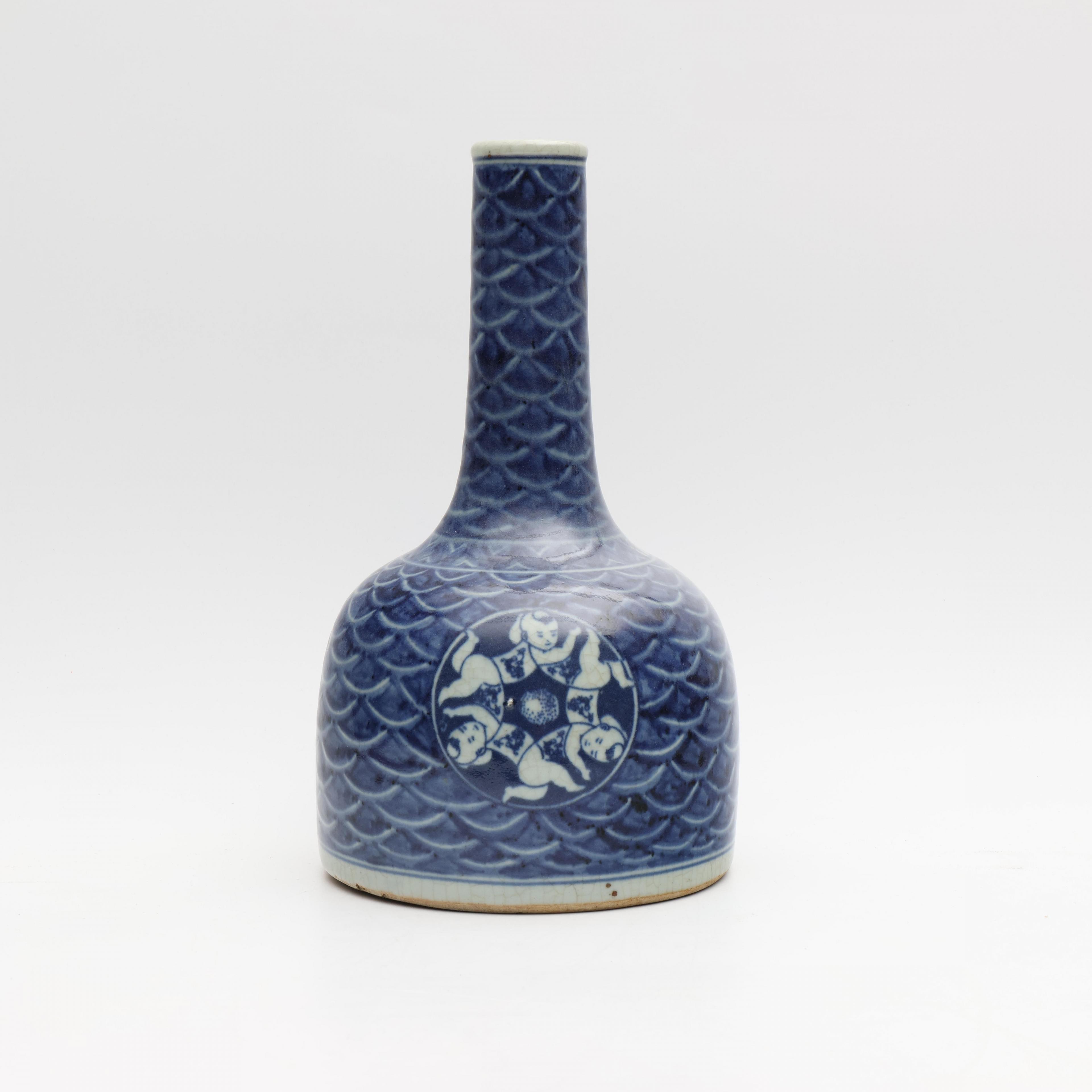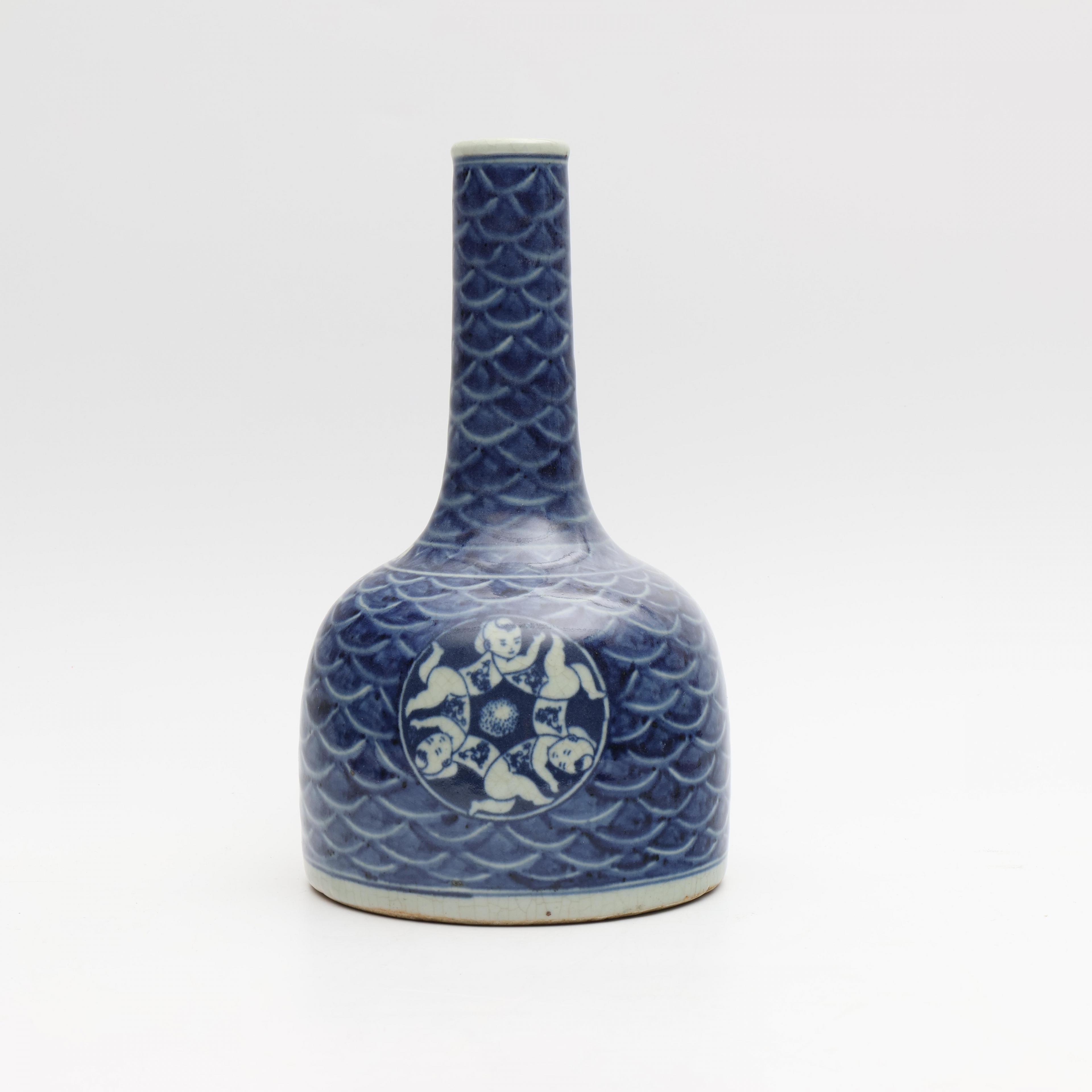 decorated with two panels of boys on a geometrical ground, the shoulder with an apocryphal Jiajing mark (crackled glaze)