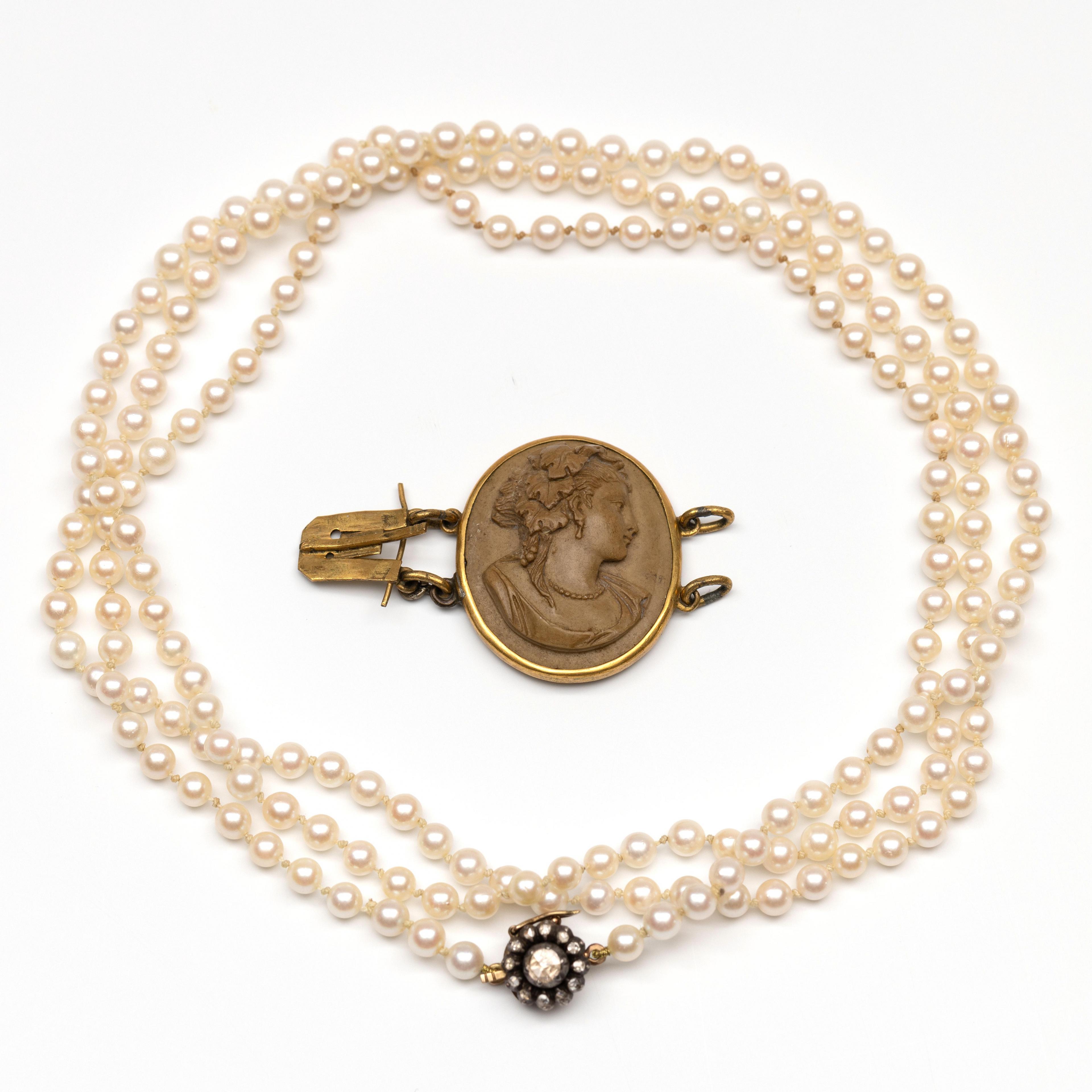 Cultured pearl necklace. The pearls measure 3.5-4 mm in diameter. On a 14 k. gold and silver rosette clasp set with a rose-cut diamond. It also includes a base, defective clasp with a lava cameo depicting a lady in profile.