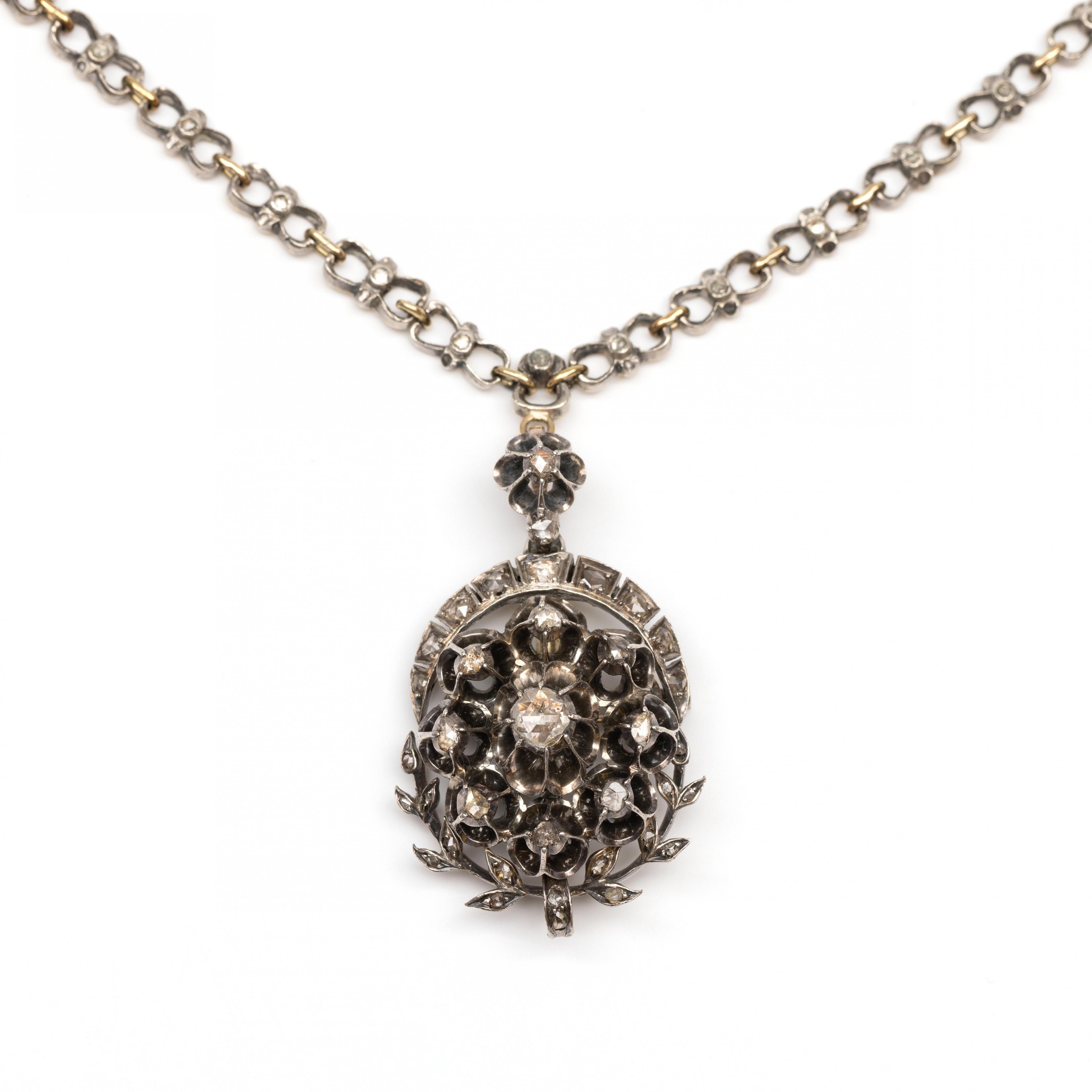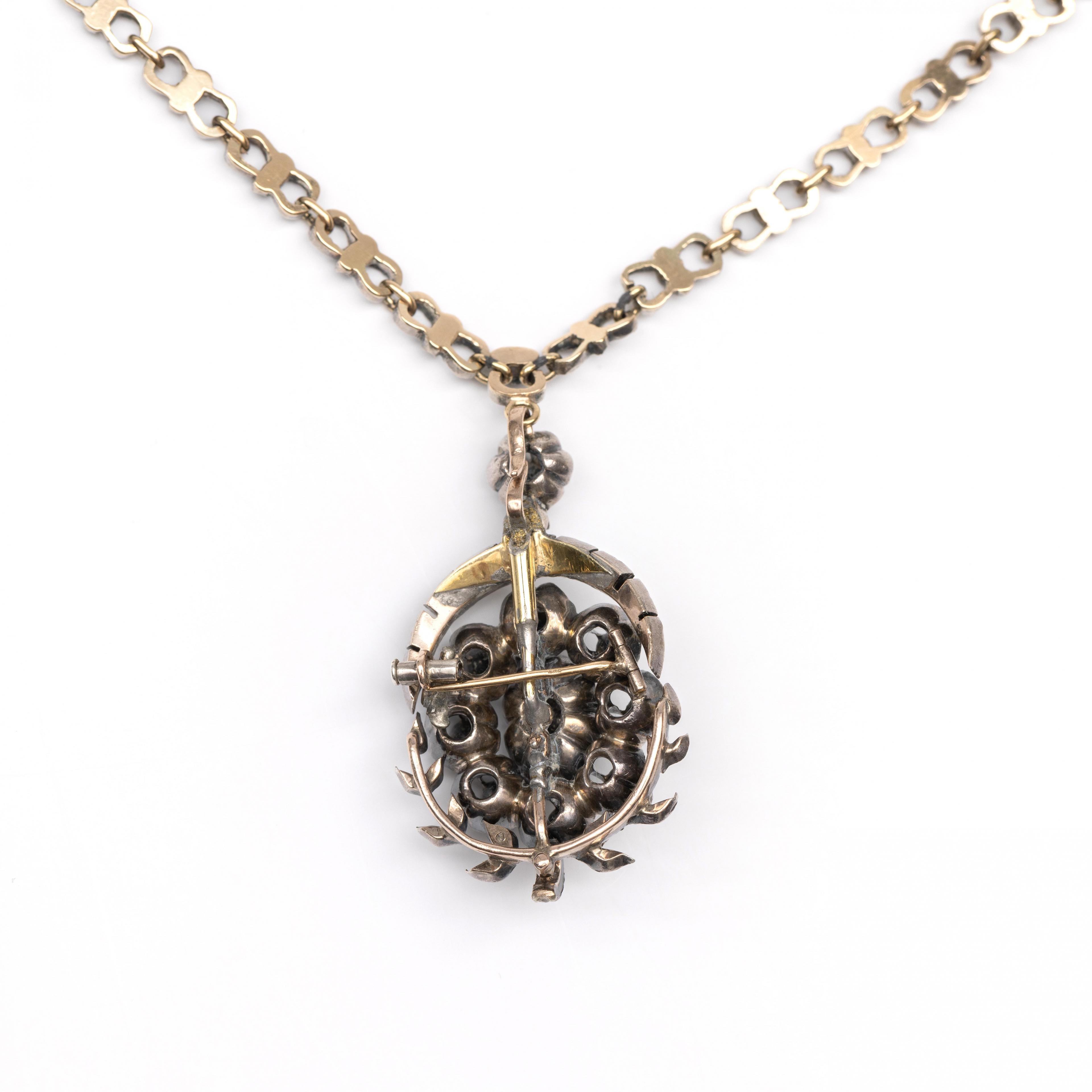14 k. gold and silver necklace, composed of figure-eight links, each set with a small rose-cut diamond. Attached to this is a removable pendant, also a brooch, consisting of a rosette beneath a garland, set with a rose-cut diamond (center stone approx. 5.4 x 5 mm).