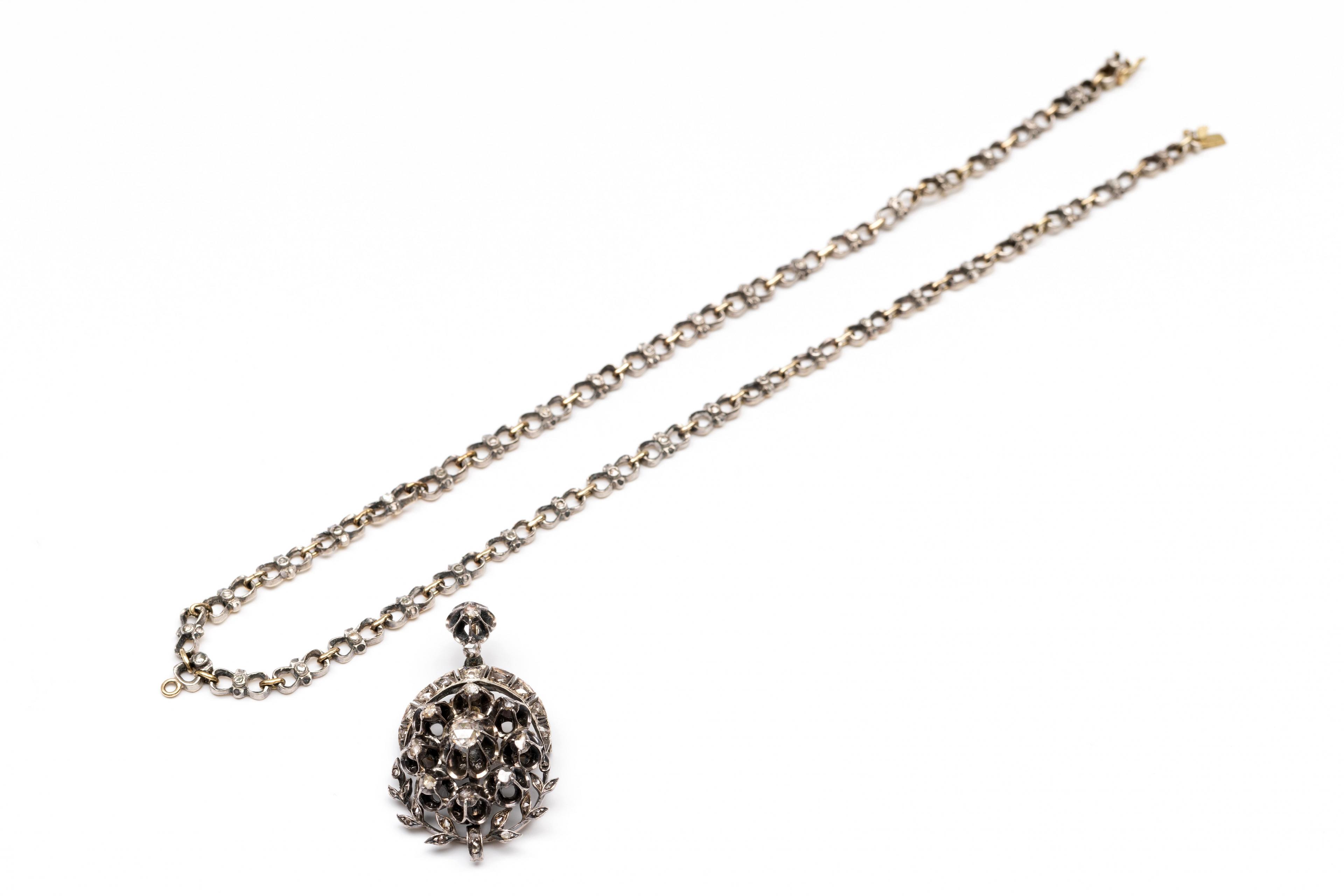 opgebouwd uit 8-vormige schakels, elk bezet met een kleine roosgeslepen diamant. Hieraan een demontabele hanger, tevens broche, bestaande uit een rozet waaronder een guirlande, bezet me roosgeslepen diamant (centrale steen ca. 5,4 x 5 mm)