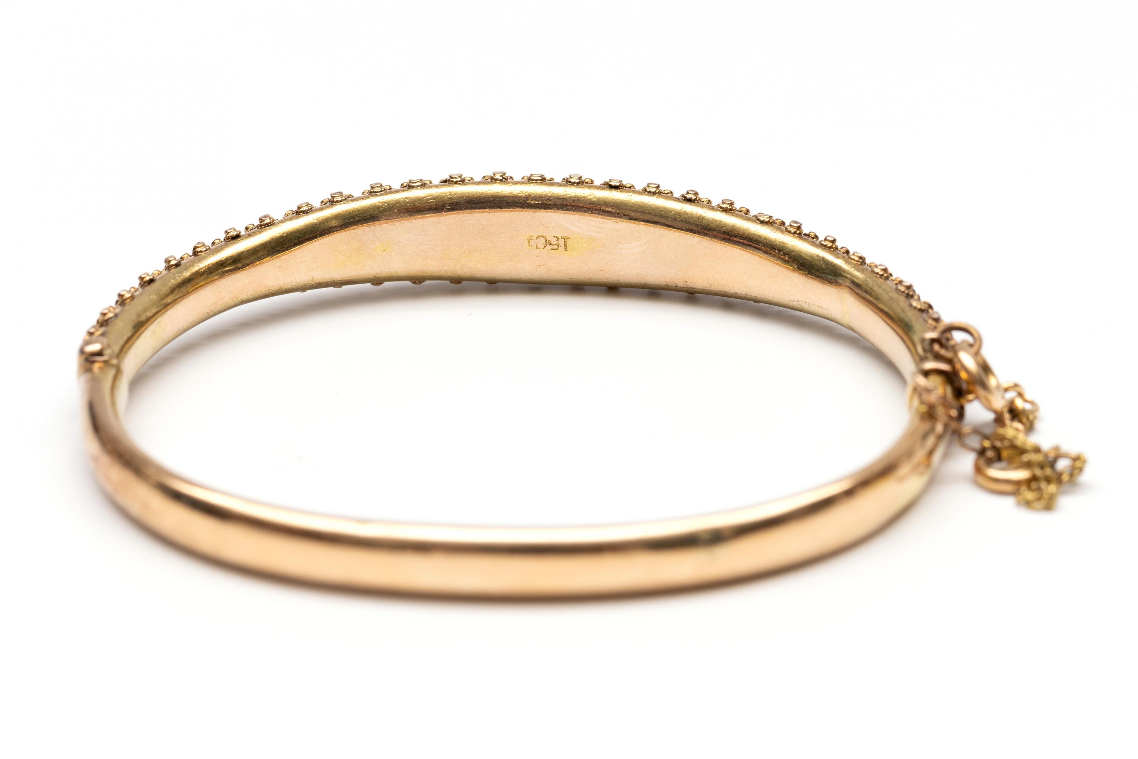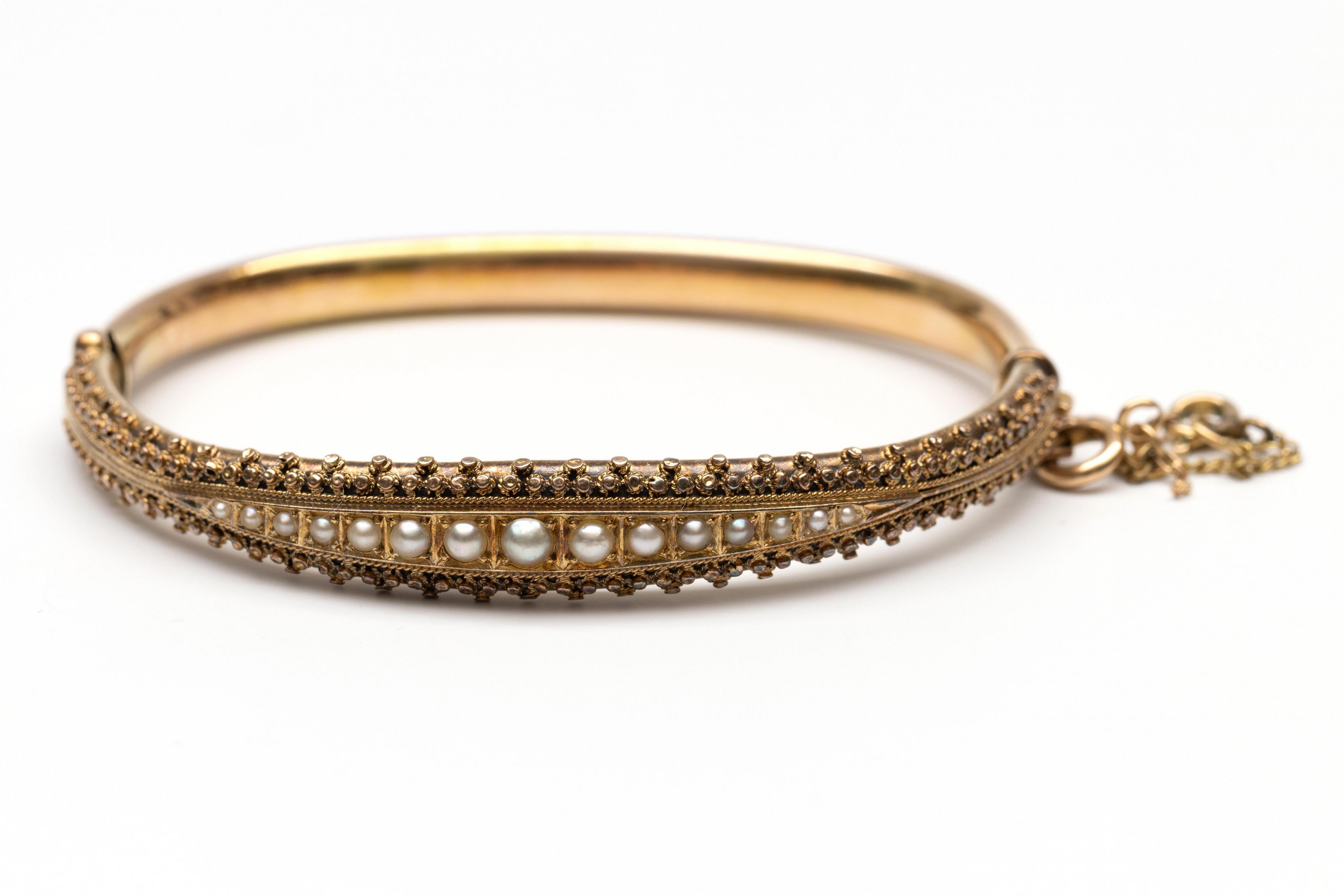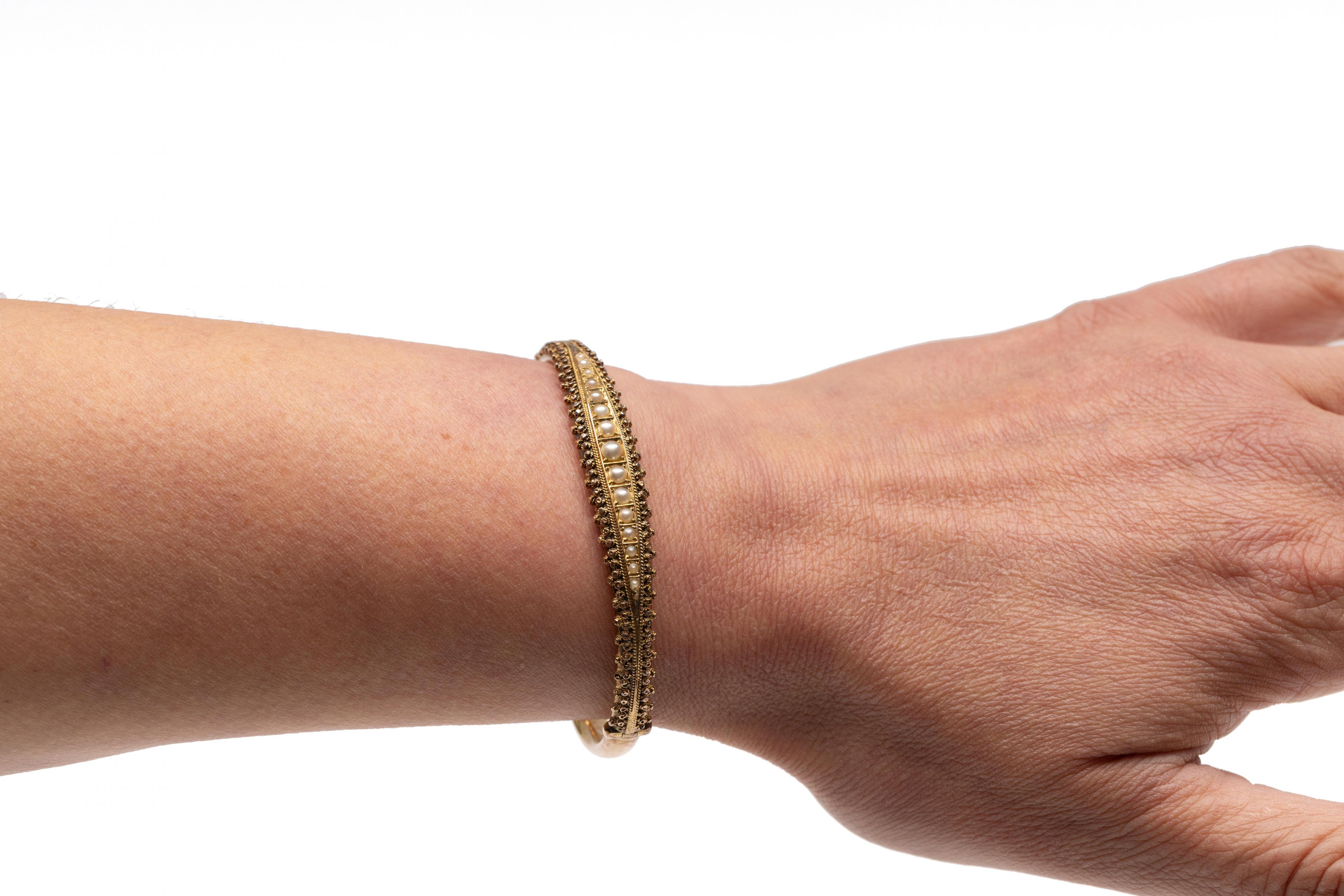 14 k. Gold rigid bracelet, 19th century. The top set with gold pearls decreasing in size from the center, along which a decoration of twisted wire and granules.