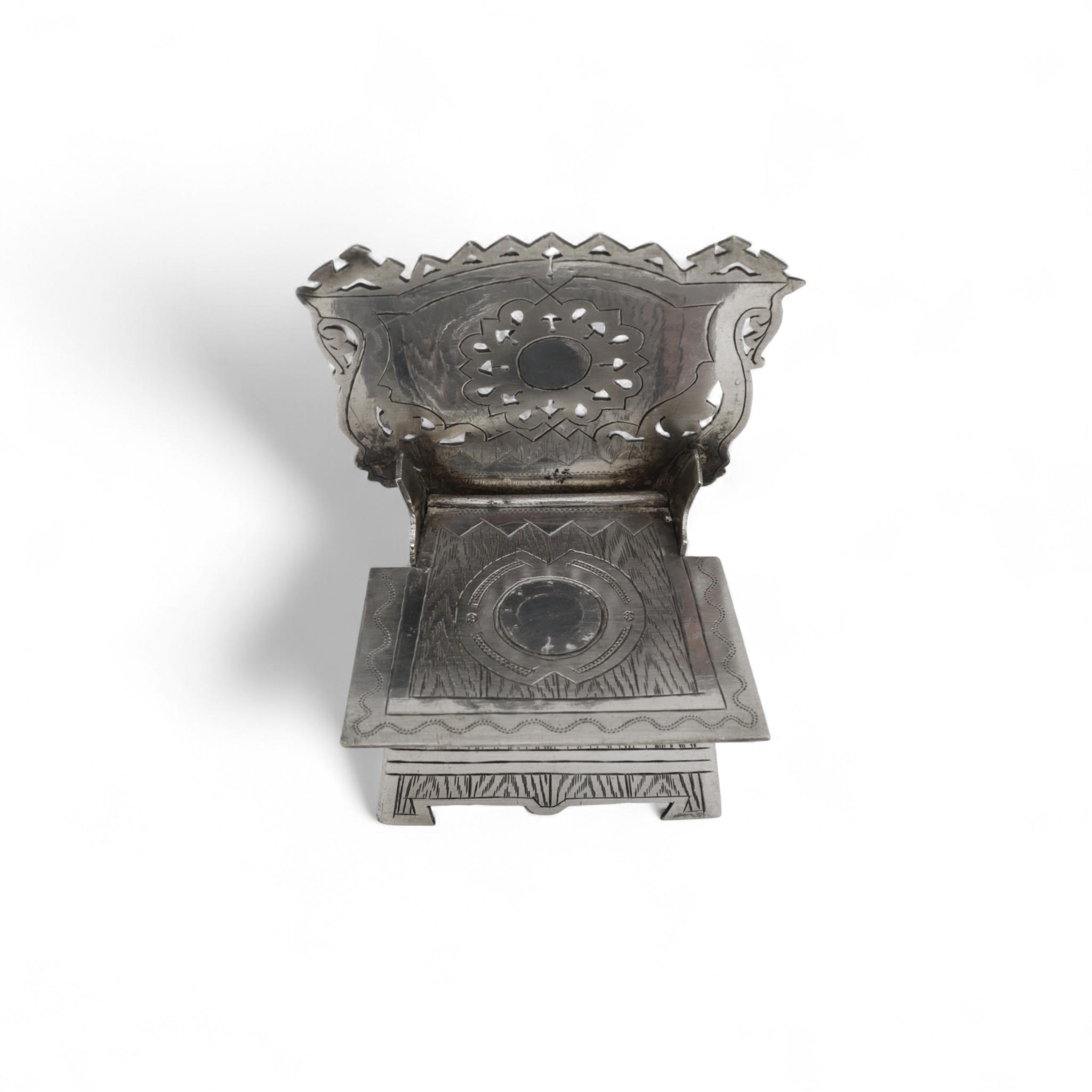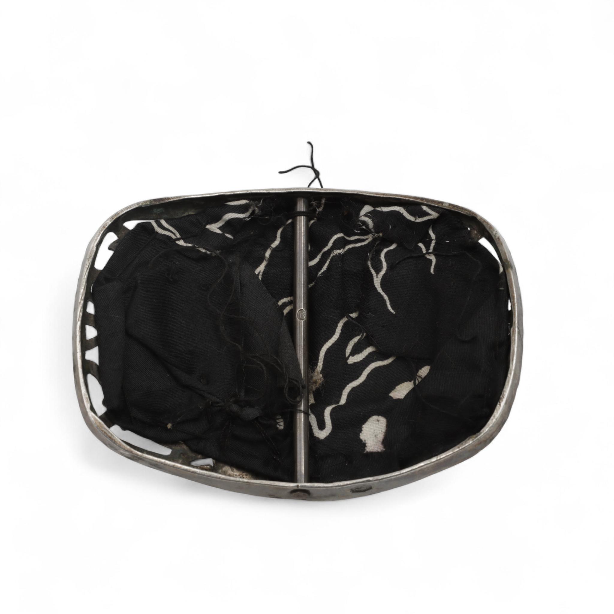 zetel versierd en met scharnierende klepje, gemerkt onduidelijk, gesp, ajour met bloemmotieven versierd, met meesterteken niet geïdentificeerd, 2e gehalte,