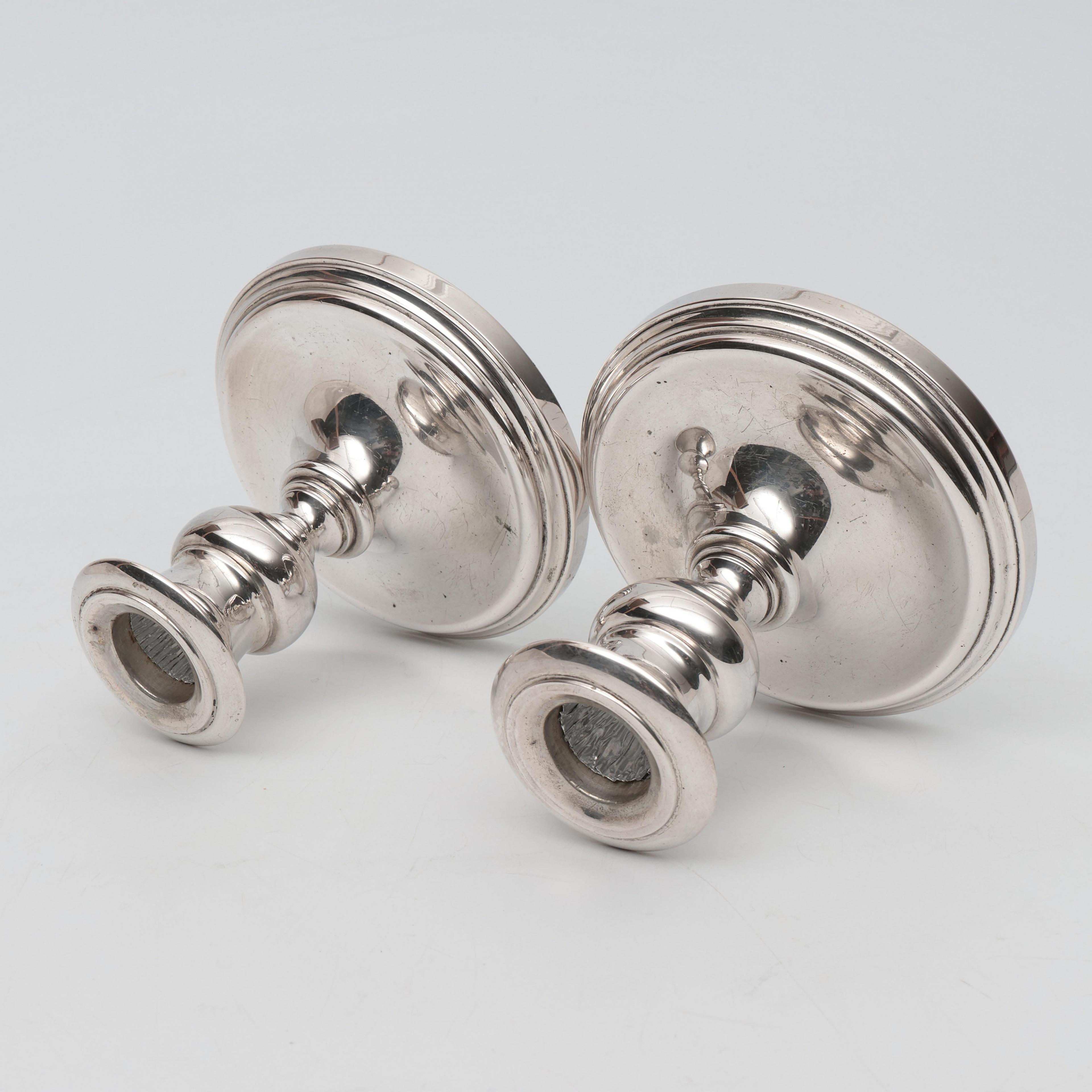 ronde kelkvormige kaarsenhouders met ronde geprofileerd voeten, gemerkt mt. Pampaloni Ermindo di Pampaloni Franco, Florence, vanaf 1902 en onduidelijk merk, vermoedelijk winkeliersteken, 3e gehalte,