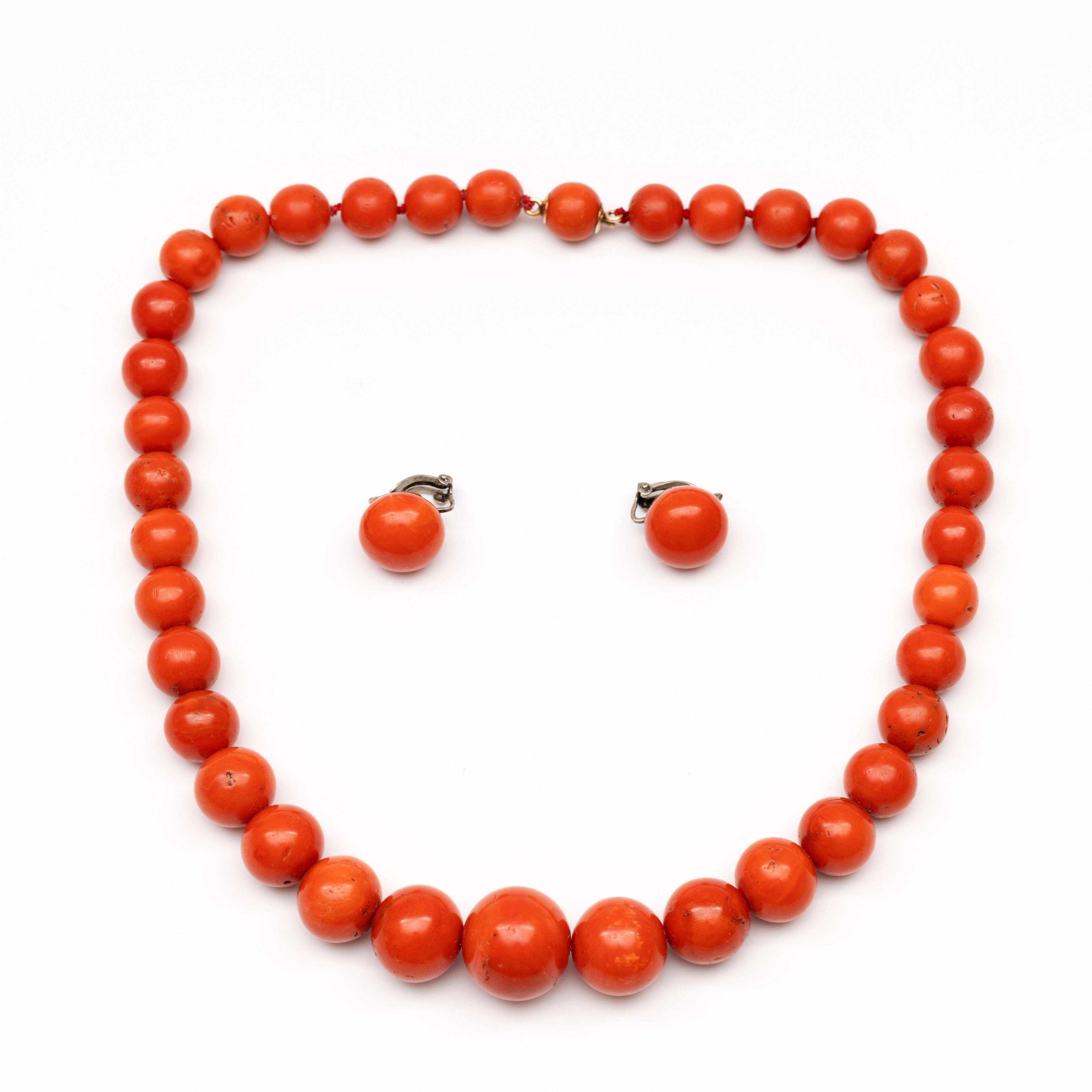 Necklace and chute of red coral. Made of round beads with a diameter of approximately 10-18.8 mm, the clasp of a coral bead. Herewith a pair of clip-on earrings with bouton-shaped coral.