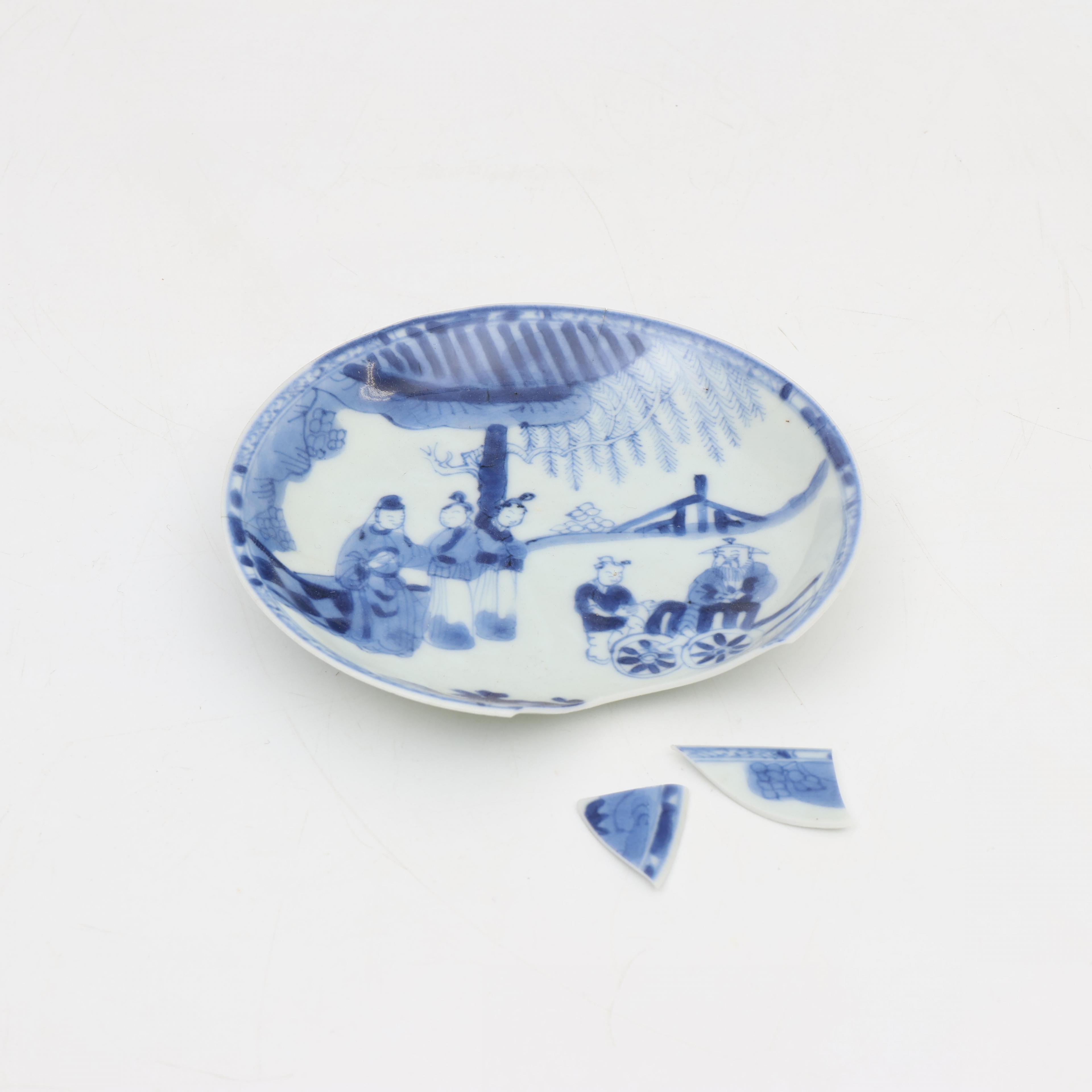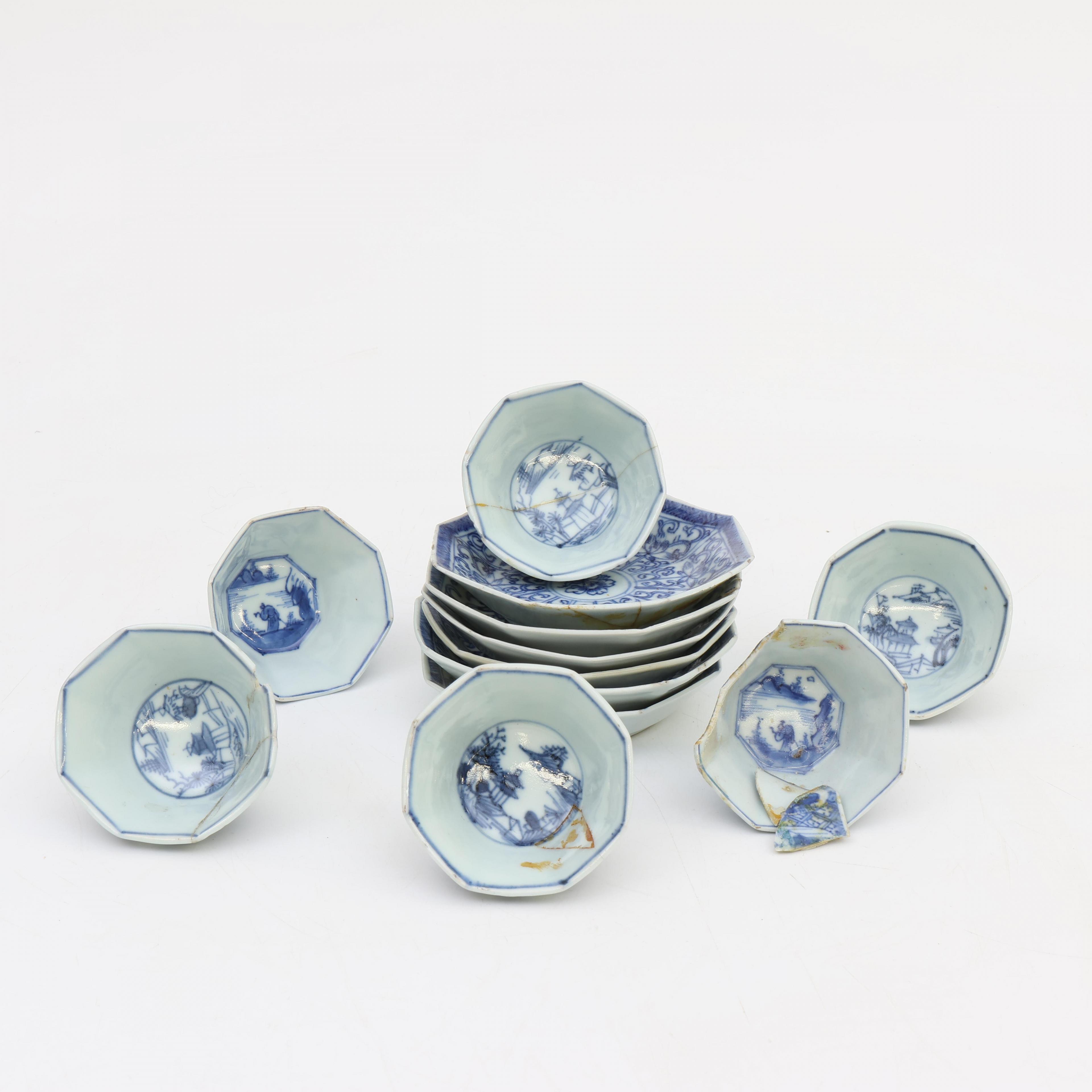 comprising a set of six and a set of four canted saucers, a set of four saucer with hatched pattered floral decoration, two saucers with figures and wheelchair, and twelve various cups (various damages and repairs)
