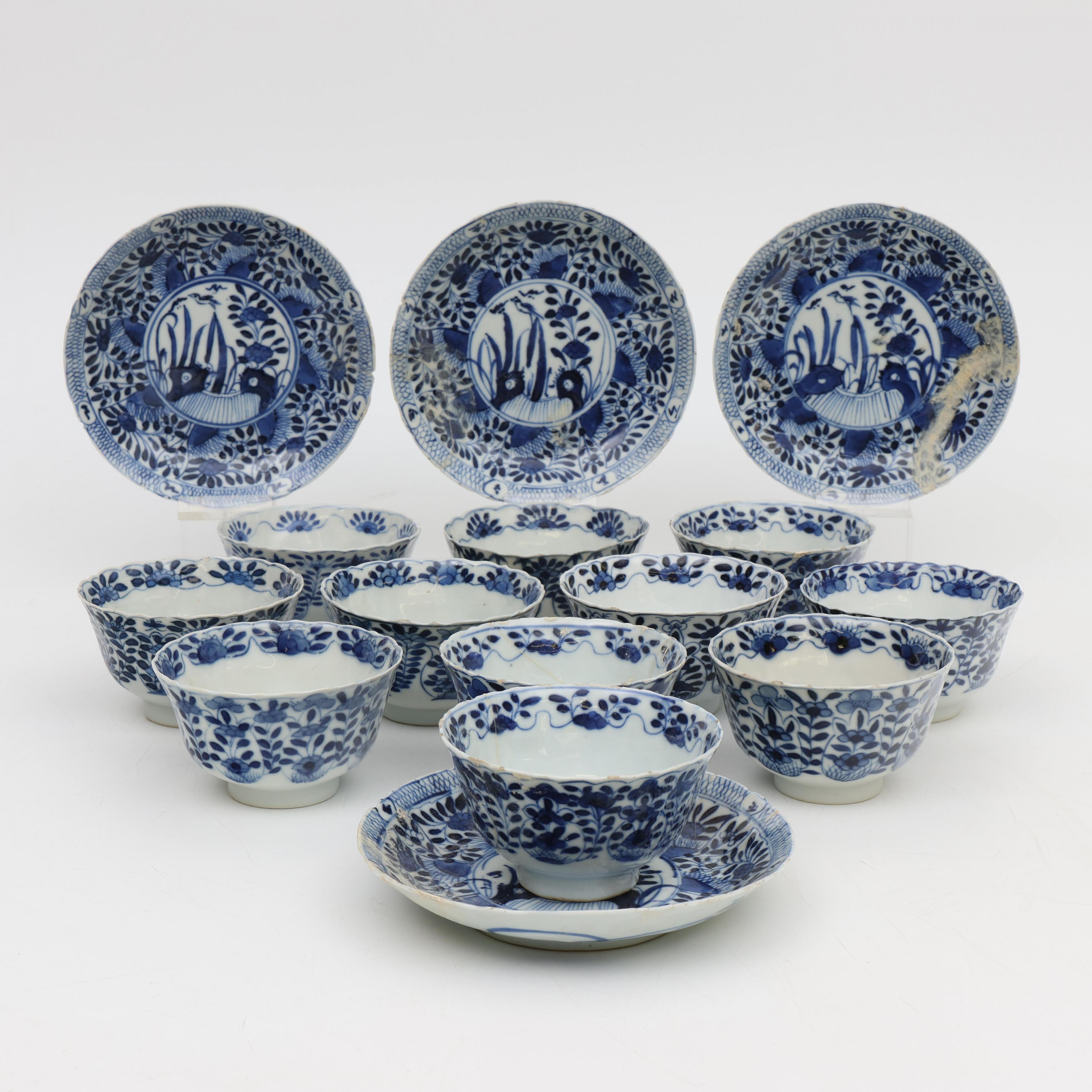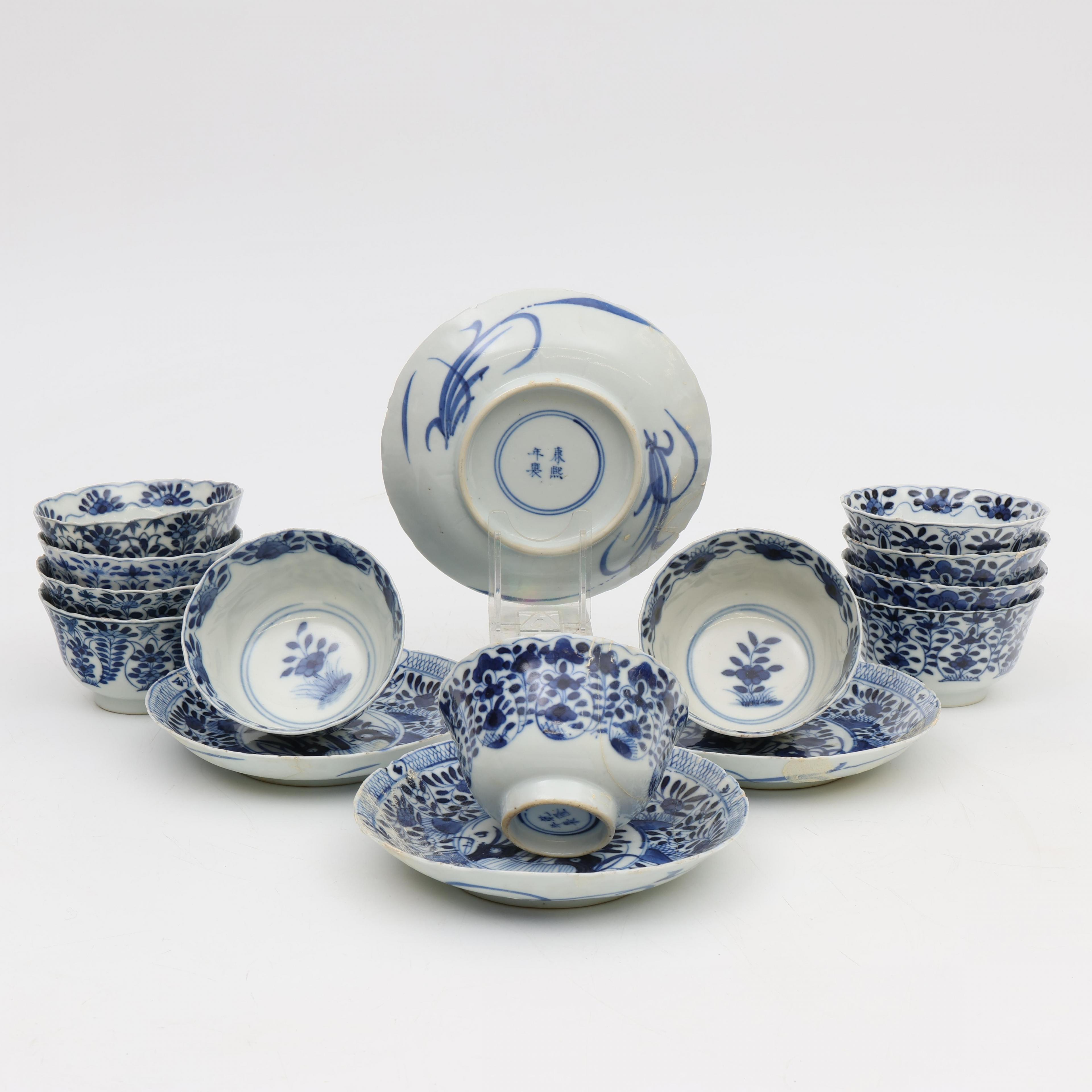 China, a set of eleven blue and white porcelain cups and four saucers, 19th century,