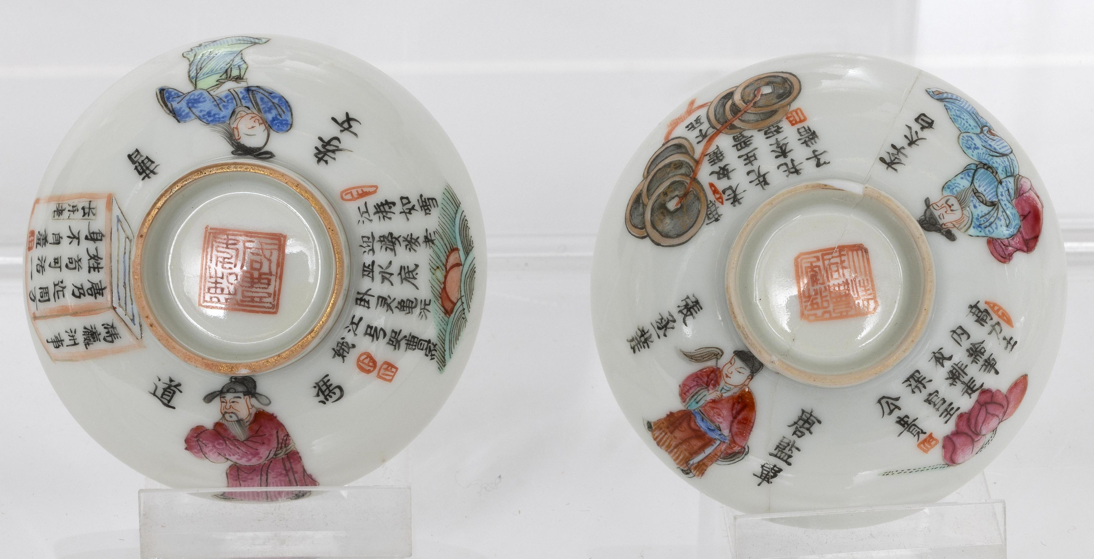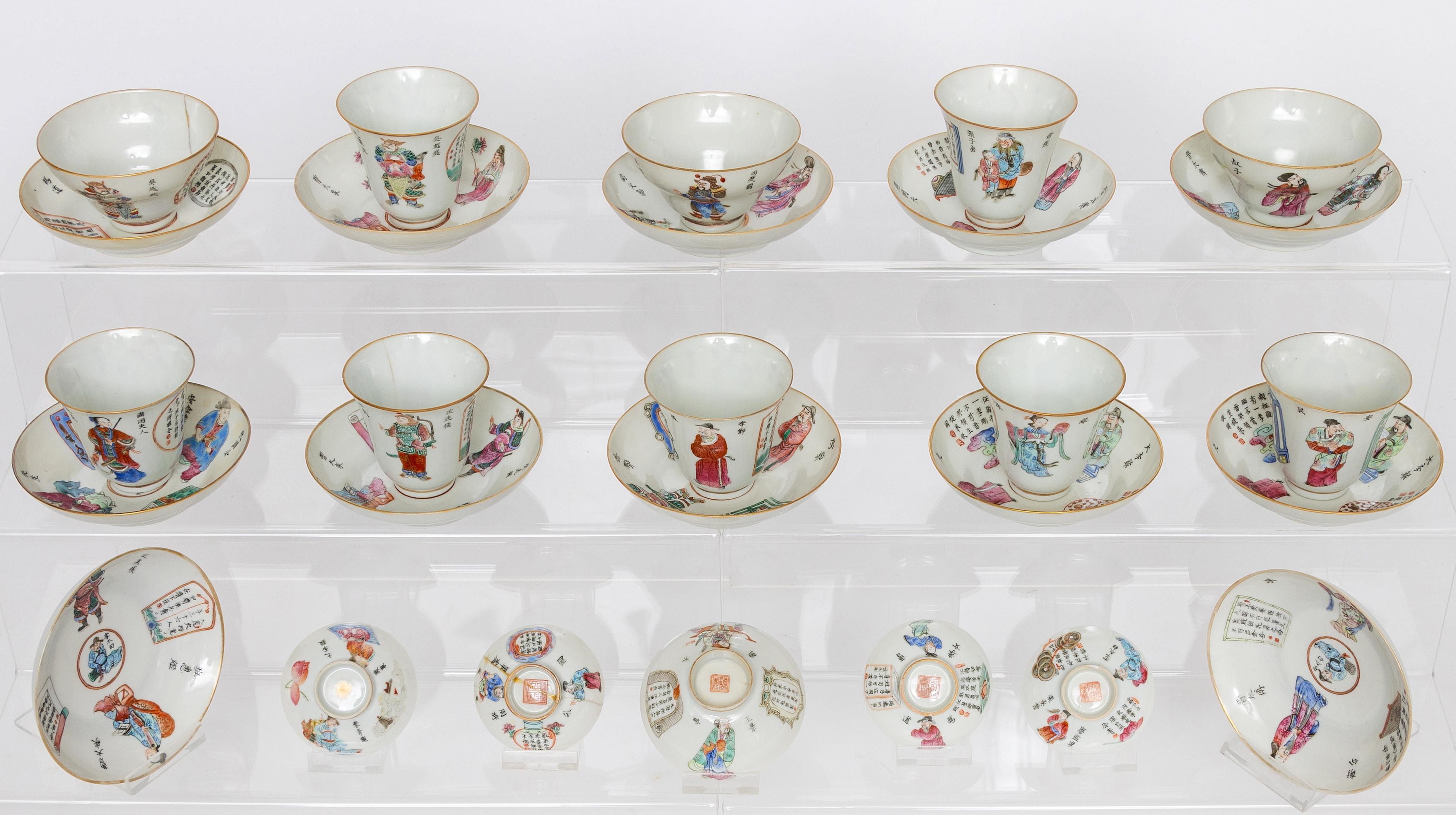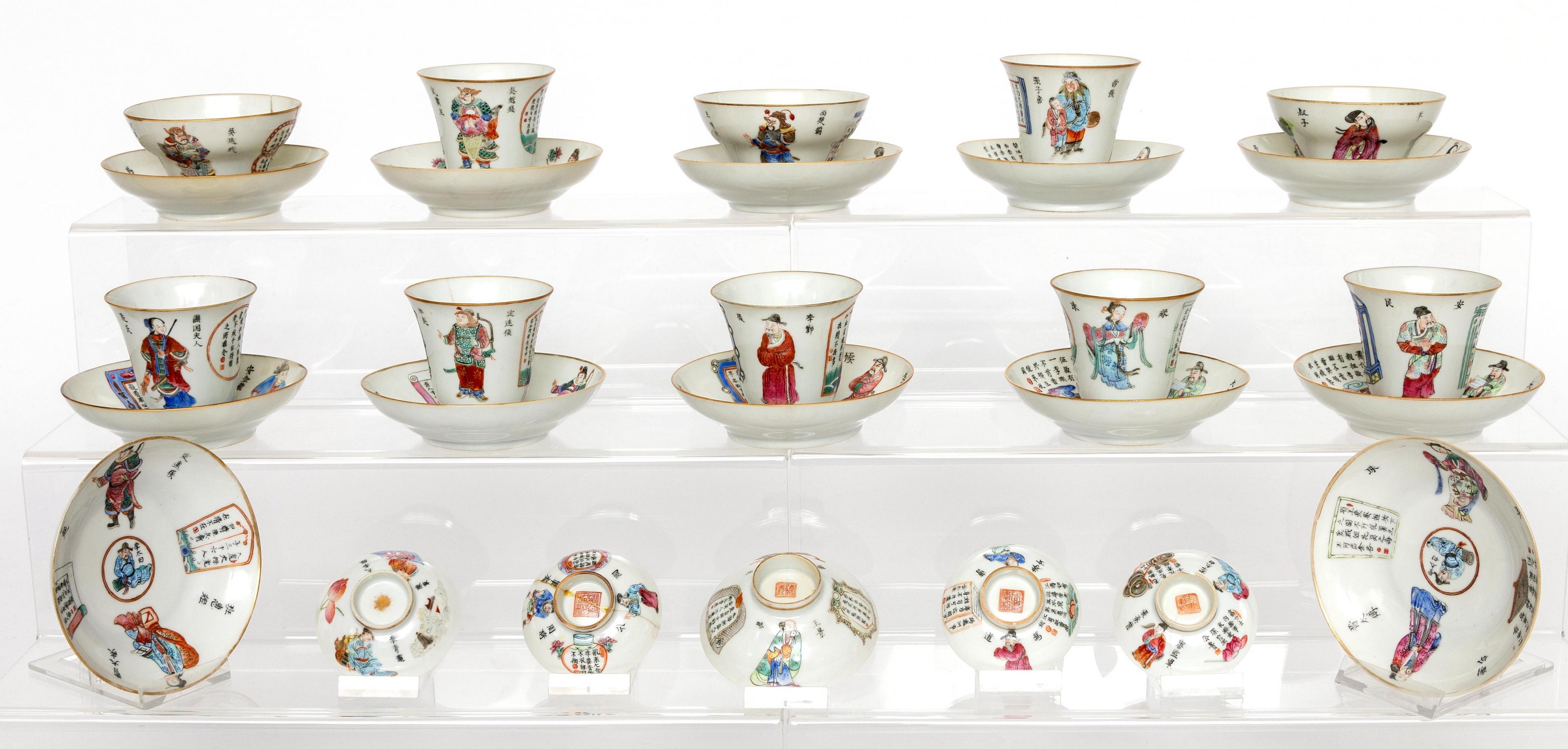 variously decorated with figures and calligraphies from 'The Book of Peerless Heroes', comprising three large bowls, seven tall cups, twelve saucers, four small covers and one large cover, various seal marks (some hairlines, chips and damages)