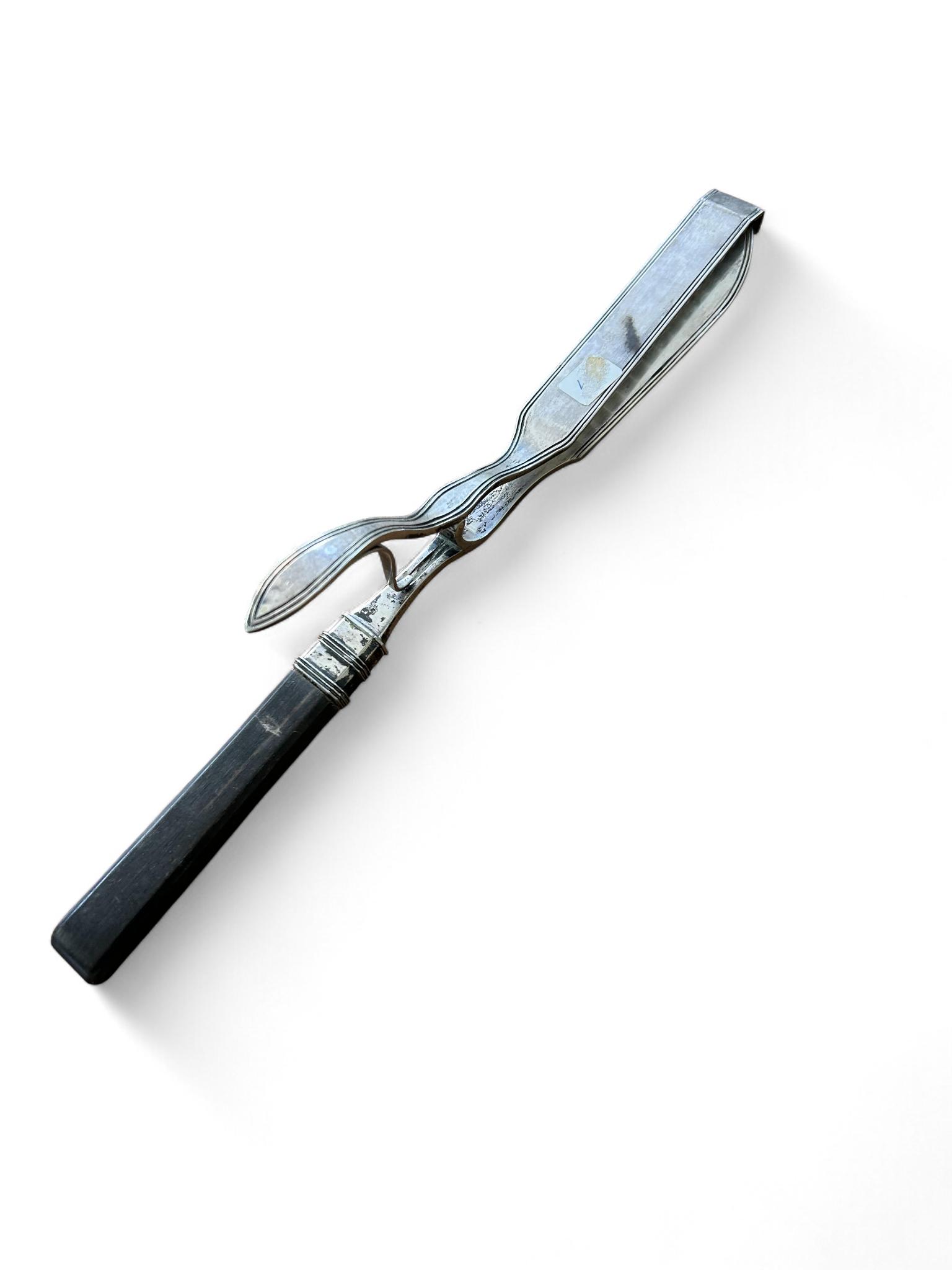 lange slanke tang met bandversiering en hoornen greep, gemerkt 800/000, 3e gehalte,