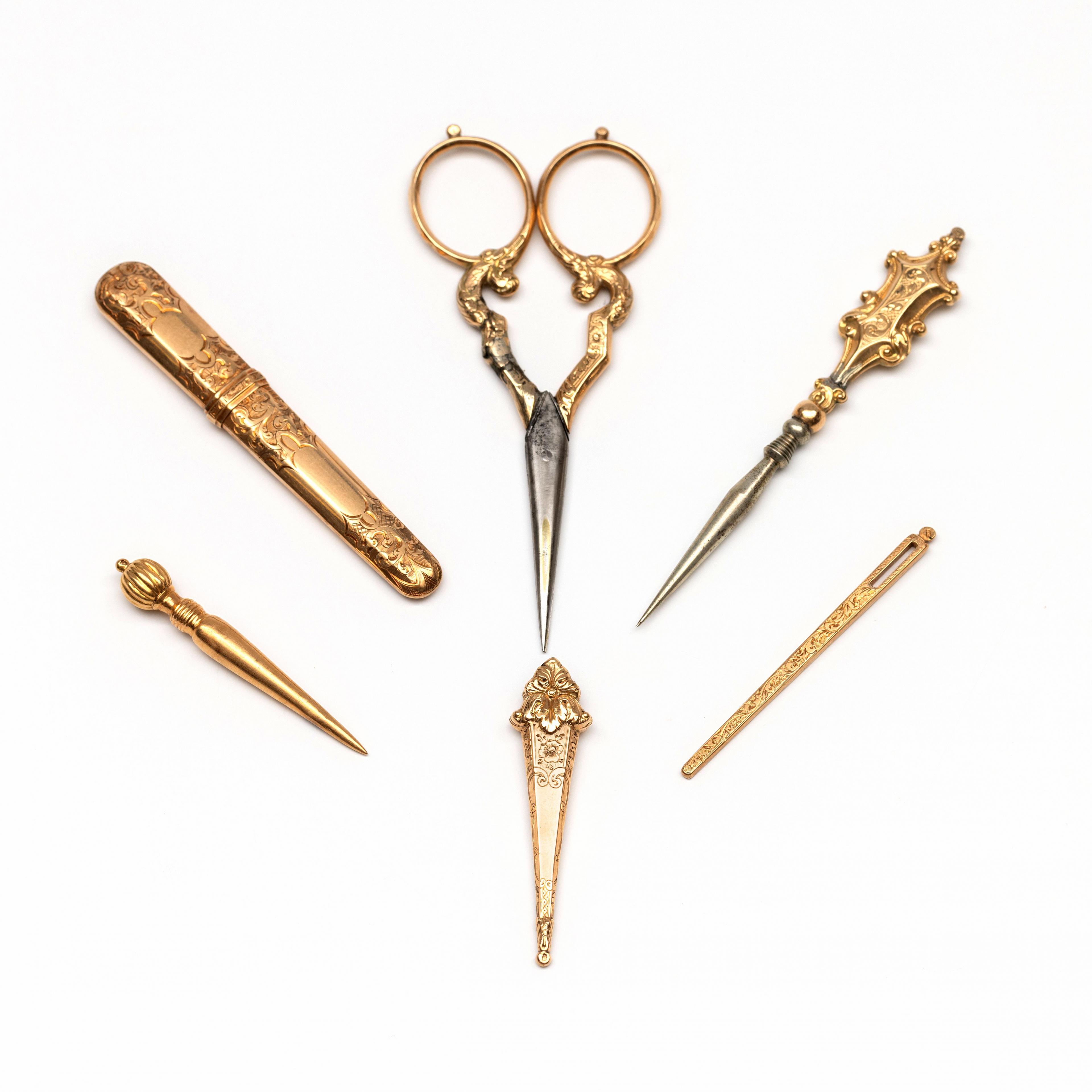 Bestaande uit een naaldenkoker, schaartje, naald en priem. Hierbij een tweede 18 kt. gouden priem, niet bij de set horend.