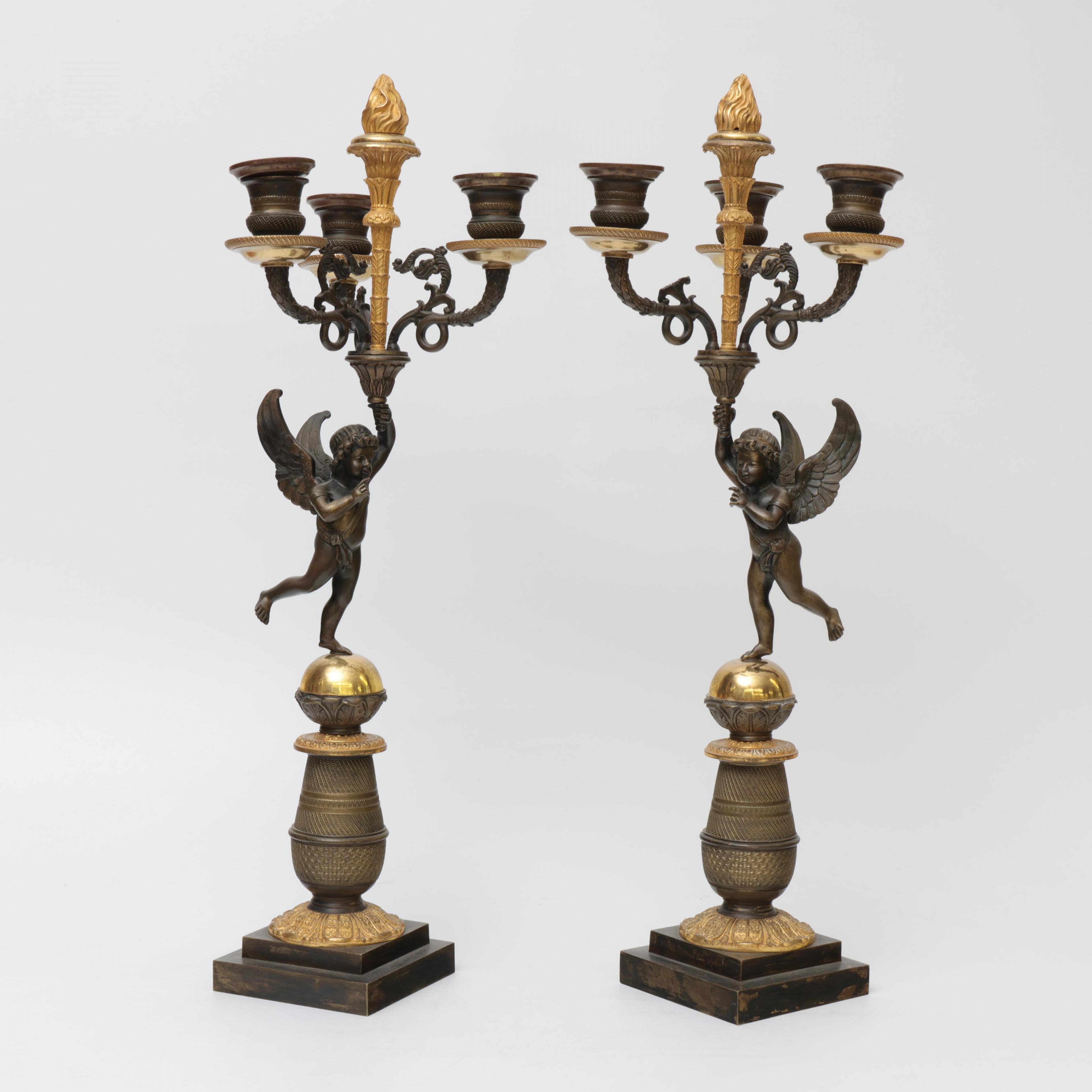 Frankrijk, paar bruin gepatineerde en vuurvergulde drielichts kandelaars, Charles X, 19e eeuw;