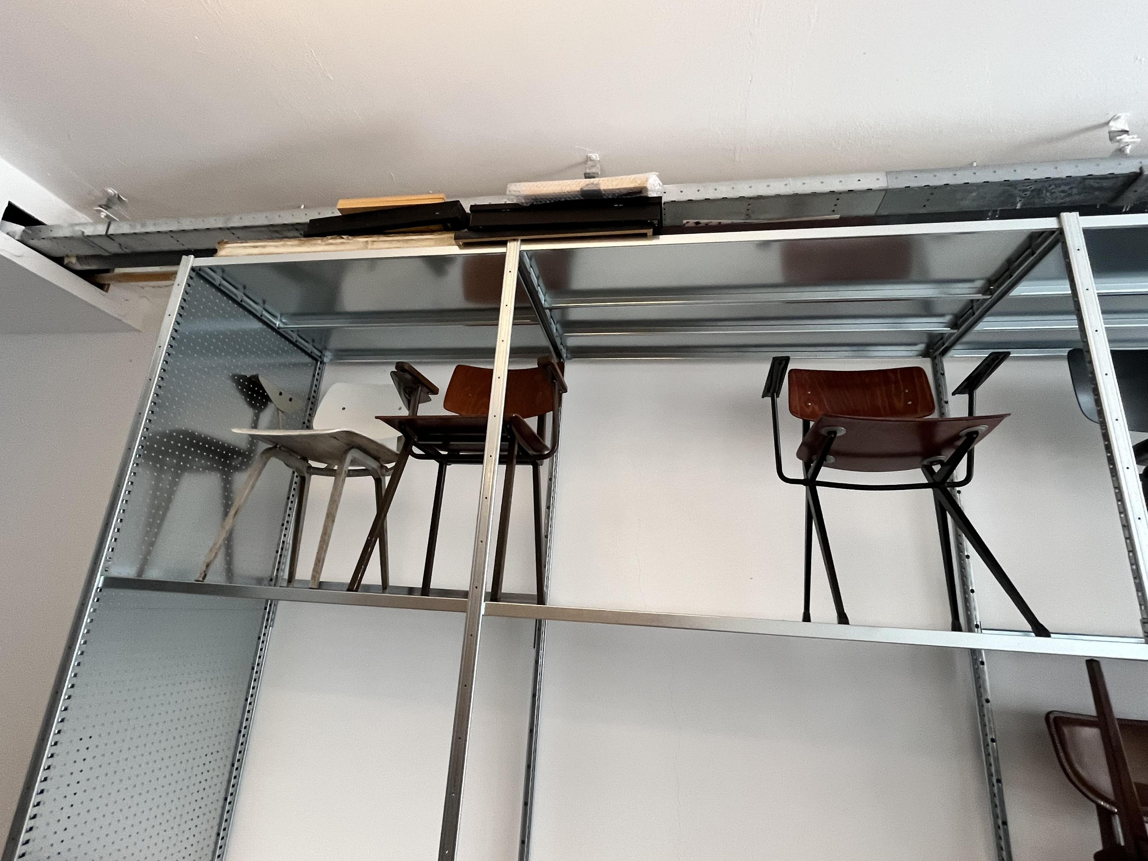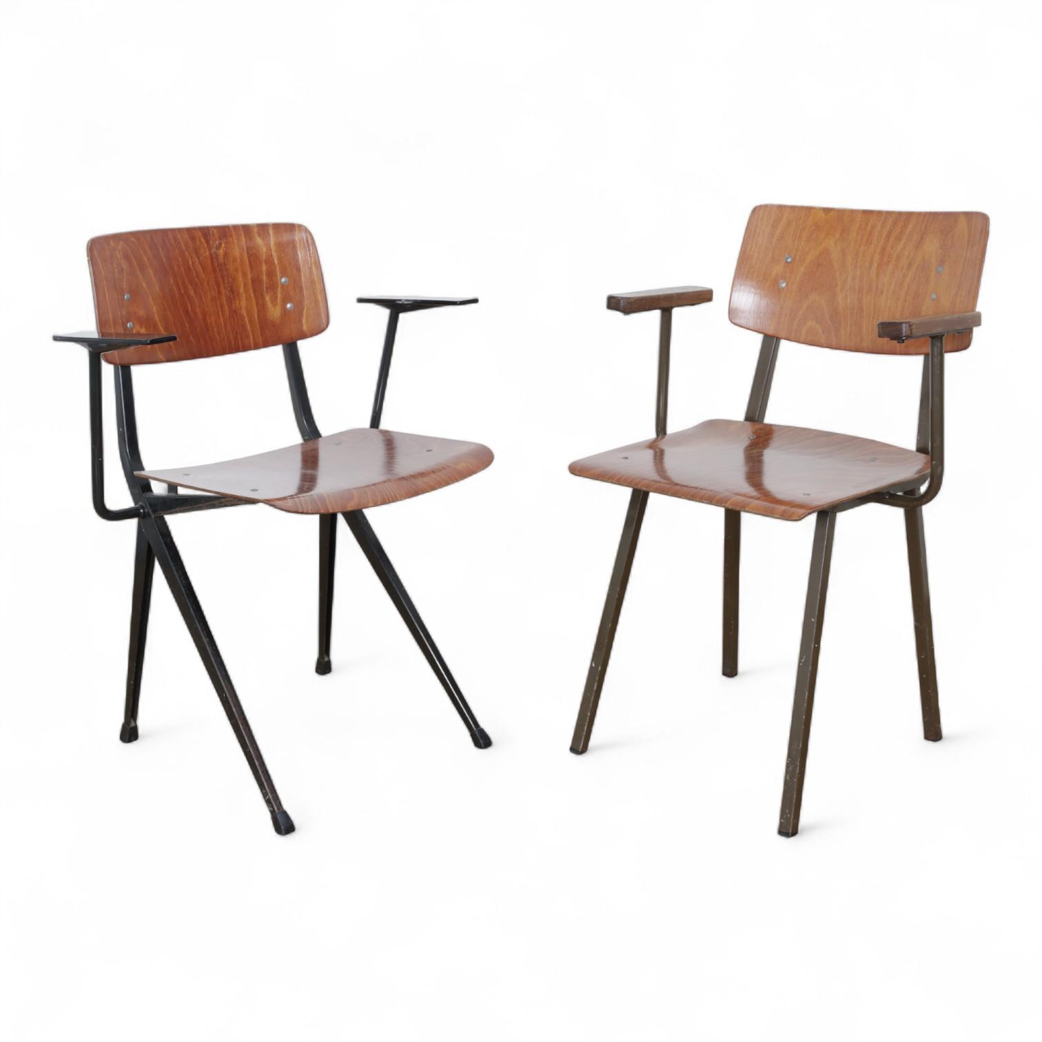 Marko, zwart gelakt stalen 'S201' schoolstoel en Eromes, bruin gelakt stalen 'OBO' schoolstoel,