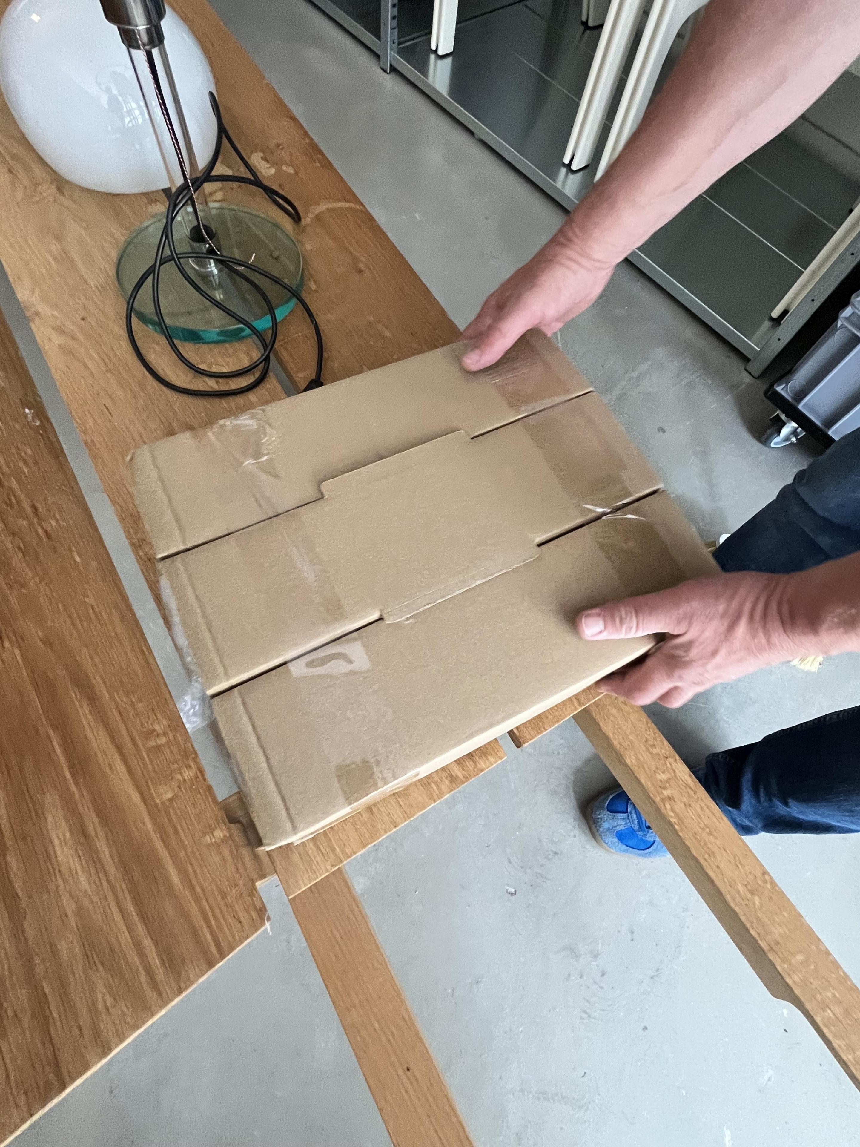 Op drie geribde voluutvormige glazen poten (beschadiging en chips)