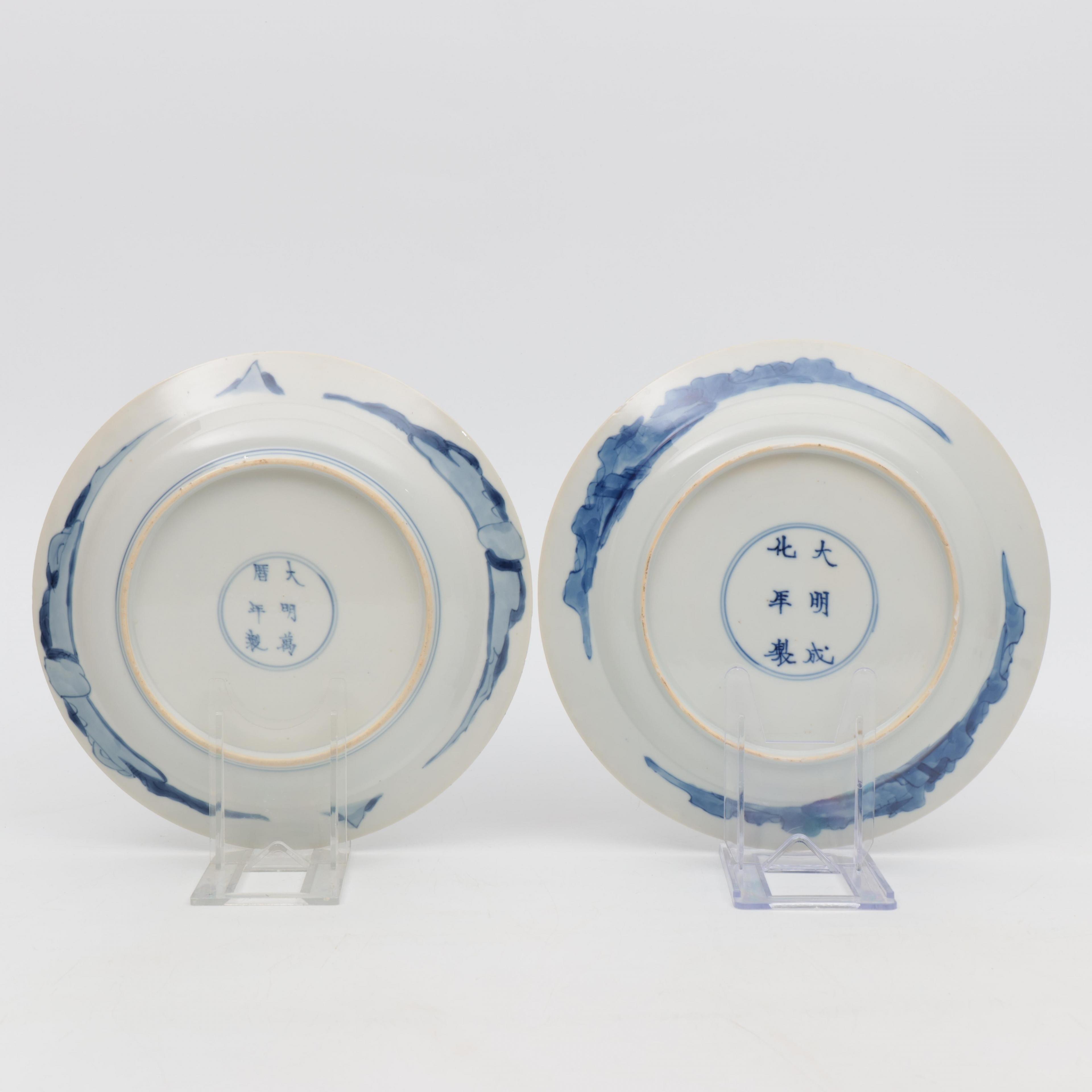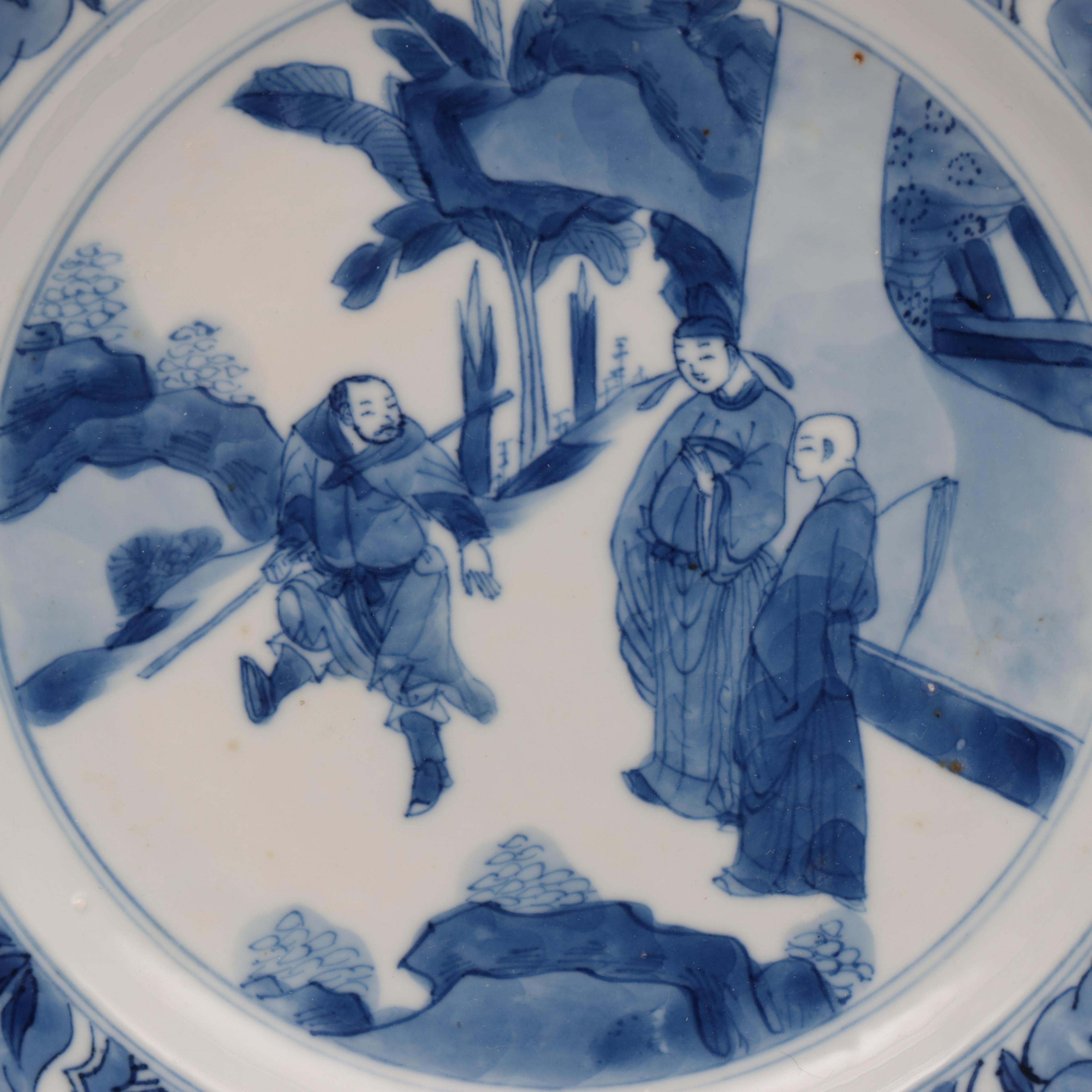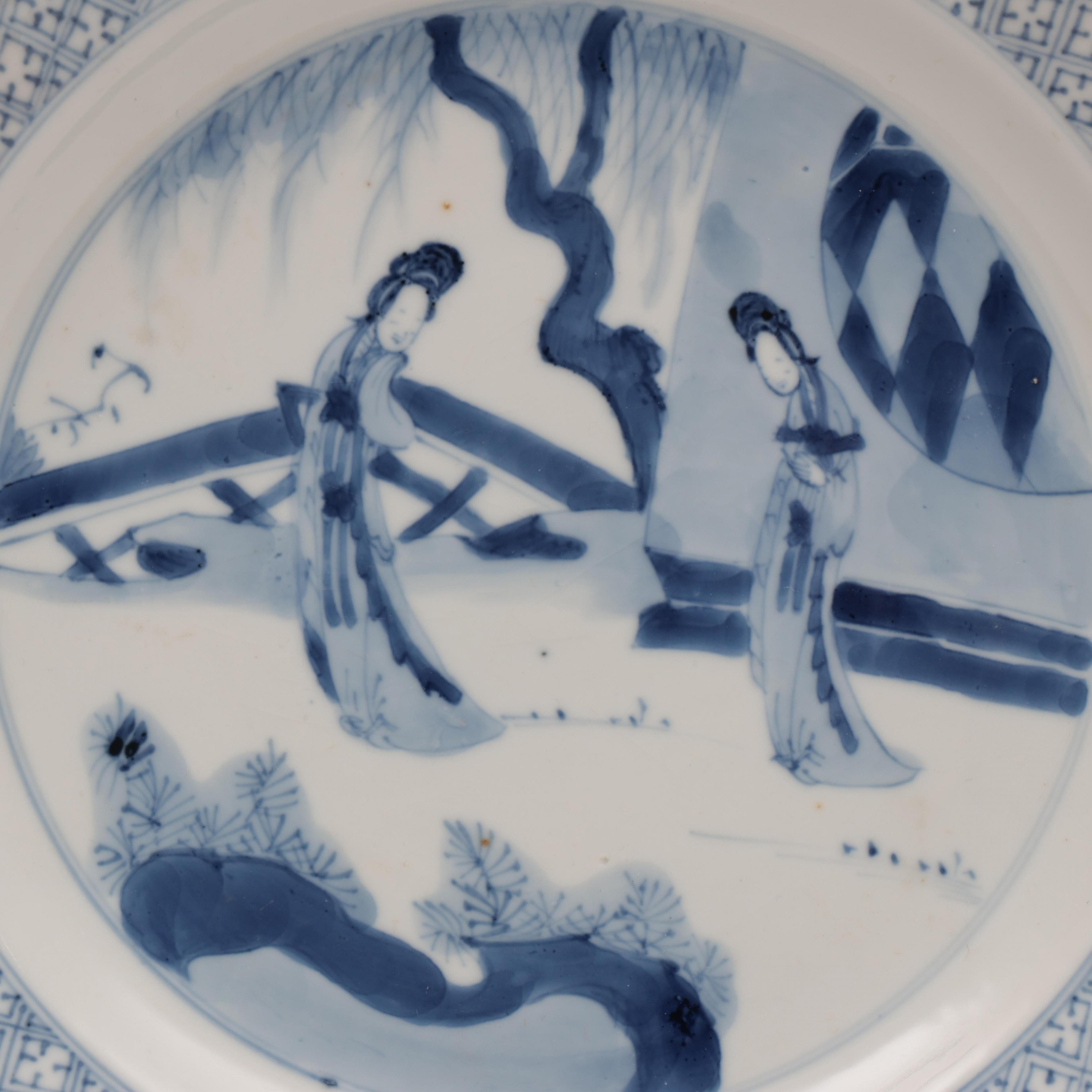 China, two blue and white porcelain figural plates, Kangxi period (1662-1722),