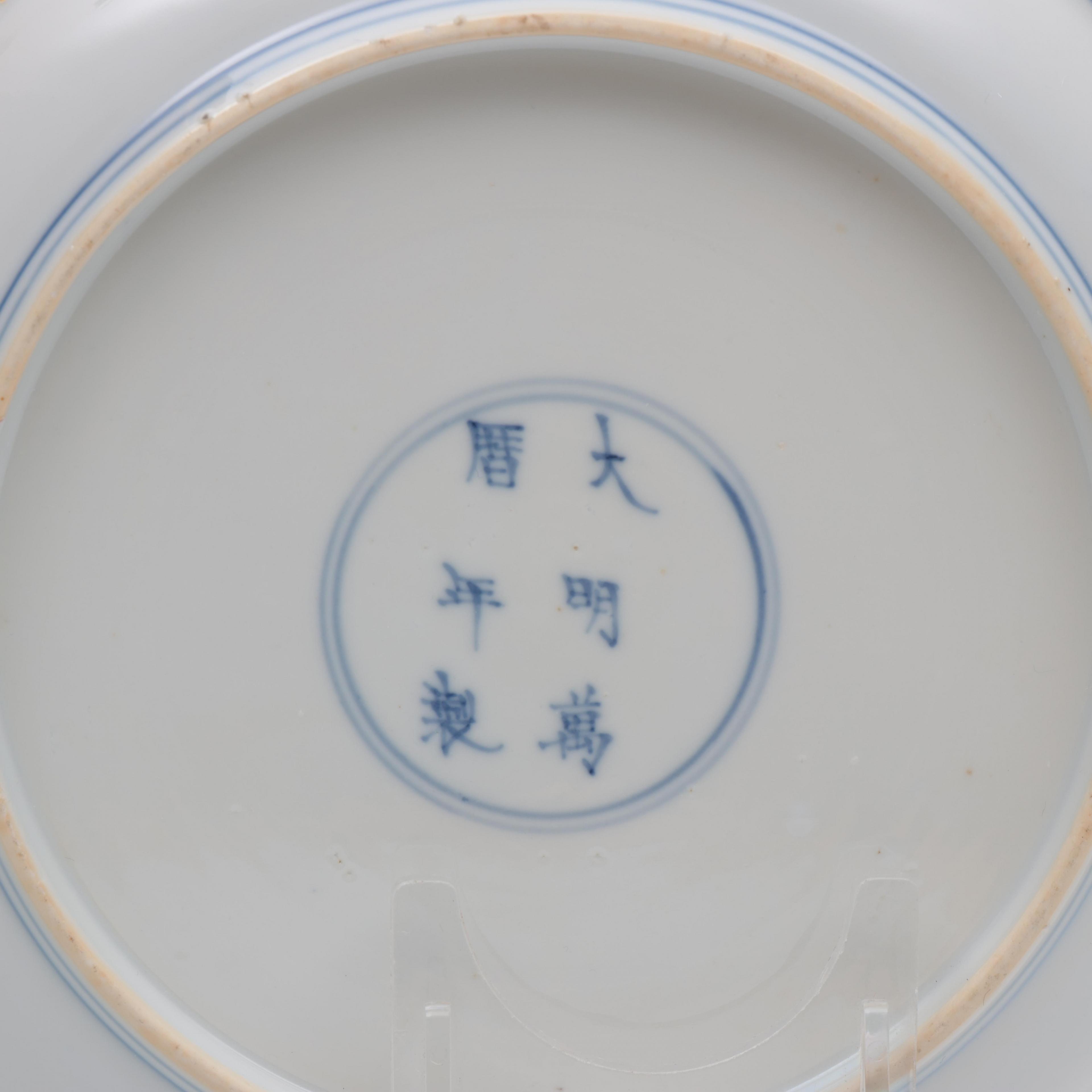 one painted with elegant ladies in a landscape, the base with an apocryphal Wanli mark, the other with a soldier and two monks, the base with an apocryphal Chenghua mark (each with small frits)