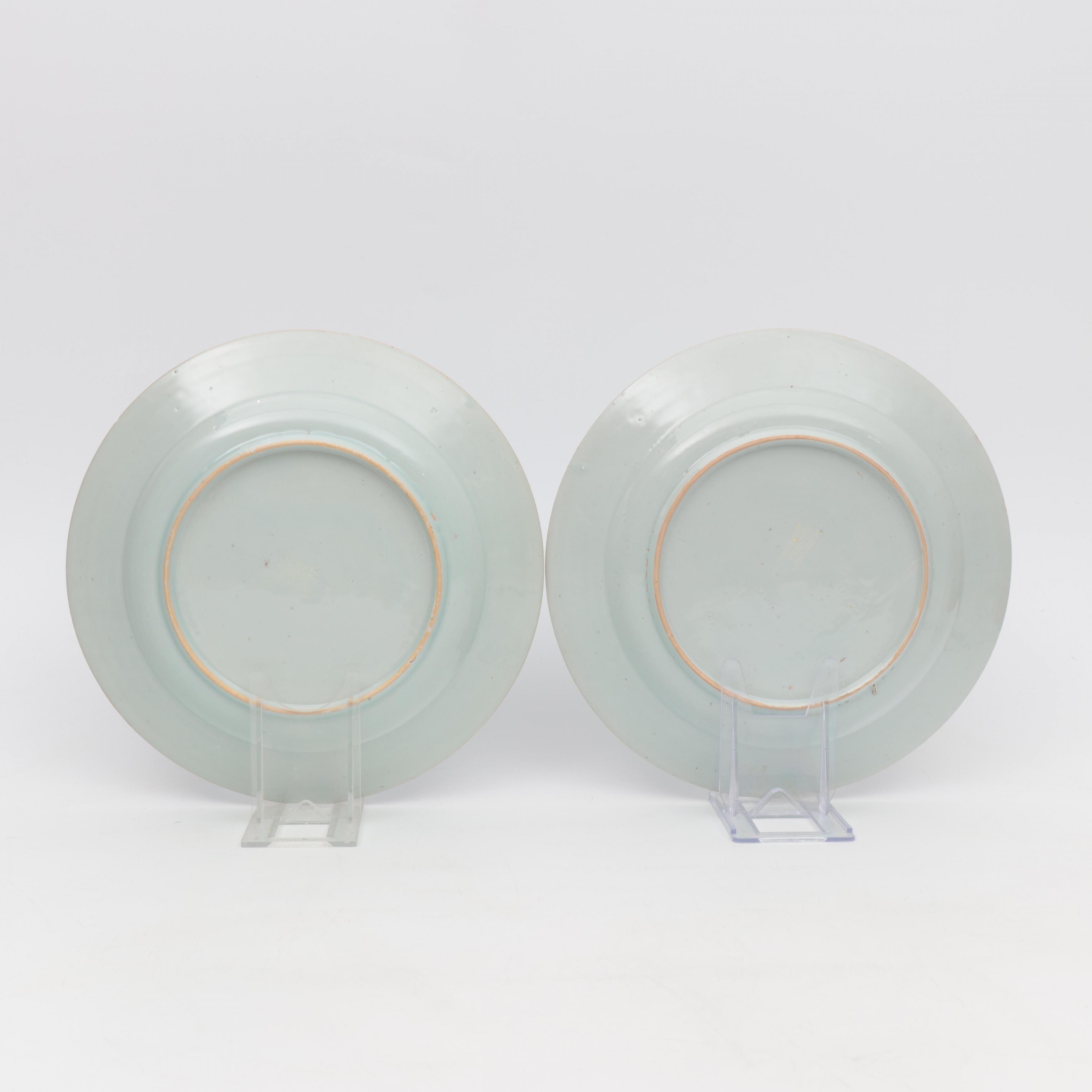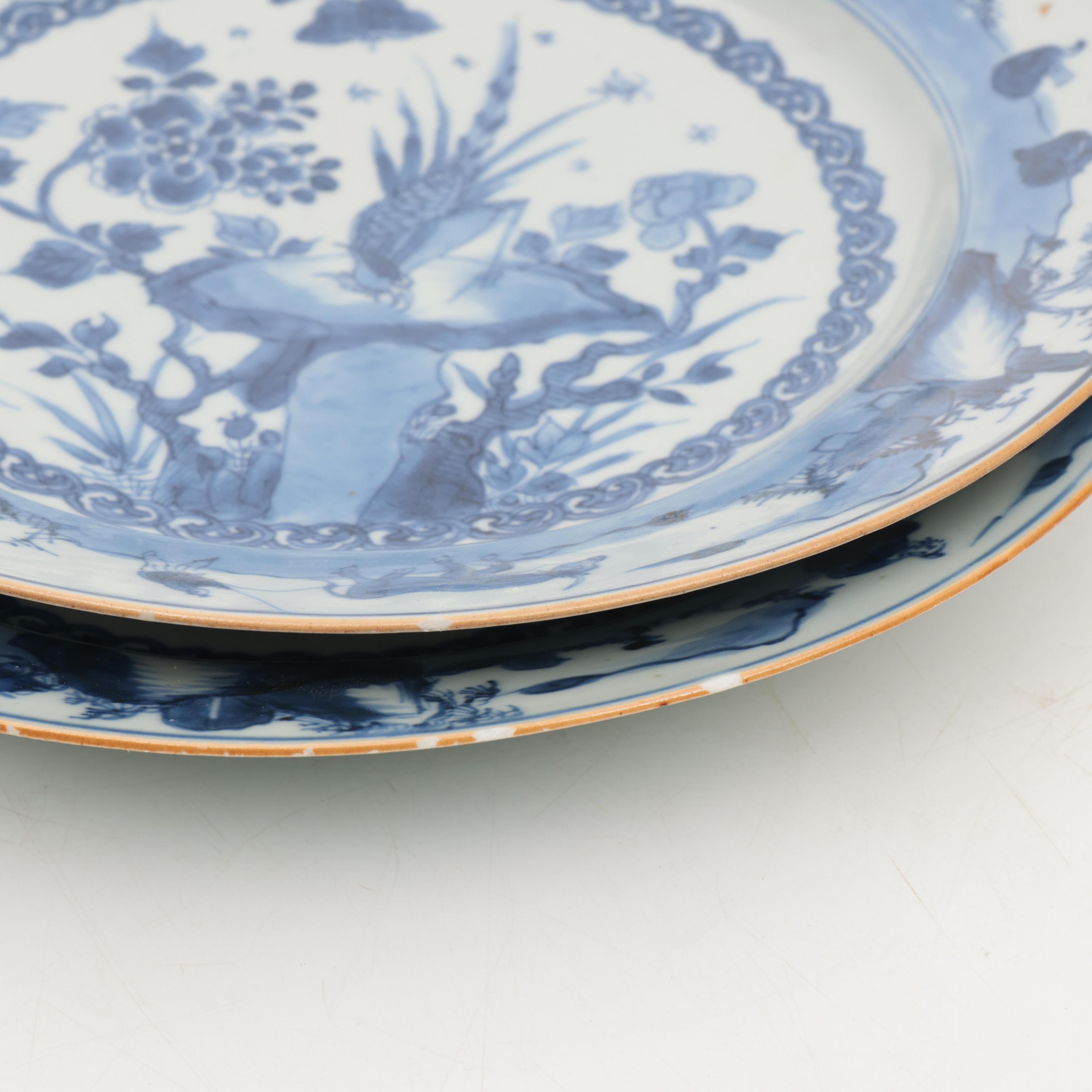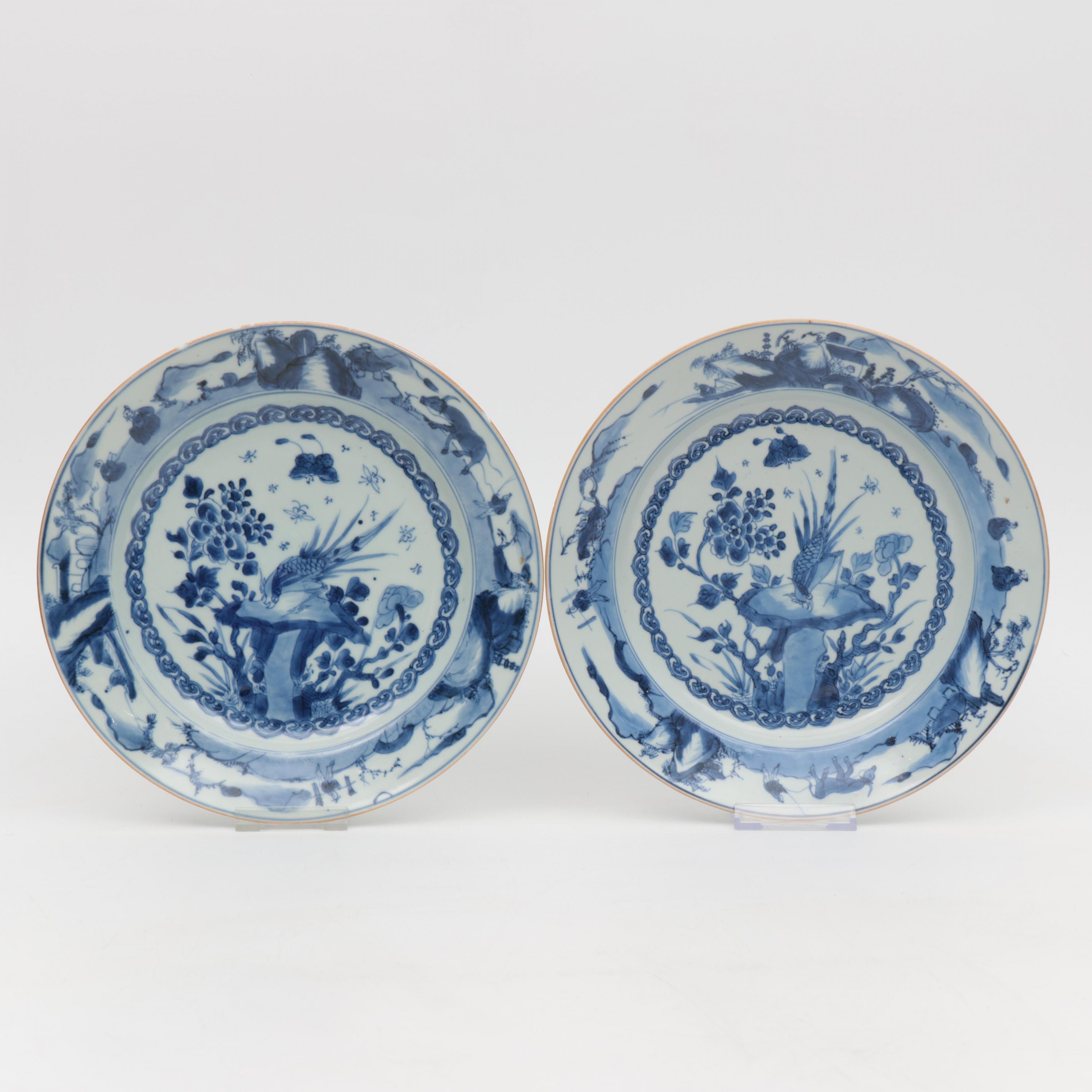 each painted with a pheasant perched on rockwork, the rim with figures in a landscape