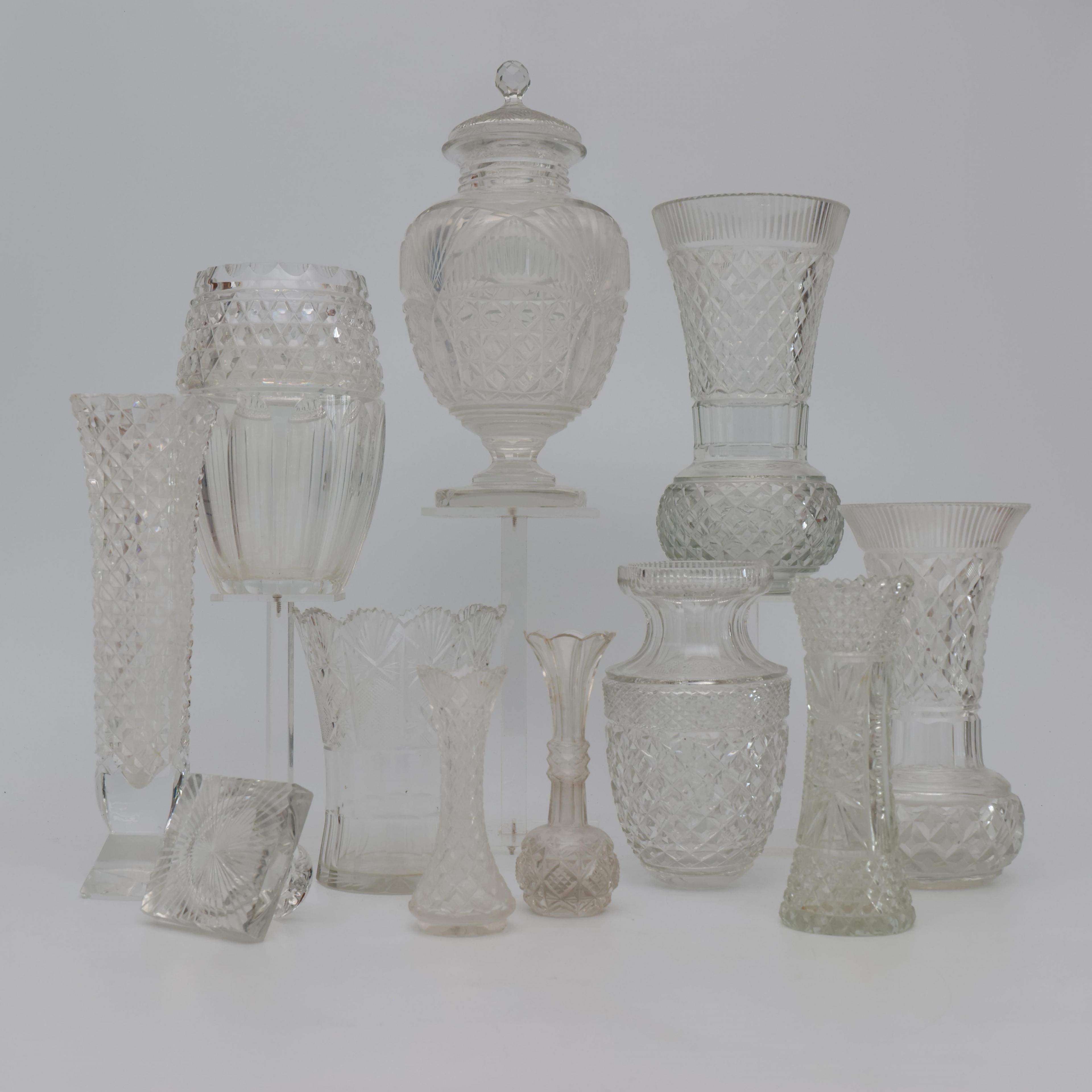 Tien diverse kristal geslepen bloemvazen, circa 1900;